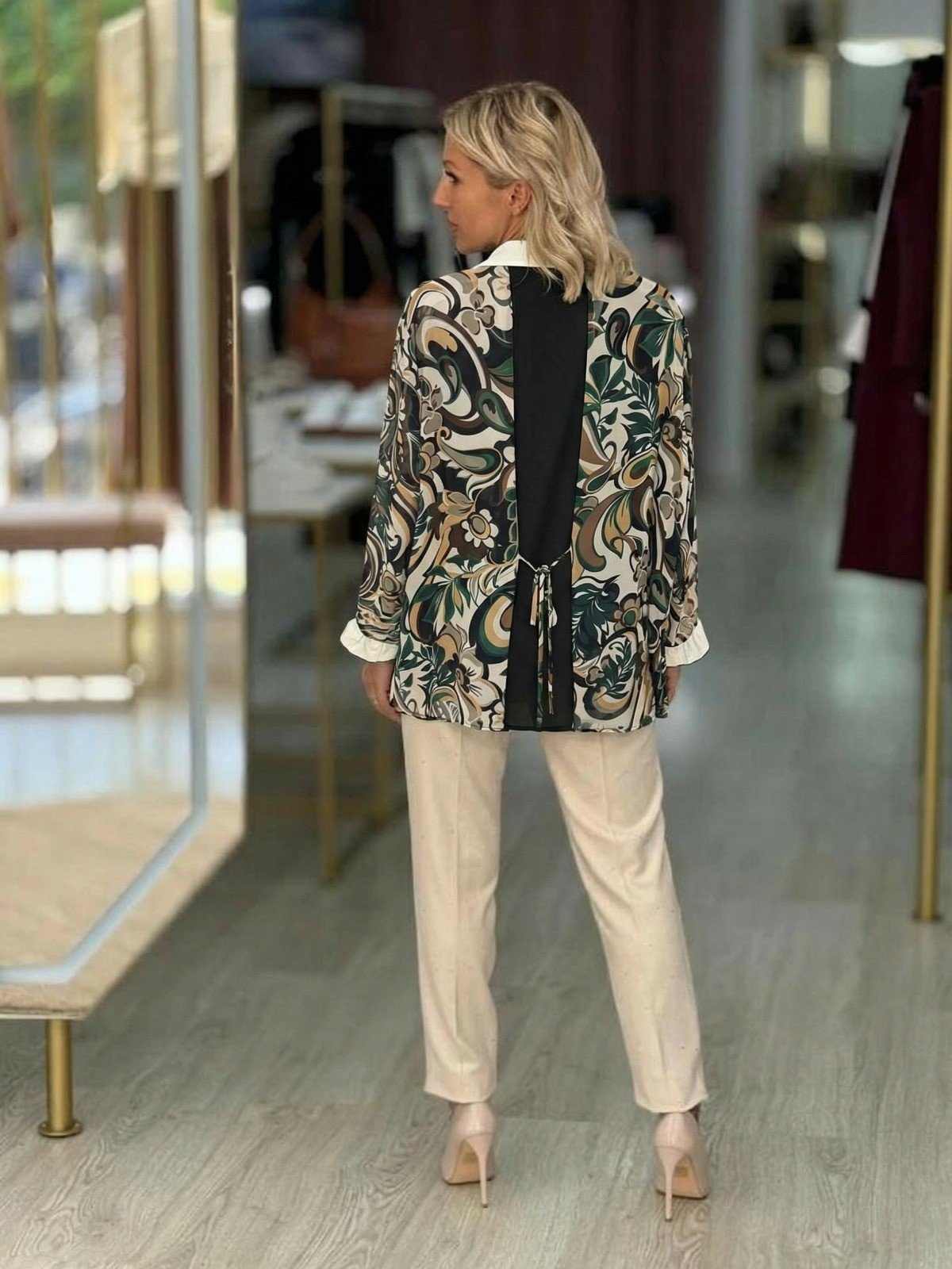 Camiseiro assimétrico com colarinho. Mangas a 3/4 com terminação em folho. Pequeno atilho nas costas. Fecha na frente com botões, sendo que o primeiro é com uma pérola e brilhantes.