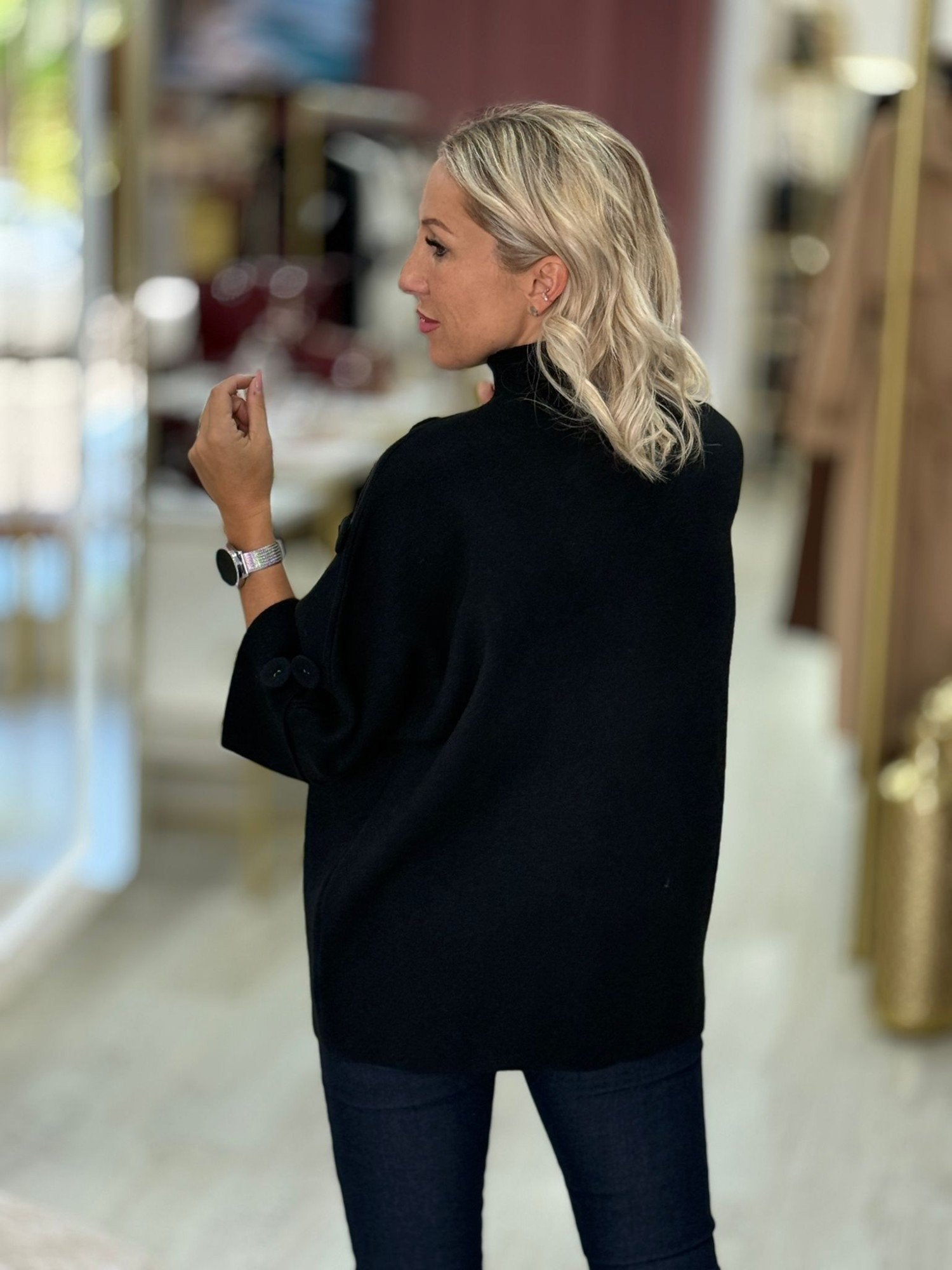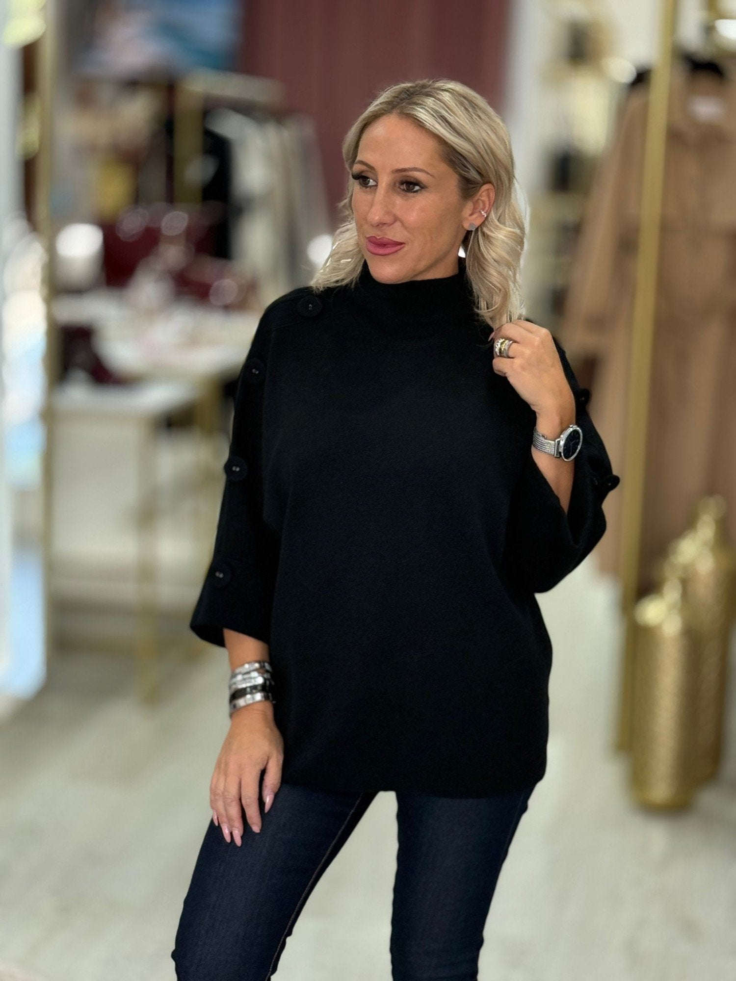 Camisola de malha oversize, gola subida. Mangas a 3/4 com dobra. Aplicação de botões dos ombros até às mangas.