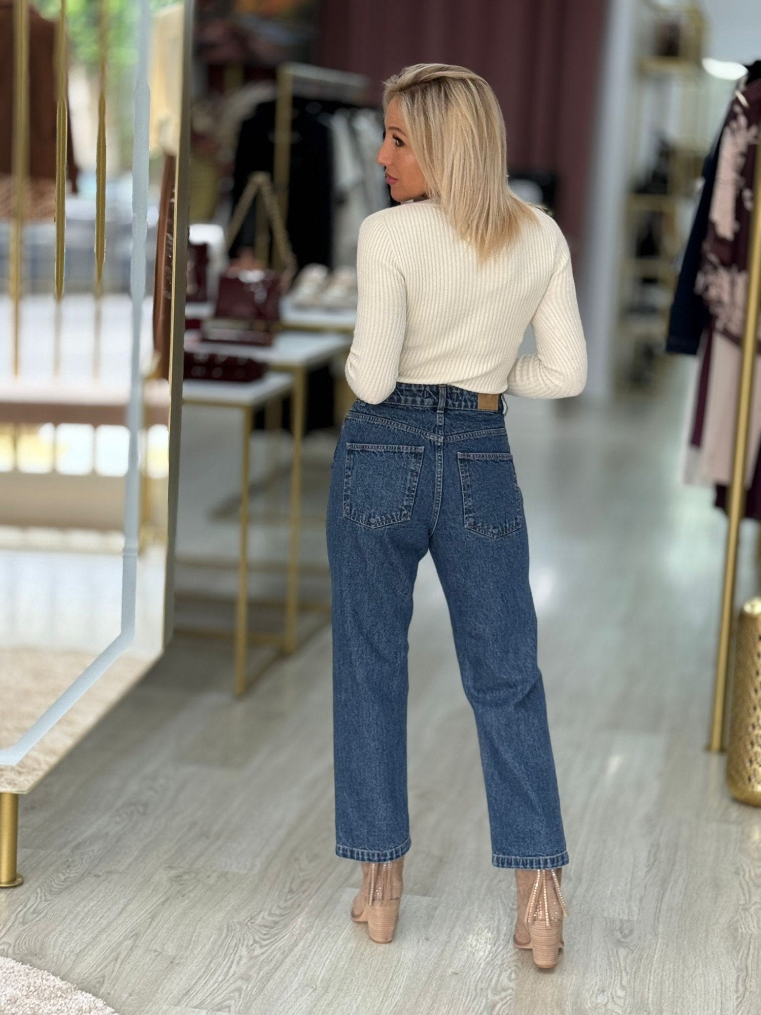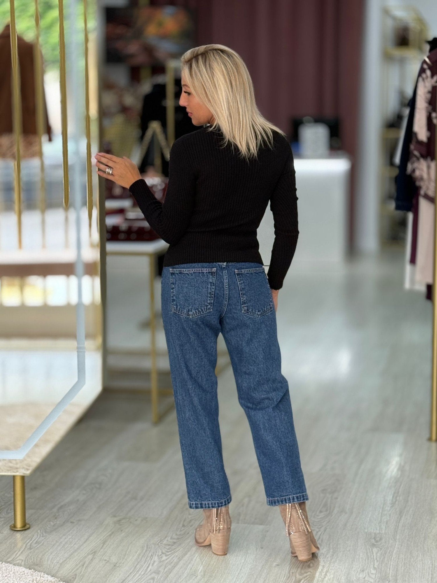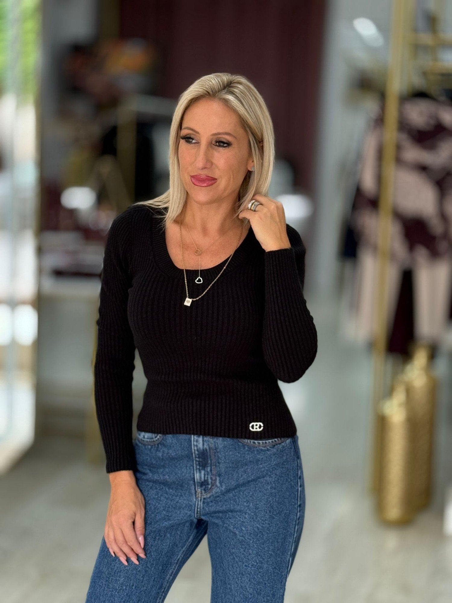 Camisola de malha canelada, decote redondo, com chapa "R" com brilhantes.