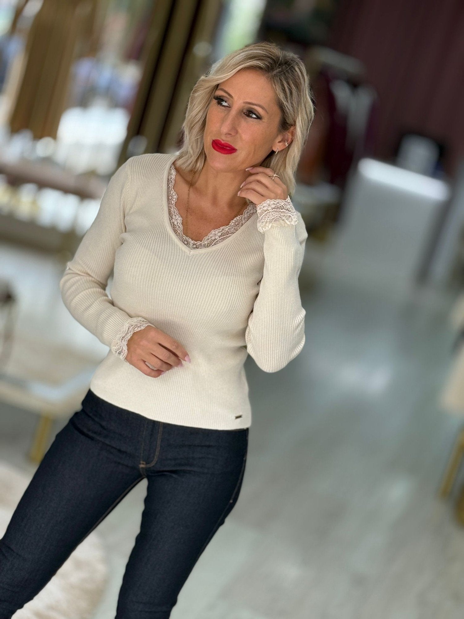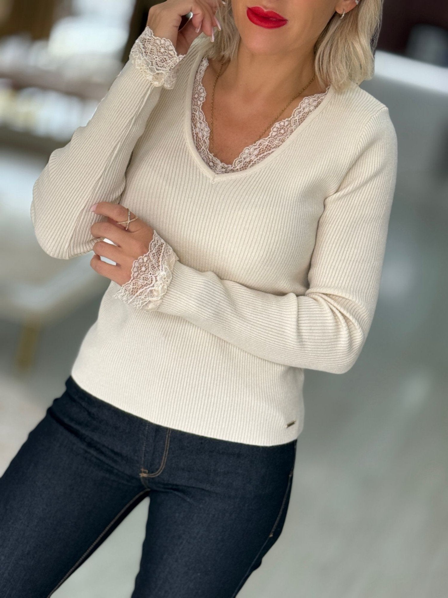 Camisola de malha canelada com decote em bico, delicadamente adornado com aplicação de renda, que acrescenta um toque romântico e feminino. As mangas compridas terminam também em renda, criando um equilíbrio entre conforto e elegância. Uma peça versátil, ideal para usar sozinha ou por baixo de casacos e blazers, perfeita para looks do dia a dia com um toque sofisticado.