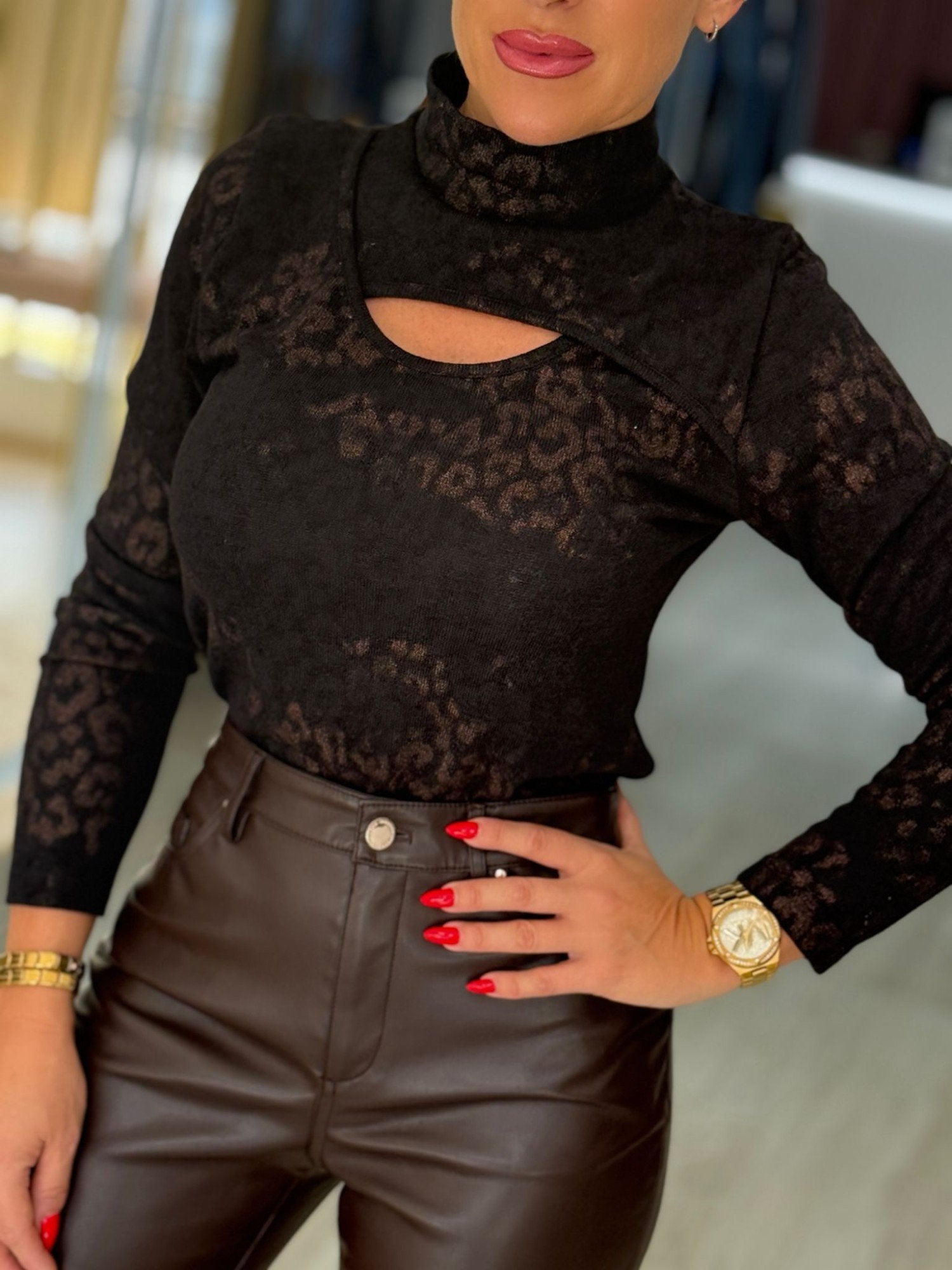 Camisola em malha fina de gola subida, com abertura na zona do decote. Com padrão animal. Mangas compridas.