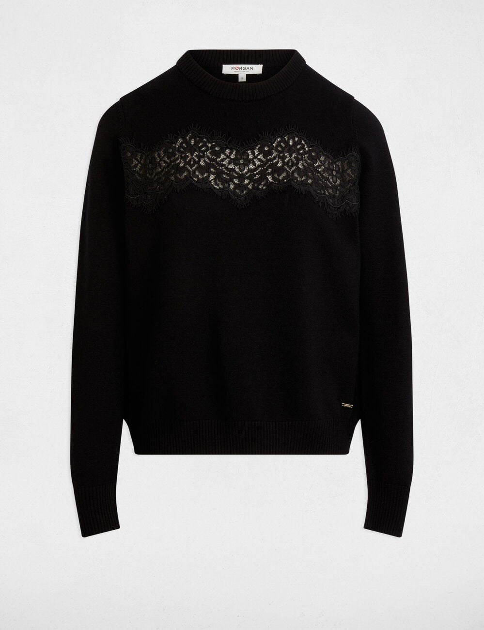 Camisola de malha fina de decote redondo. Aplicação de renda à frente. Mangas compridas com punhos.