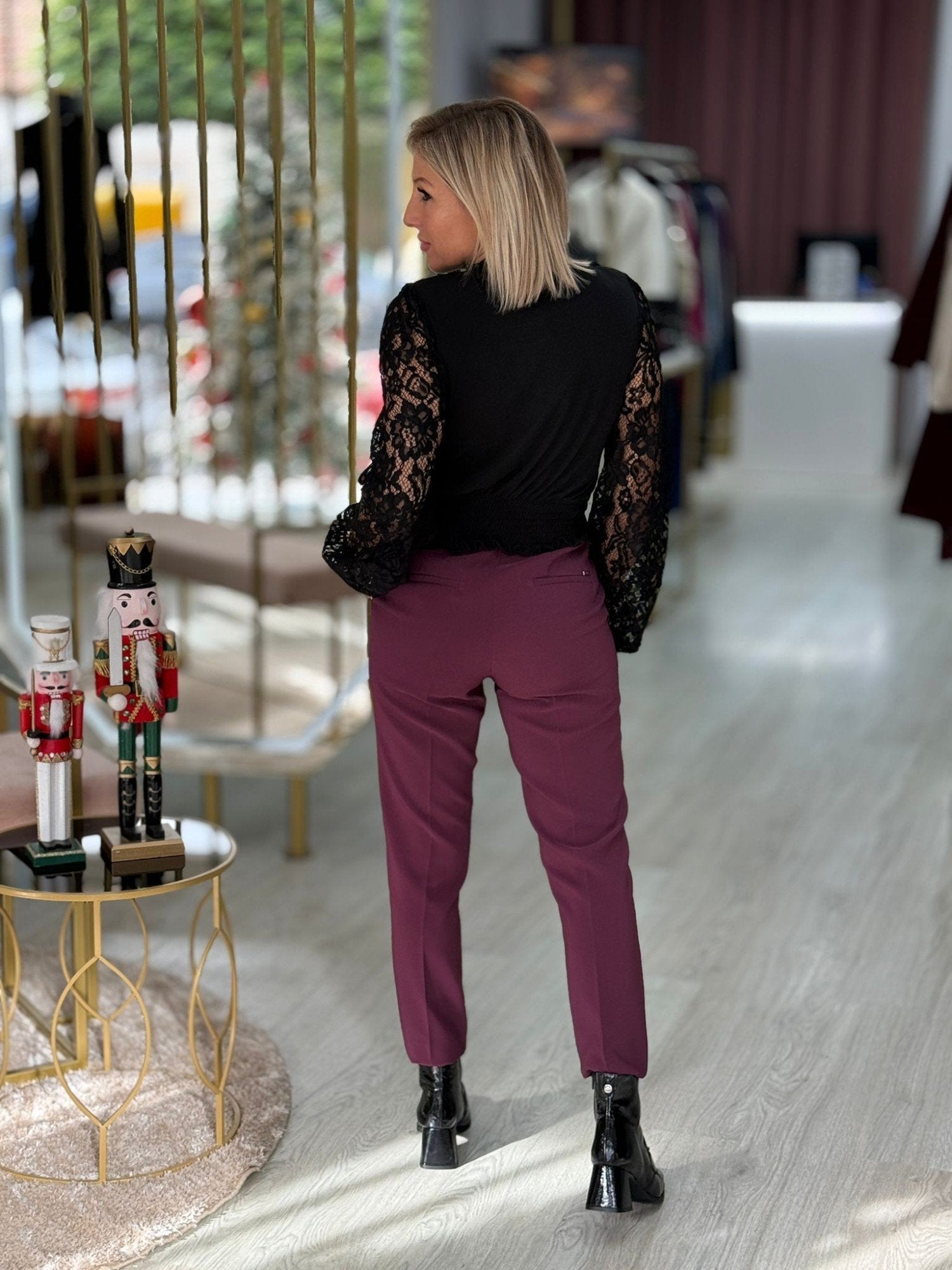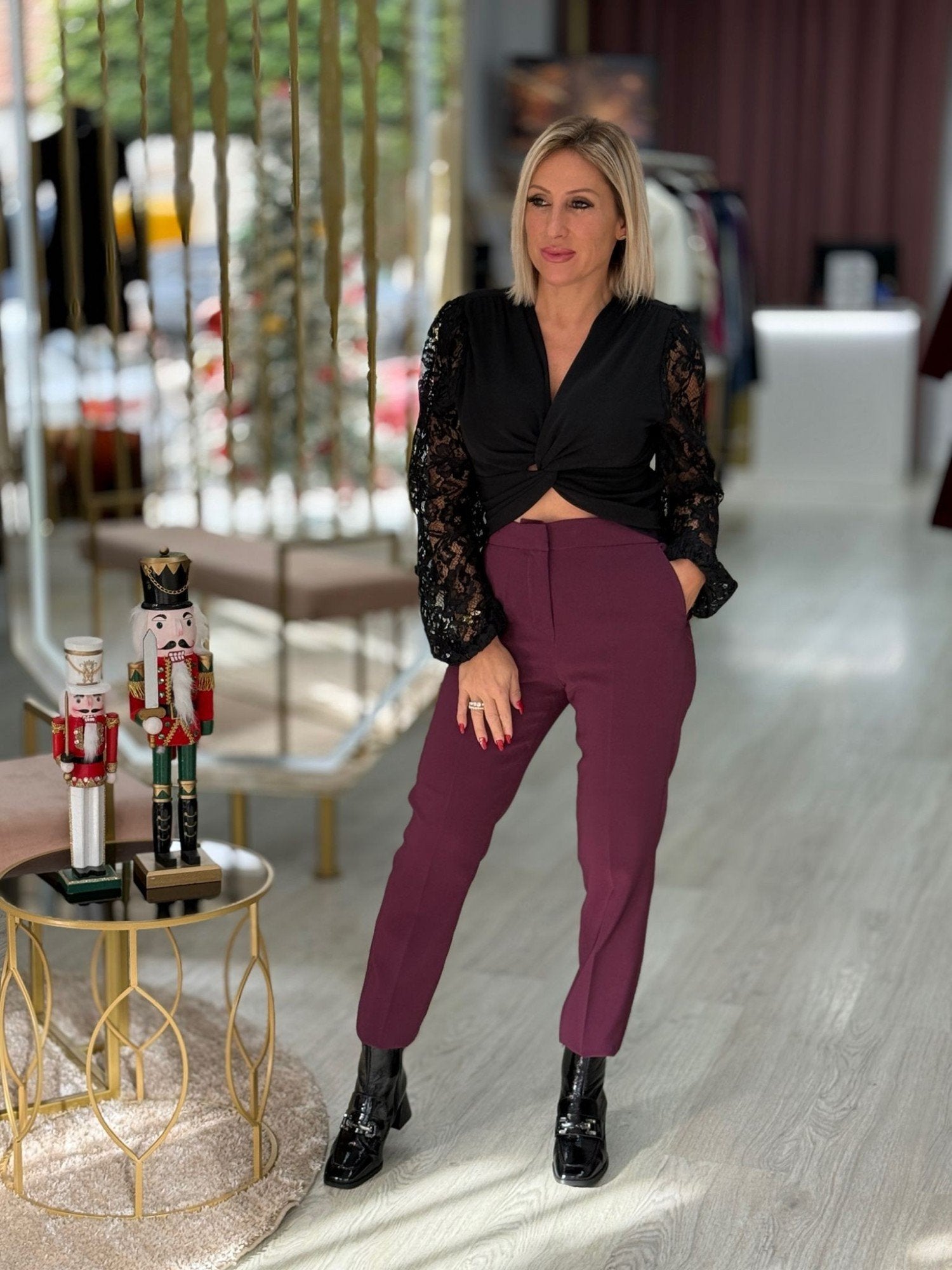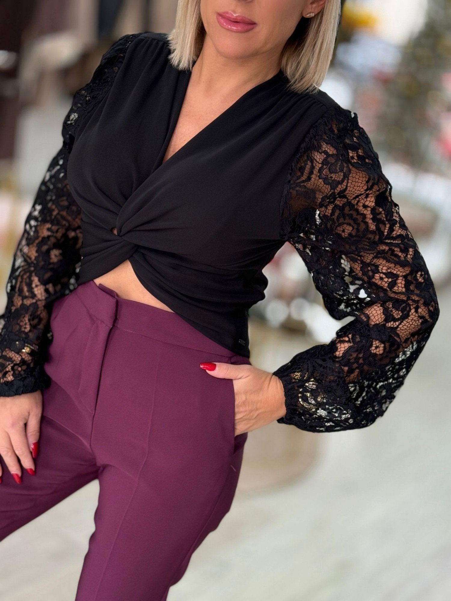 Camisola curta feminina, com decote em V cruzado e efeito de nó na frente. Manga comprida em tecido de renda. Apresenta punhos com acabamento em elástico e costas ajustadas com franzido elástico na cintura.