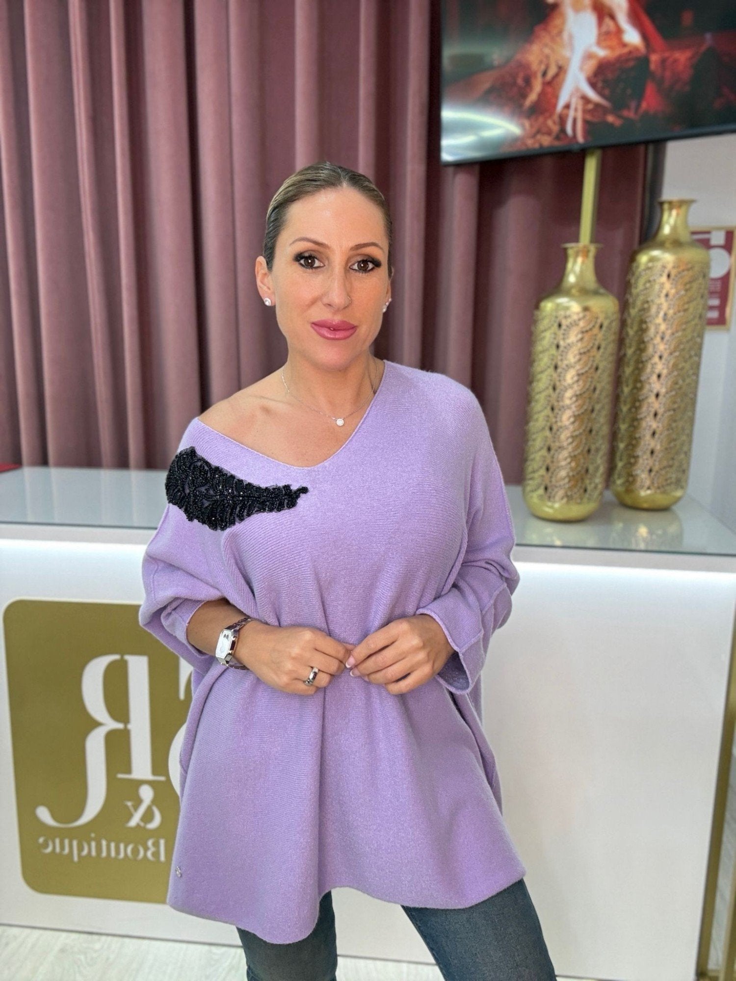 Camisola de malha de decote em V. Modelo oversize. Aplicação com missangas.