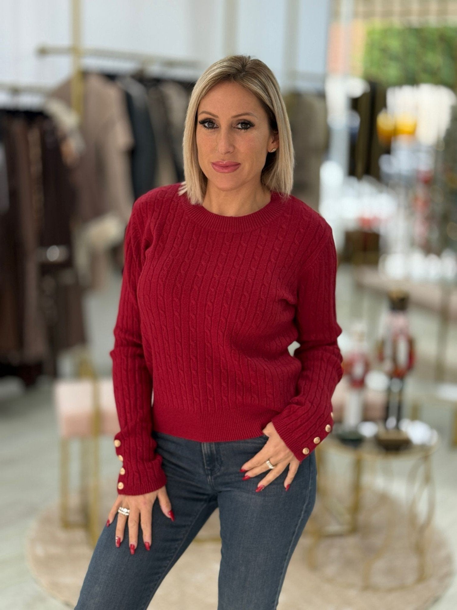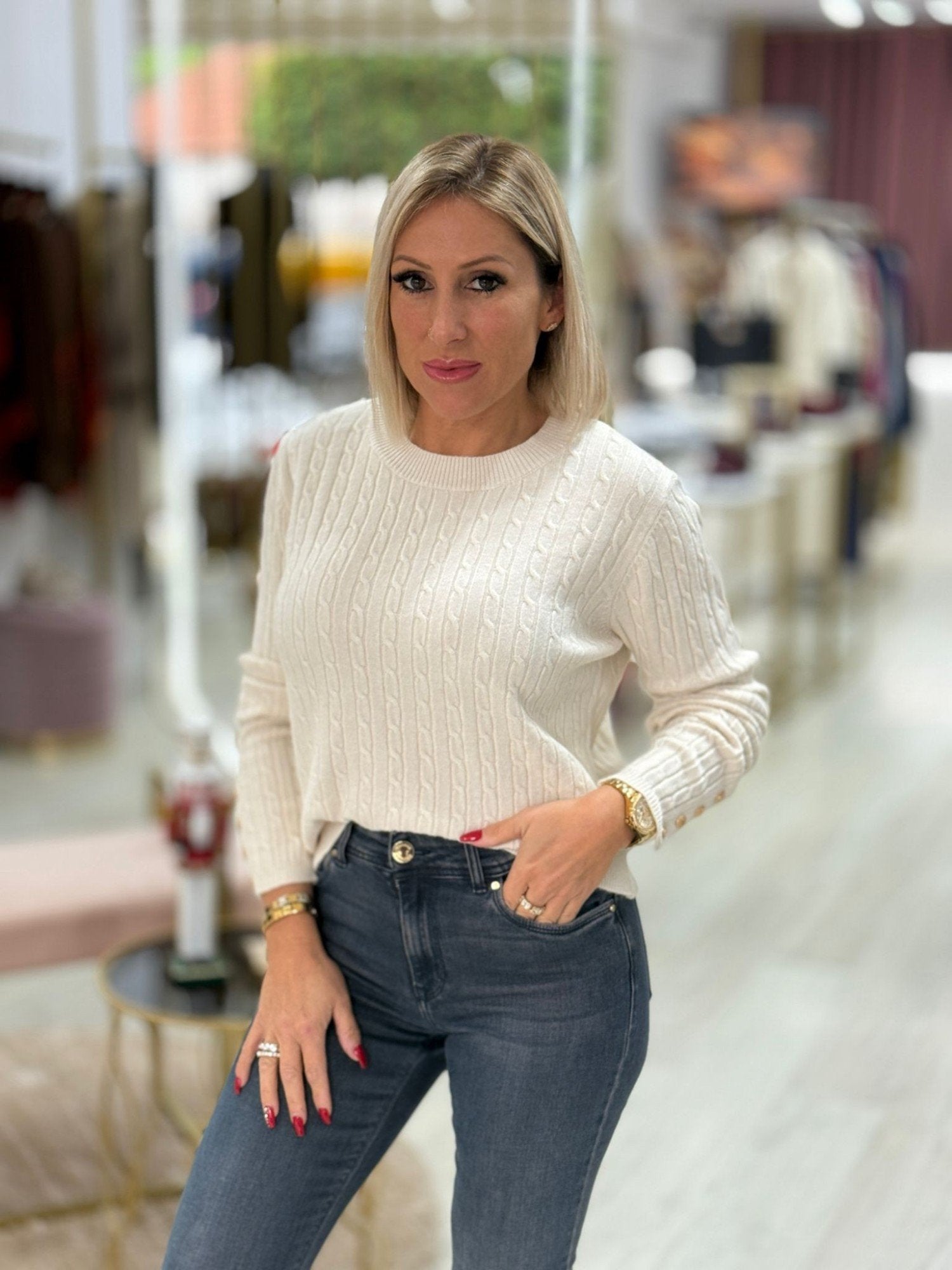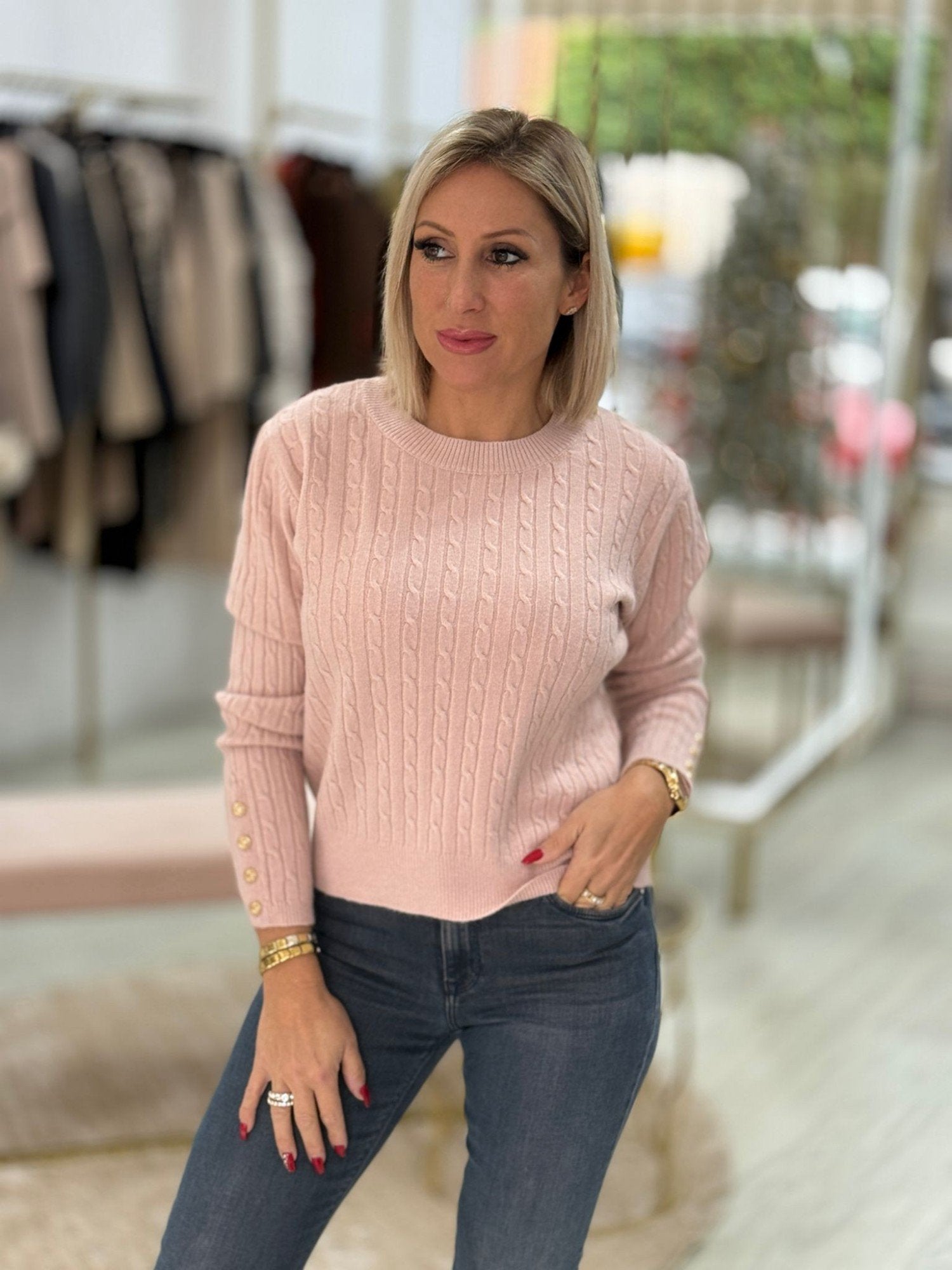 Camisola de malha com padrão entrançado em relevo. Apresenta decote redondo e manga comprida, com acabamento canelado na gola, bainha e punhos. Destaca-se pelos pequenos botões nos punhos, que acrescentam um detalhe feminino e sofisticado. Uma peça elegante e versátil, ideal para looks de outono-inverno, perfeita para usar sozinha ou em sobreposição com casacos.