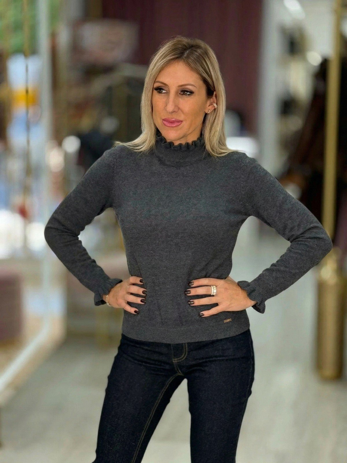 Camisola de malha com gola subida franzida, um detalhe delicado que acrescenta feminilidade ao look. As mangas compridas terminam em punhos em folho trazendo um toque elegante ao design clássico. A silhueta confortável e o acabamento suave fazem desta peça uma opção versátil para coordenados do dia a dia ou combinações mais sofisticadas.