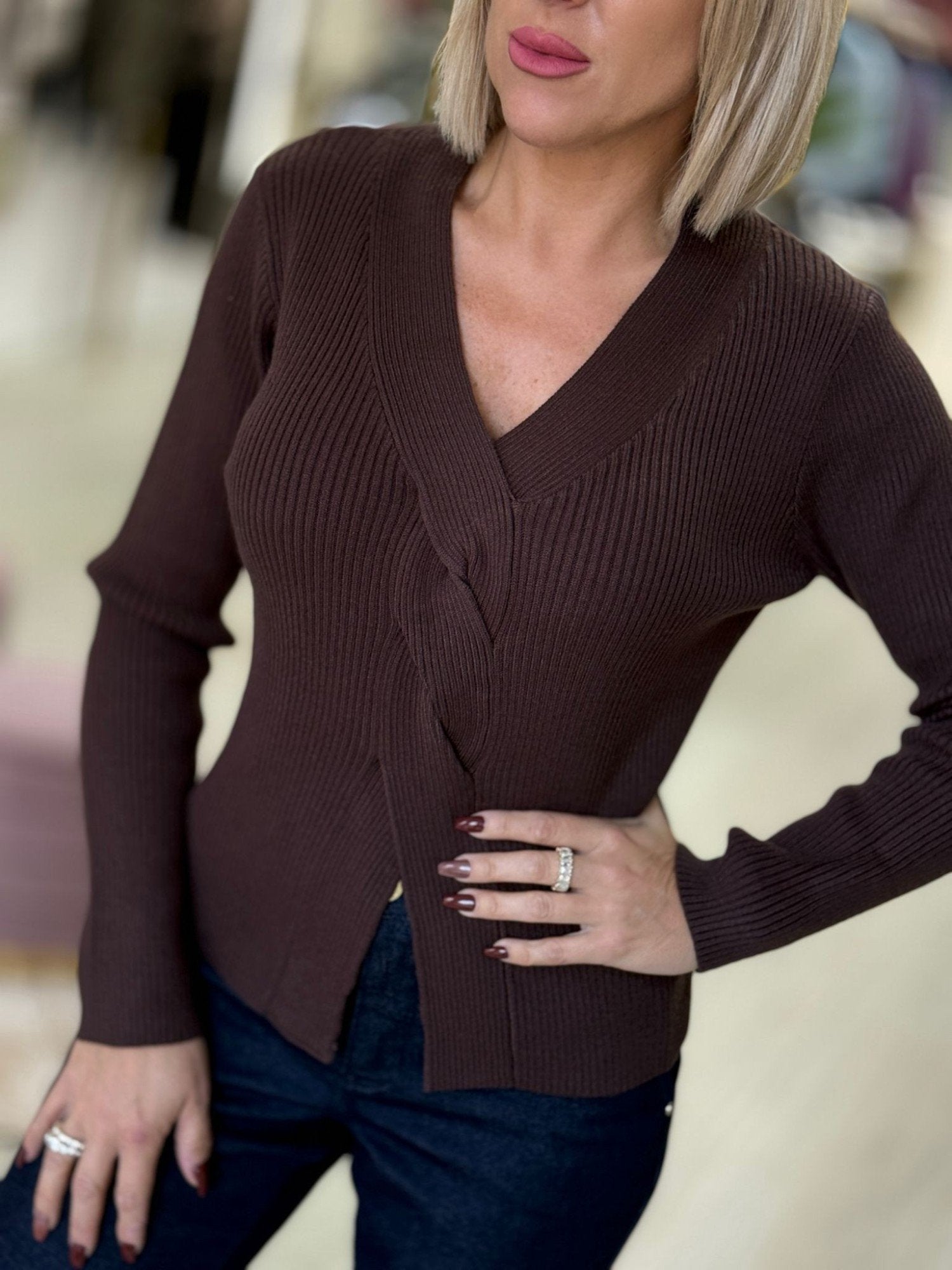 Camisola em malha canelada com design elegante e minimalista. O decote em V destaca-se pelo pormenor entrançado na frente, que confere originalidade à peça. O corte direito e a textura suave garantem conforto e versatilidade, ideal para coordenados do dia a dia com um toque sofisticado.