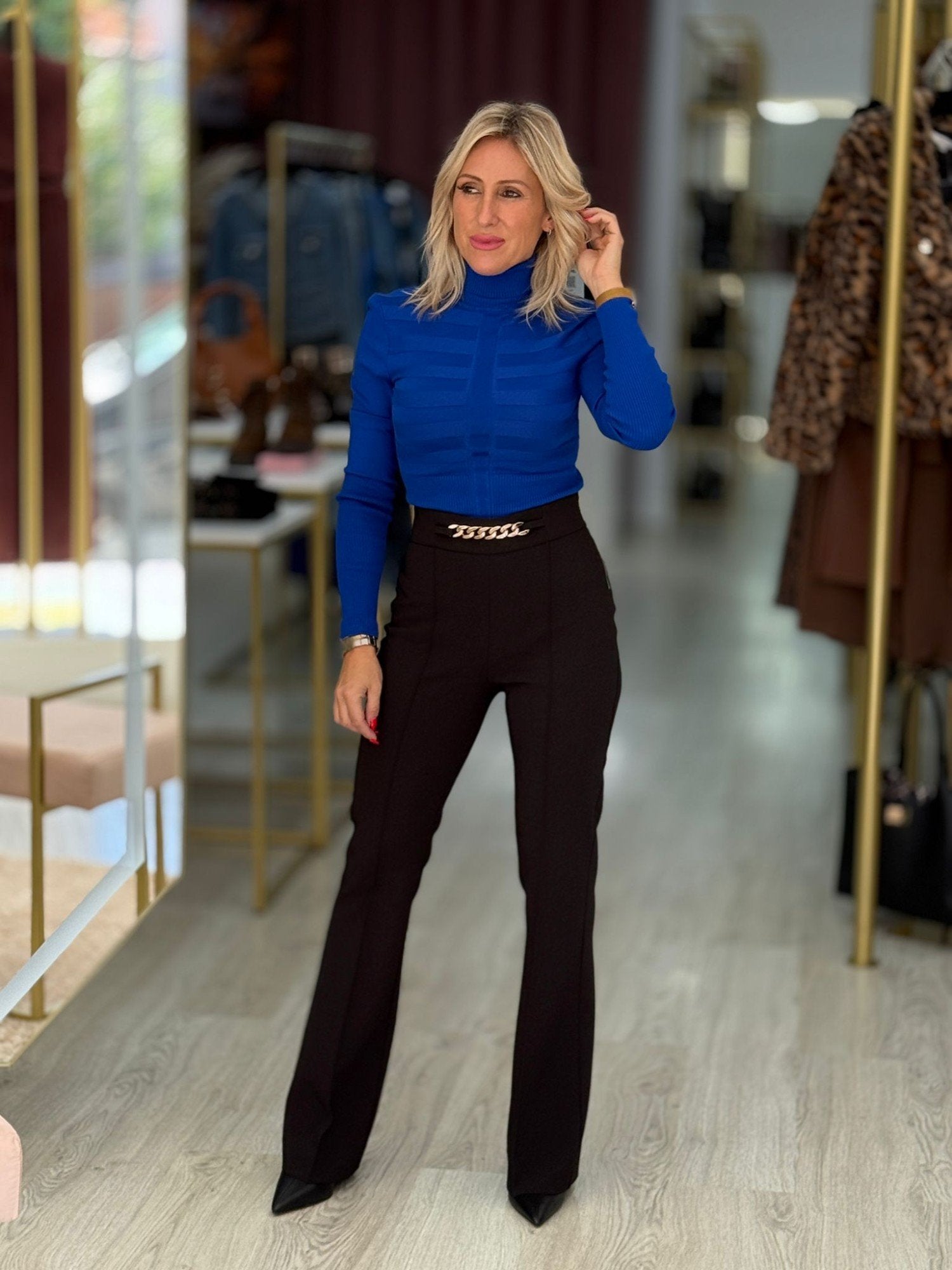 Camisola de manga comprida gola alta. Corte justo. Gola alta. Mangas compridas. Malha fina. Detalhes em malha canelada.