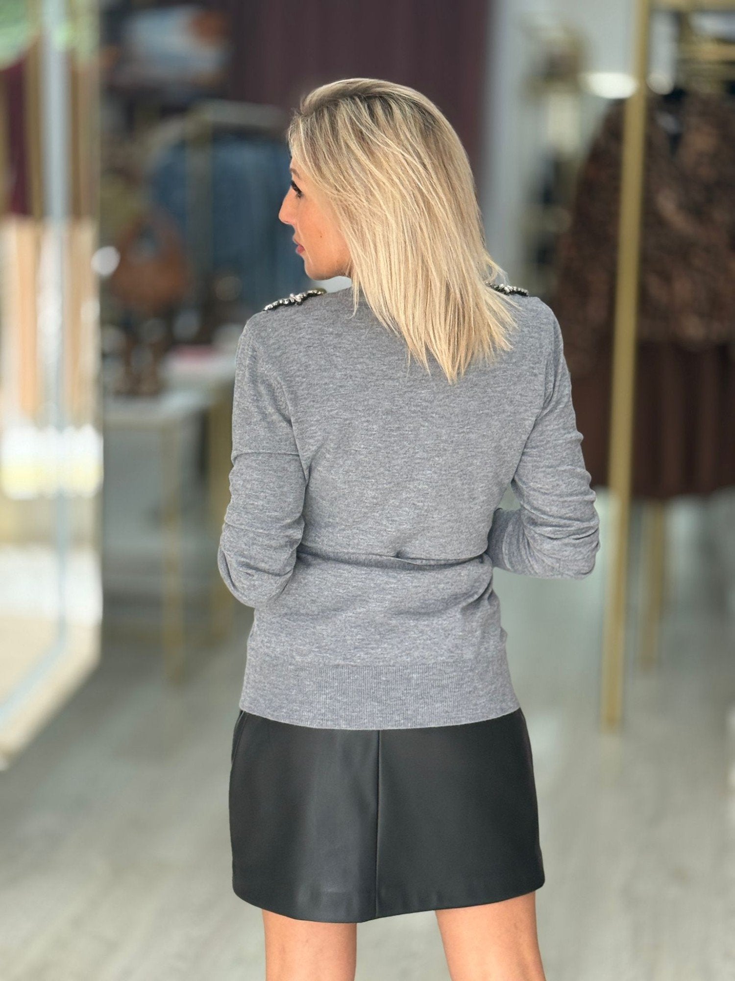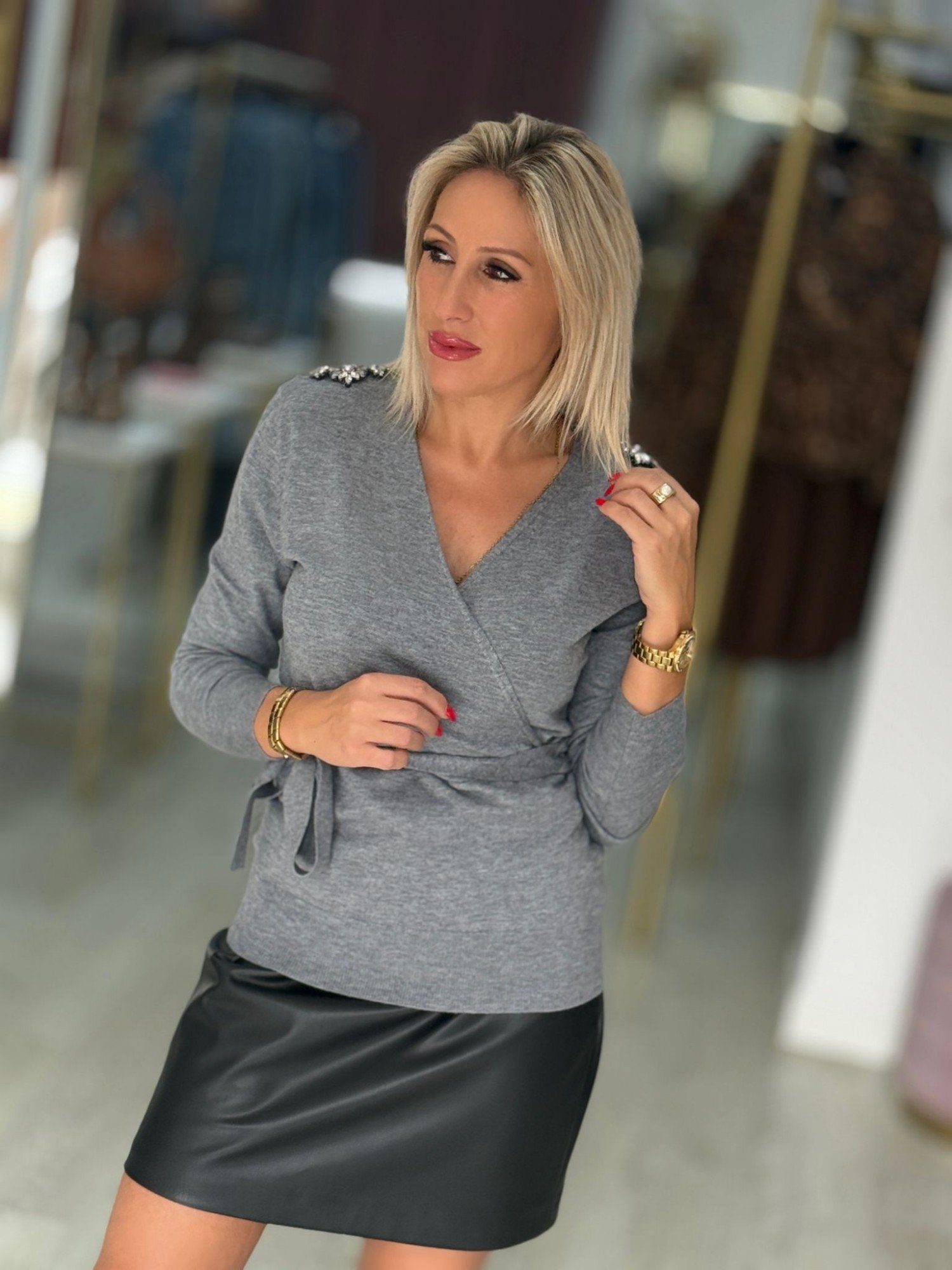 Camisola numa malha fina e muito suave. Decote em V com efeito de trespasse. Com enchumaços e pedraria nos ombros. Tiras na lateral para fazer laçada.