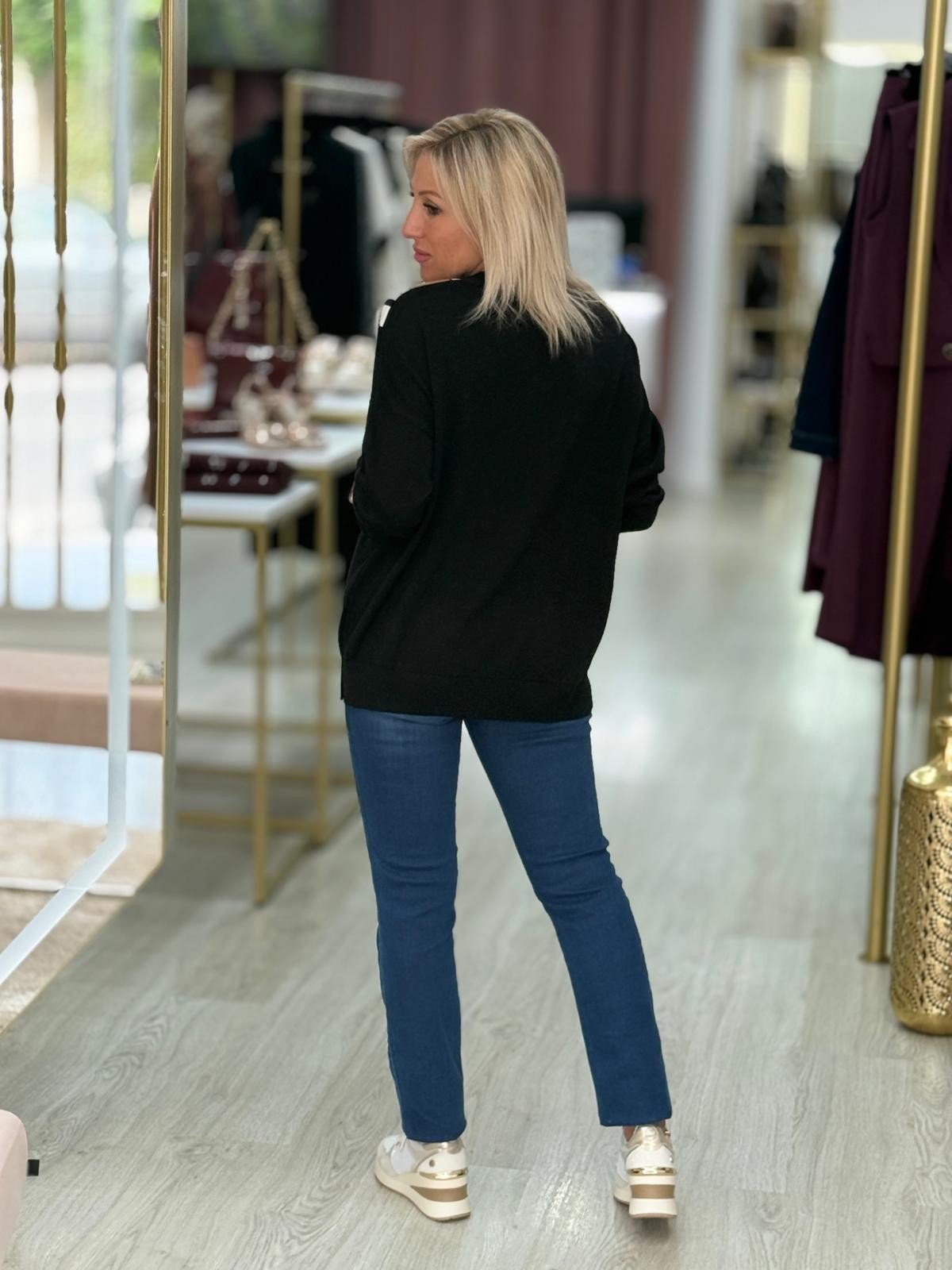 Camisola de malha de decote em V. Mangas compridas com punhos com botões dourados. Modelo oversize.