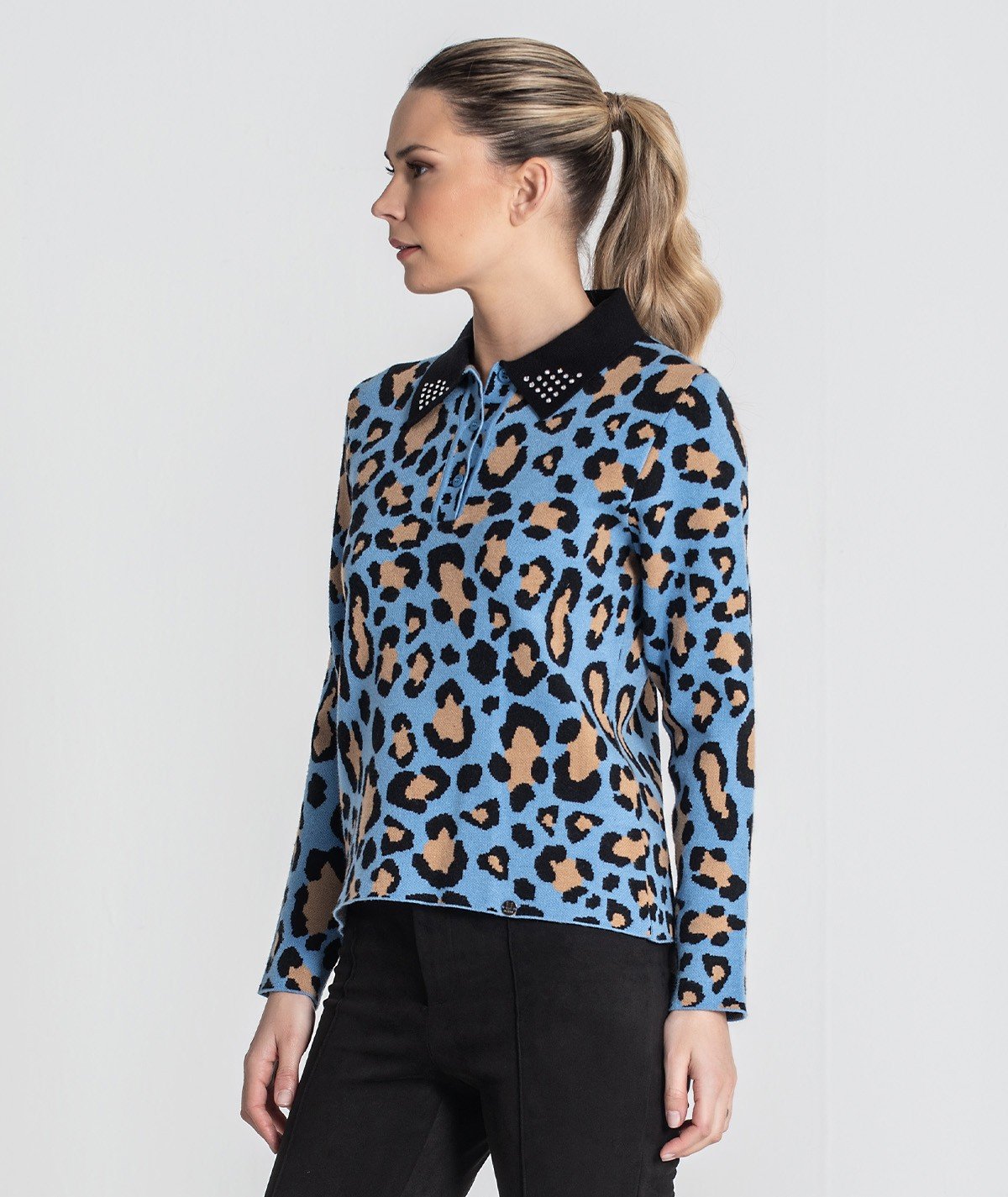 Camisola polo com jacquard animal print. Gola com brilhos, aperta na frente com botões.