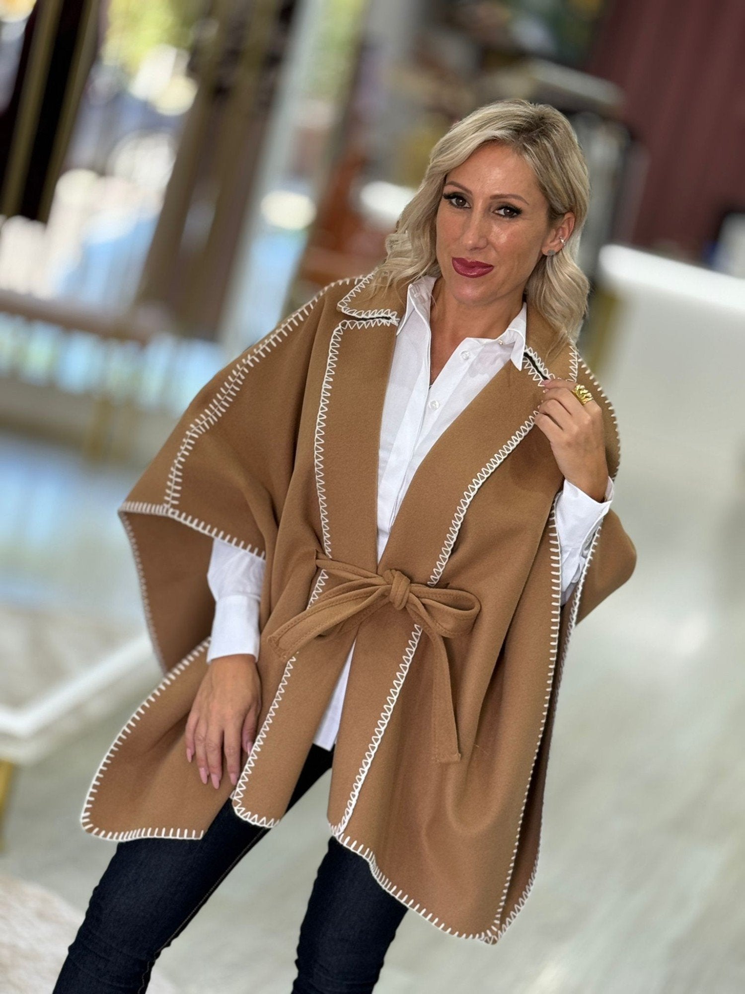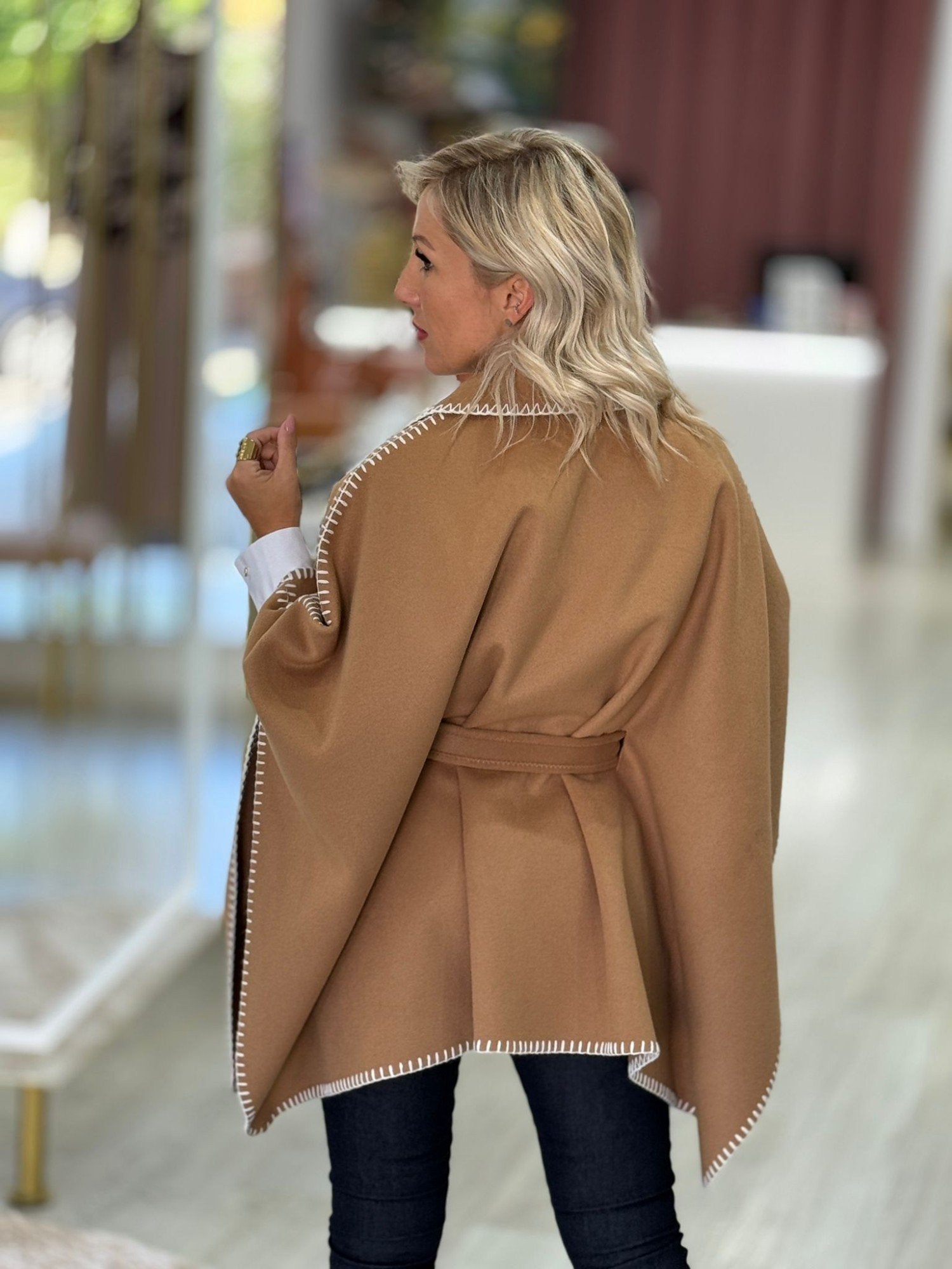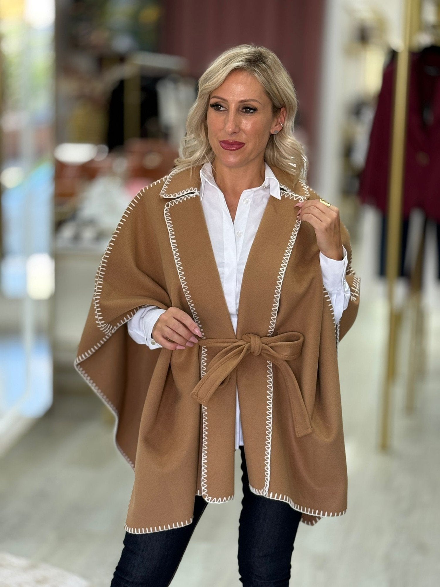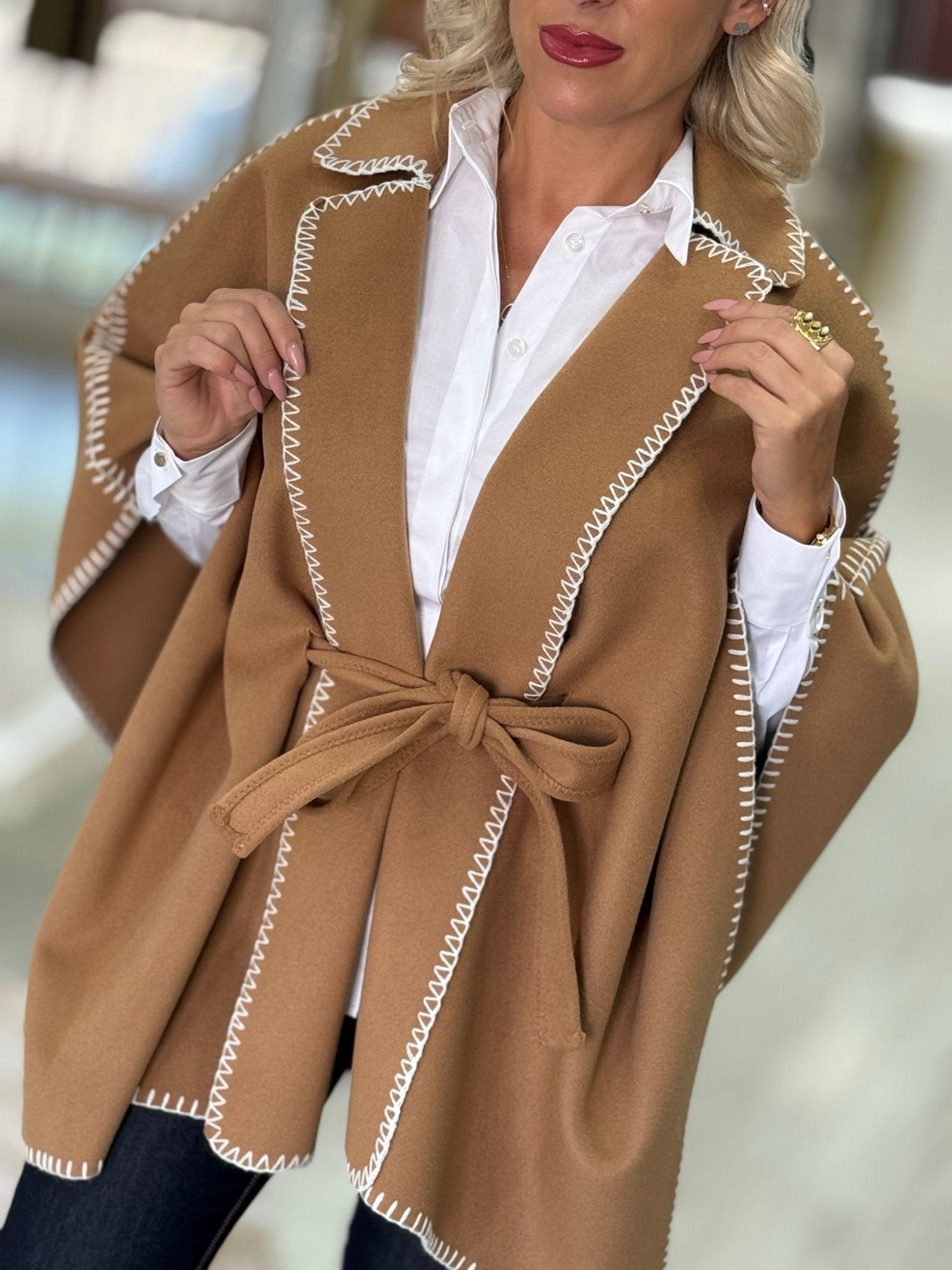 Capa com gola de lapela. Pespontos a toda a volta. Modelo assimétrico. Cinto.