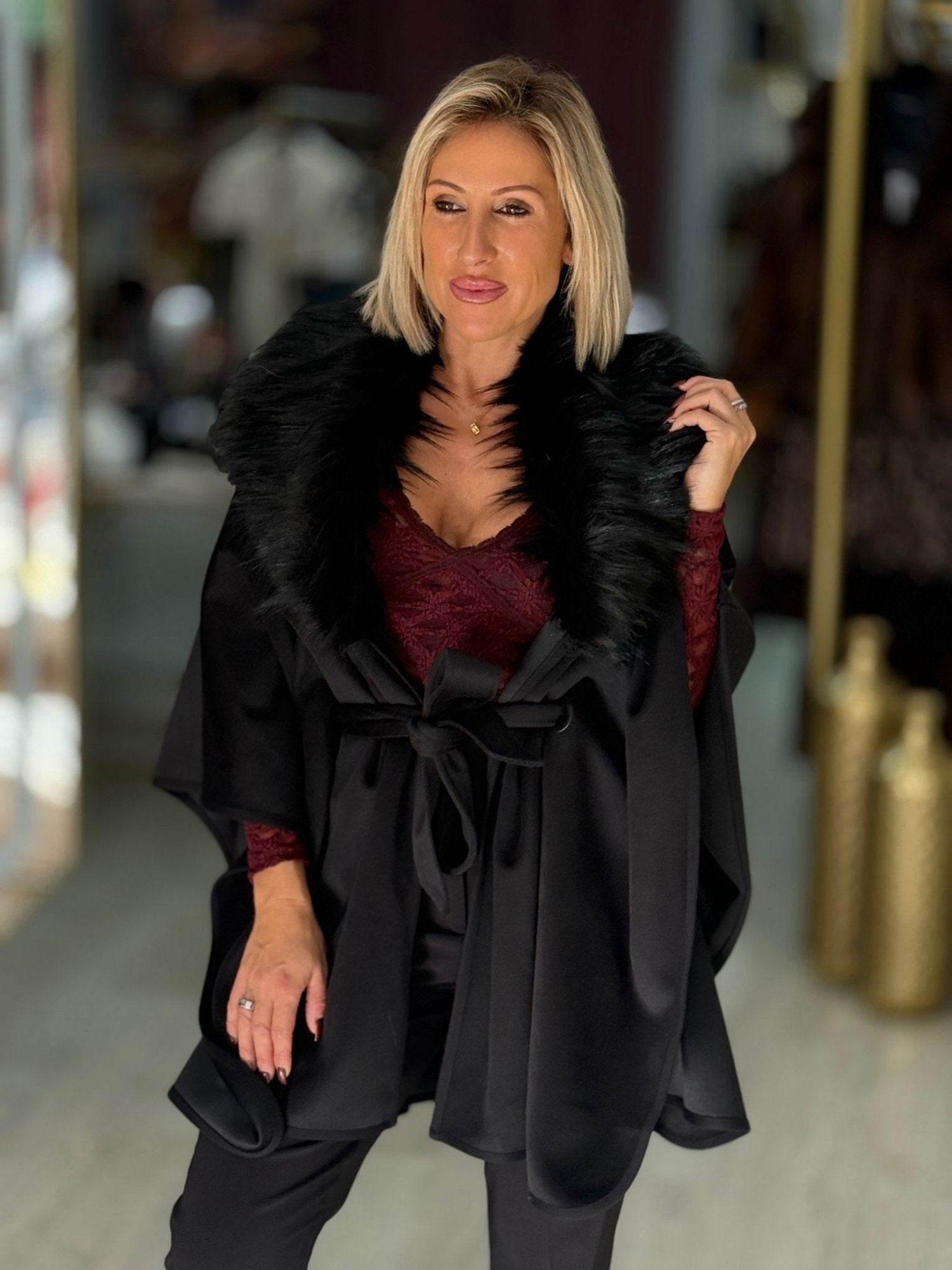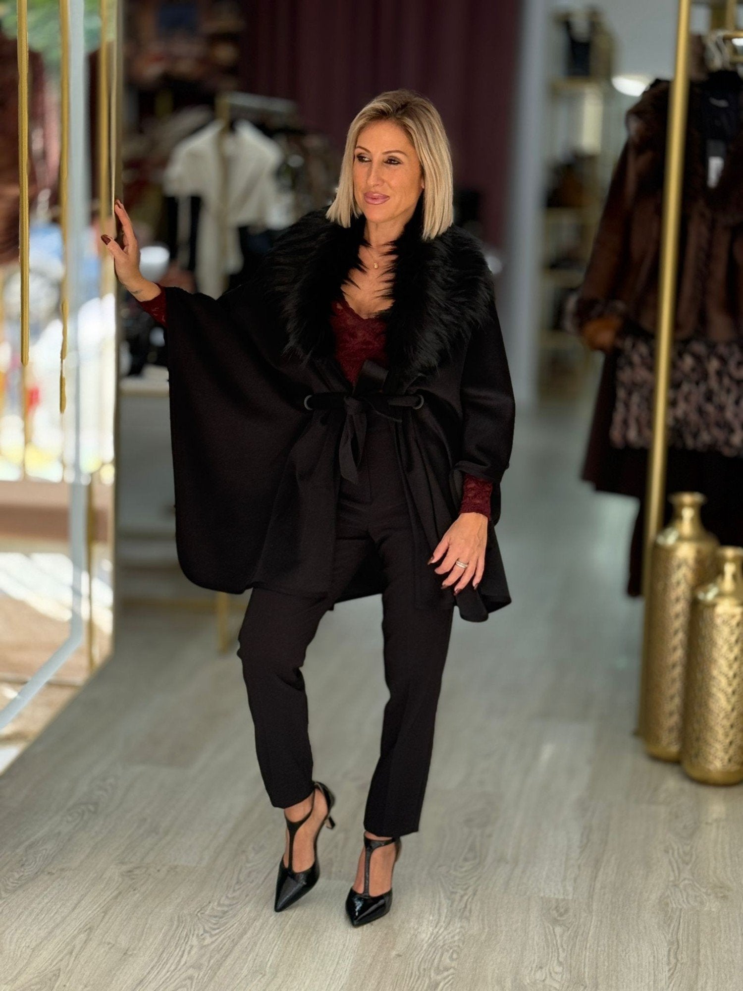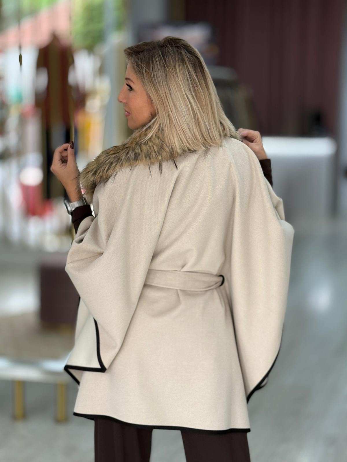 Capa elegante com gola de pelo sintético, acabamento contrastante e cinto para ajustar a silhueta. O design fluido confere movimento e sofisticação, enquanto a gola volumosa acrescenta um toque luxuoso. Uma peça versátil e moderna, ideal para elevar coordenados de outono-inverno com conforto e estilo.