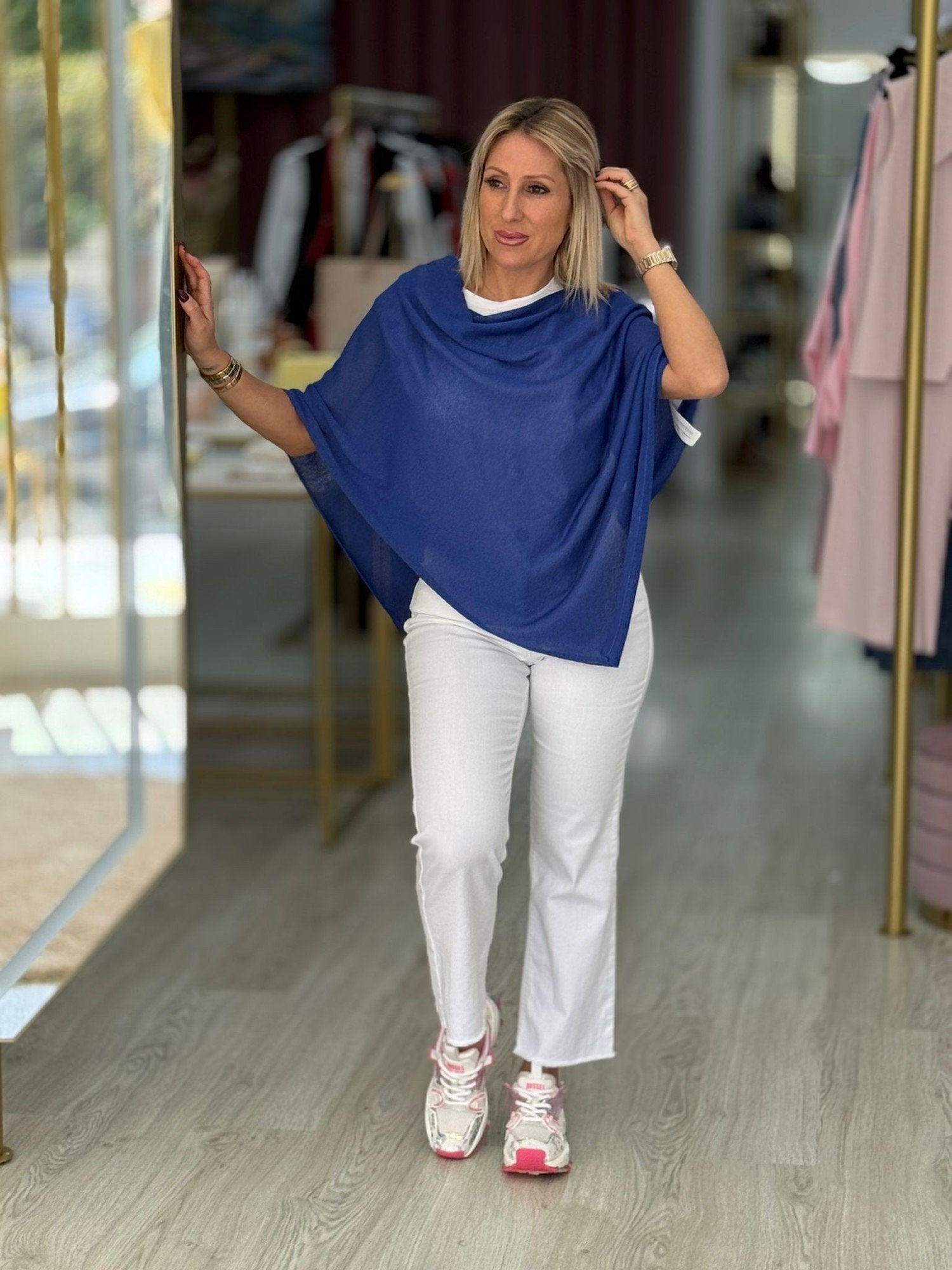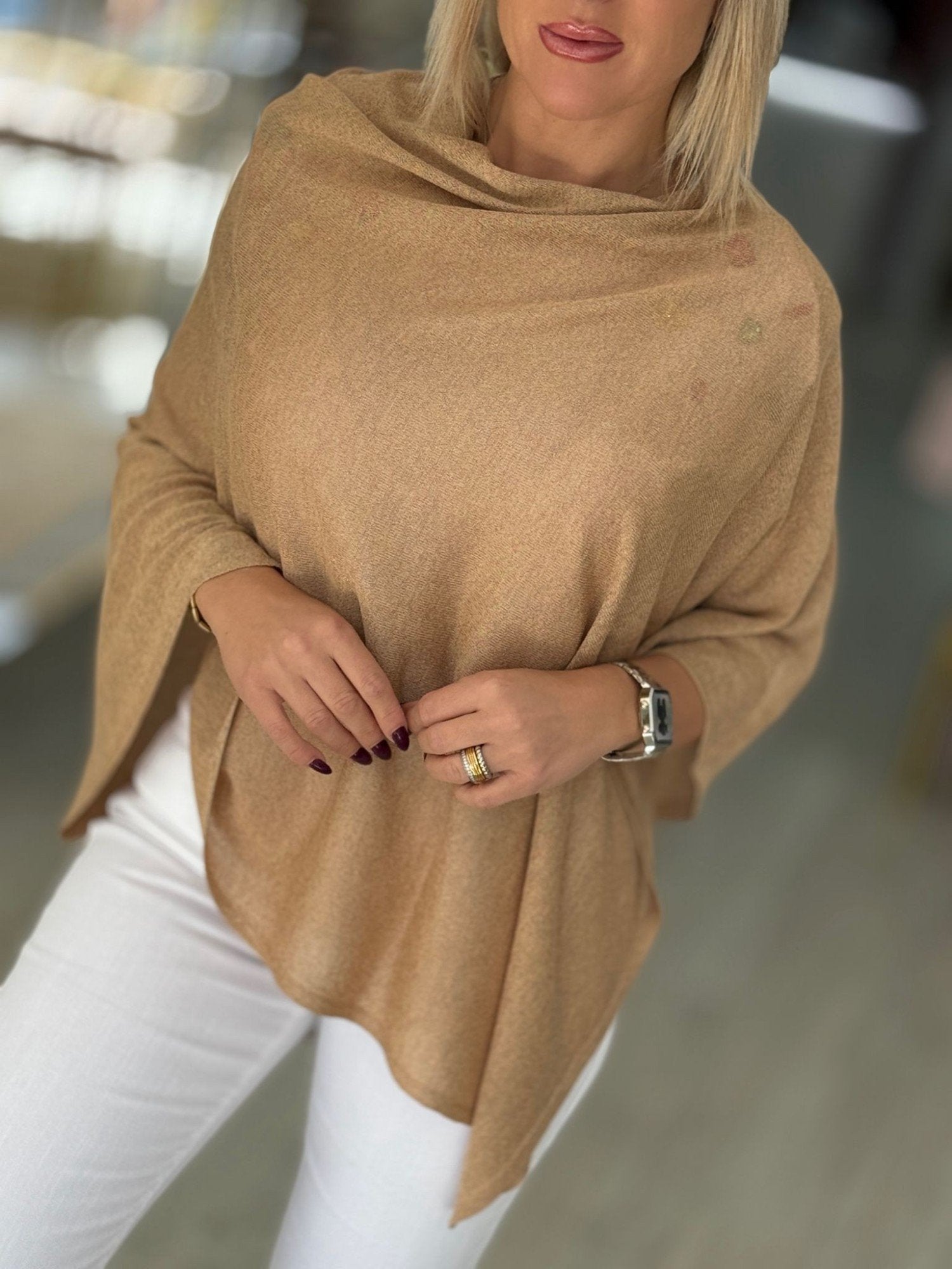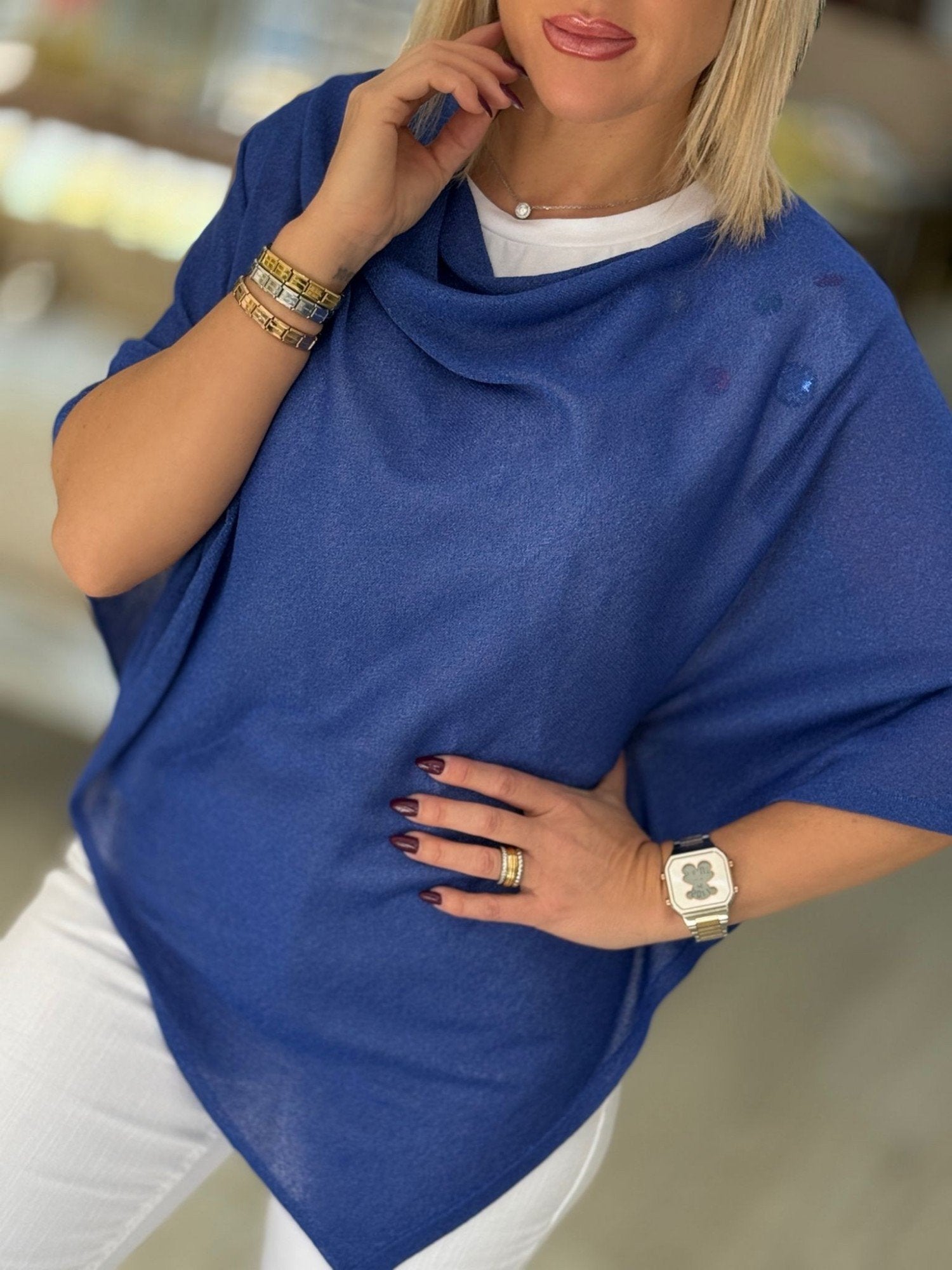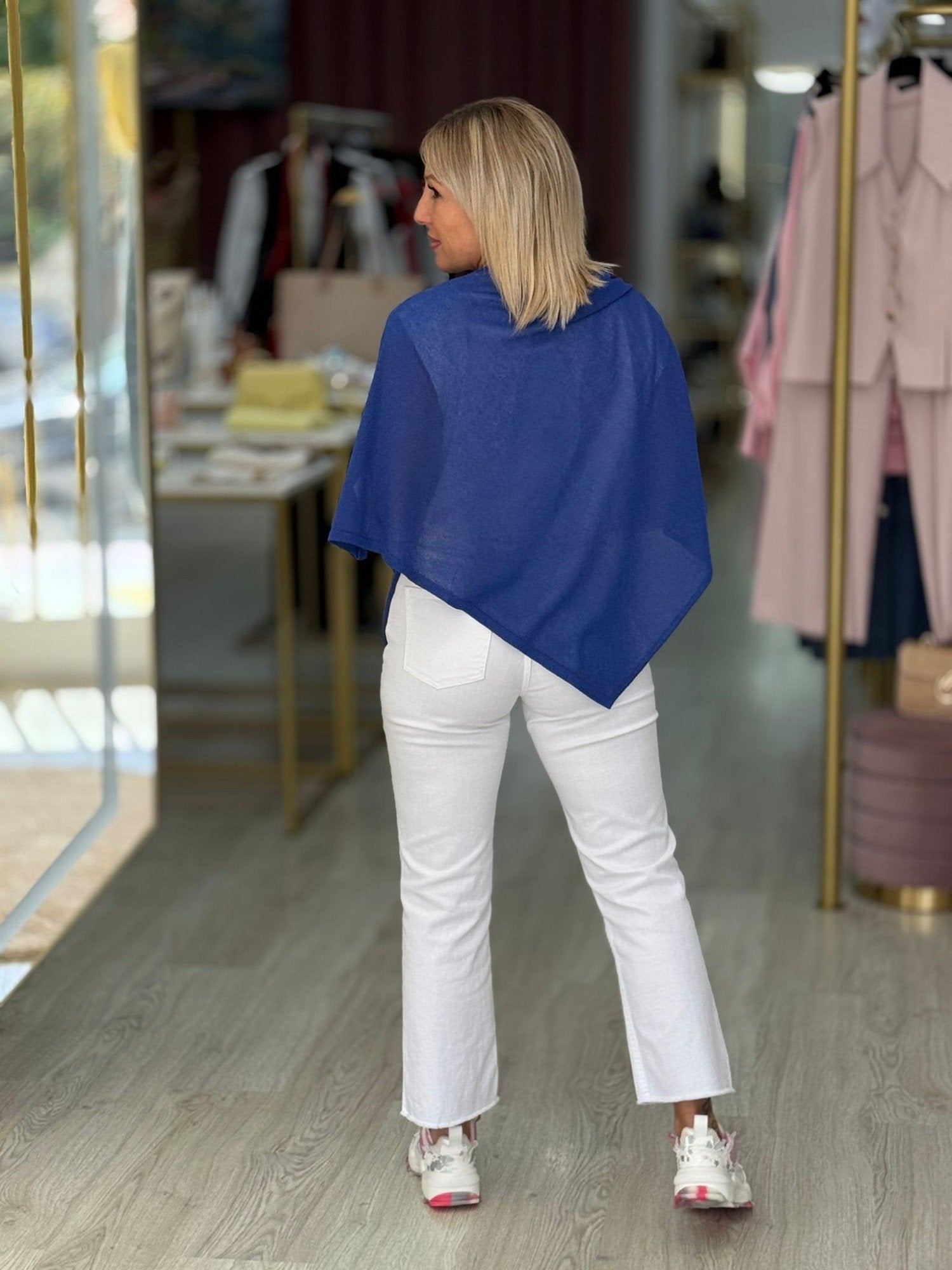 Capa com lurex de decote à barco.