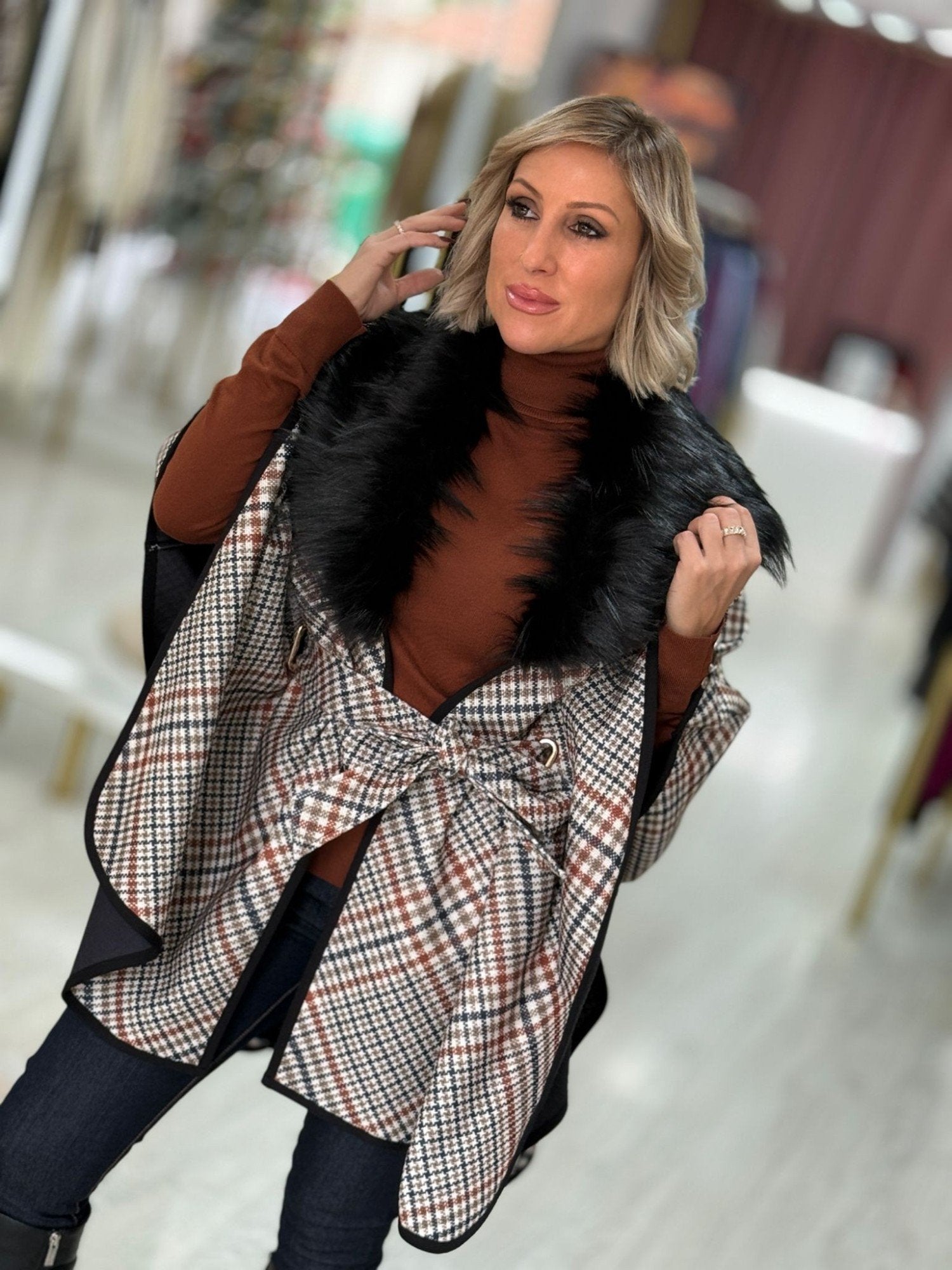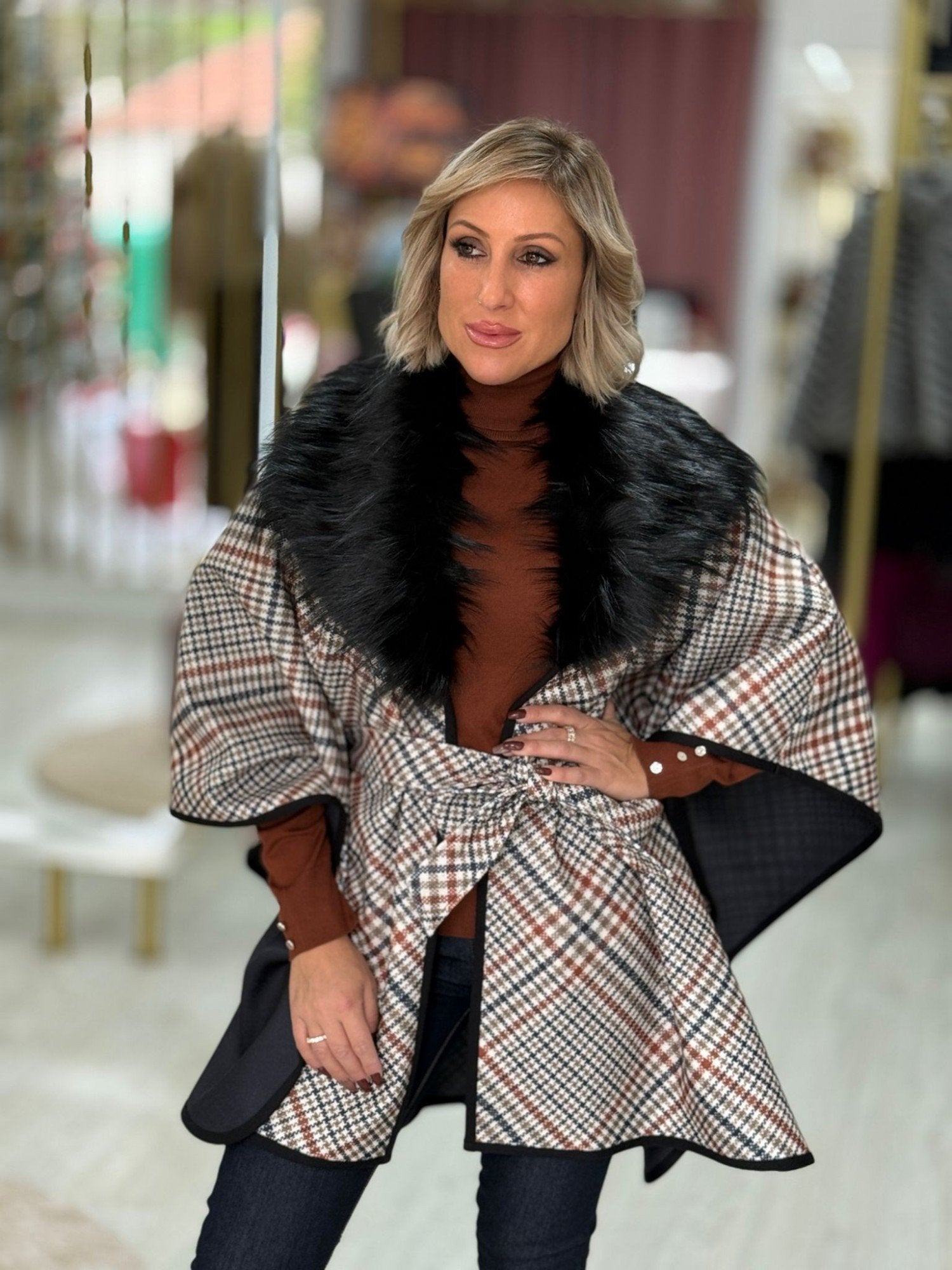 Capa em tecido estruturado com padrão xadrez multicolor, marcada por uma gola ampla em pelo sintético que adiciona sofisticação e volume ao look. O design envolvente apresenta acabamento contrastante no interior e cinto ajustável, permitindo definir a silhueta com elegância. Uma peça statement, perfeita para elevar coordenados de inverno com charme e personalidade.