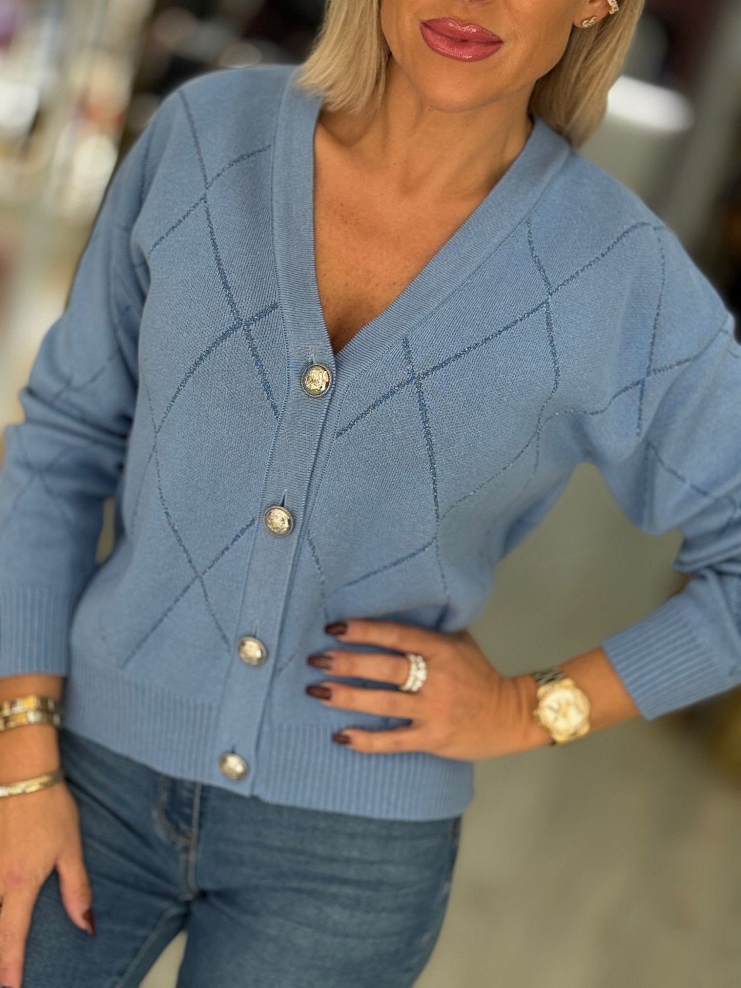 Cardigã curto com brilho. Fecha na frente com botões.