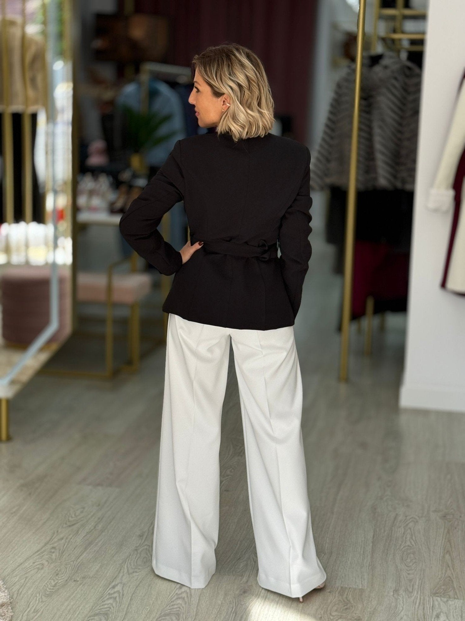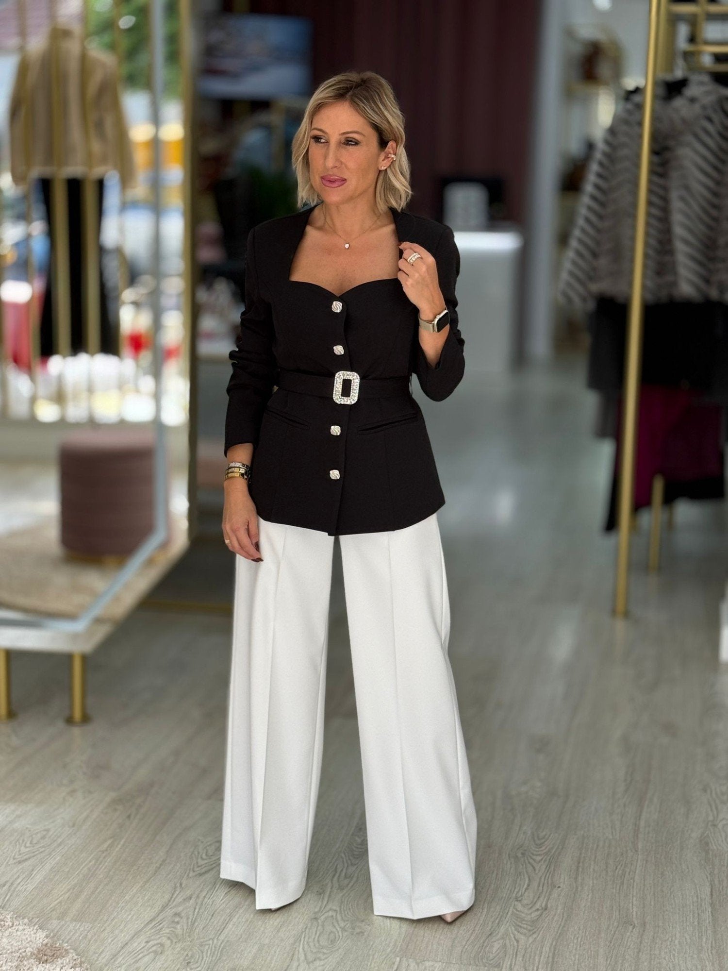 Casaco clássico com decote coração. Bolsos na frente. Presilhas e cinto no mesmo tecido e fivela com pedraria. Fecha na frente com botões com brilhantes. Forro interior acetinado.