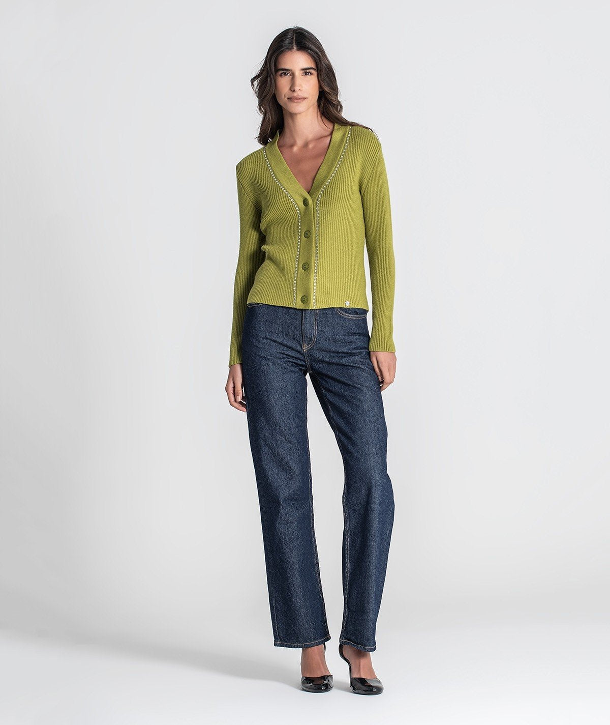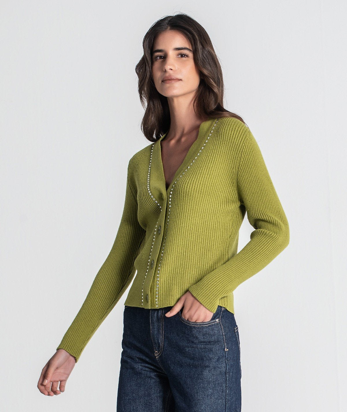 Casaco canelado com cristais no contorno do decote. Aperta na frente com botões.
