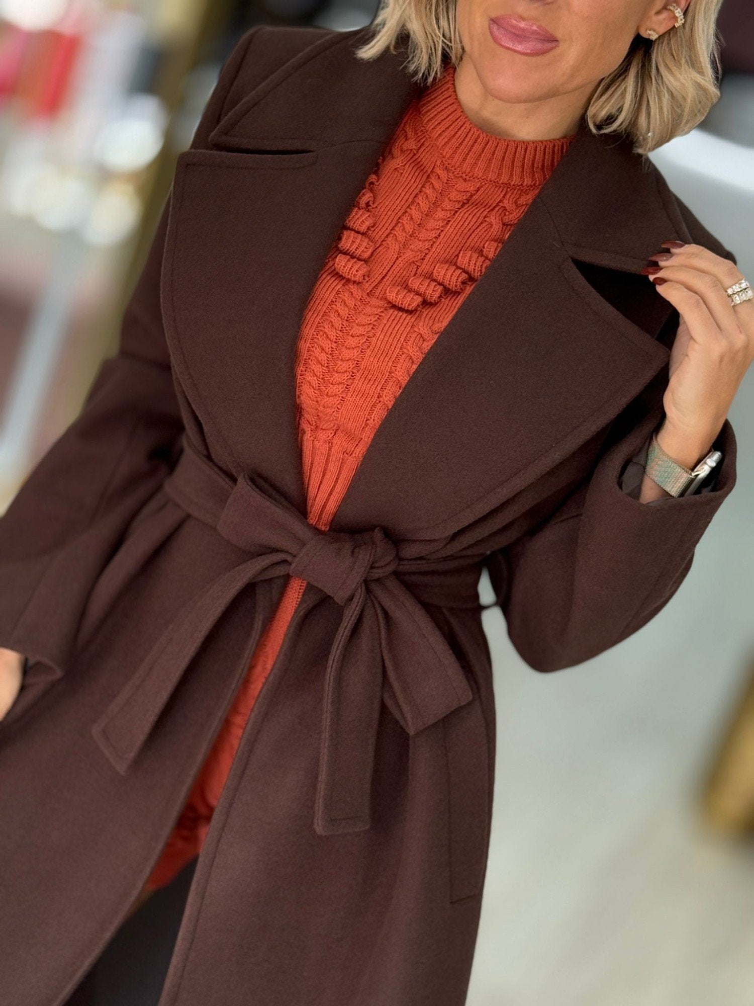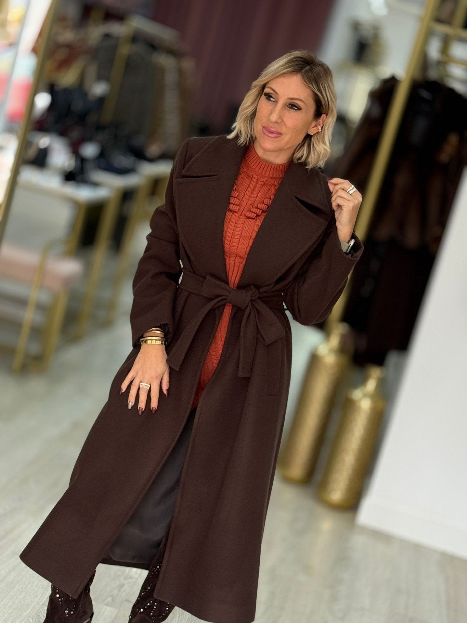 Casaco de fazenda comprido com cinto, desenhado com uma linha elegante e intemporal. O corte estruturado valoriza a silhueta, enquanto o cinto permite ajustar a cintura para um efeito mais feminino. A mistura de materiais, com lã incluída, oferece um toque suave e um conforto térmico subtil, ideal para os dias mais frios. Uma peça clássica e versátil, perfeita para completar looks sofisticados de outono-inverno.