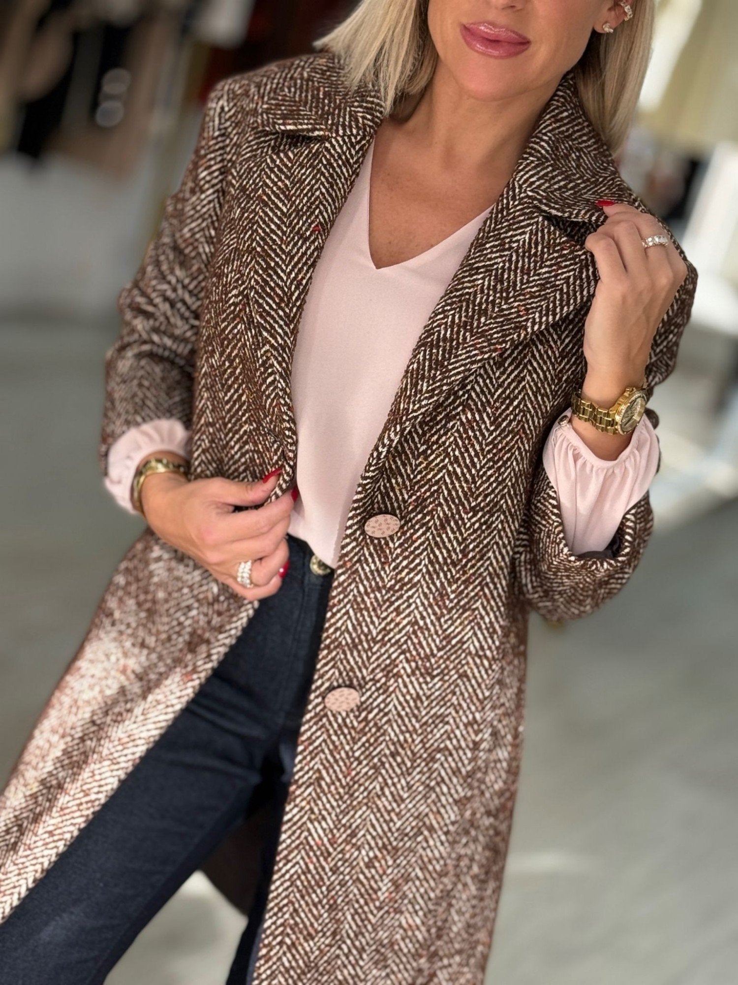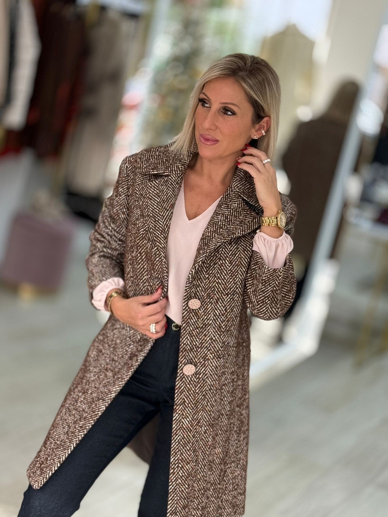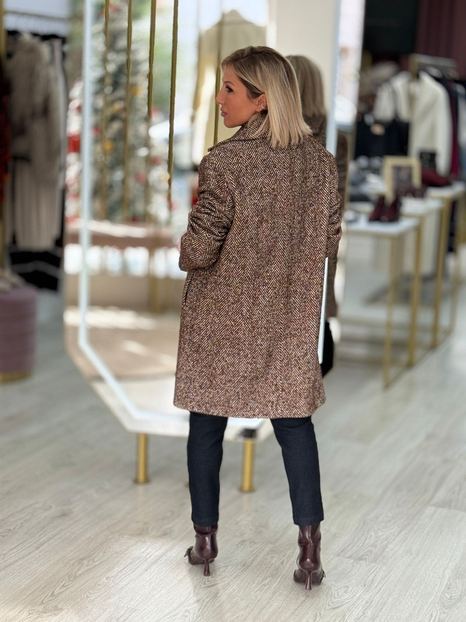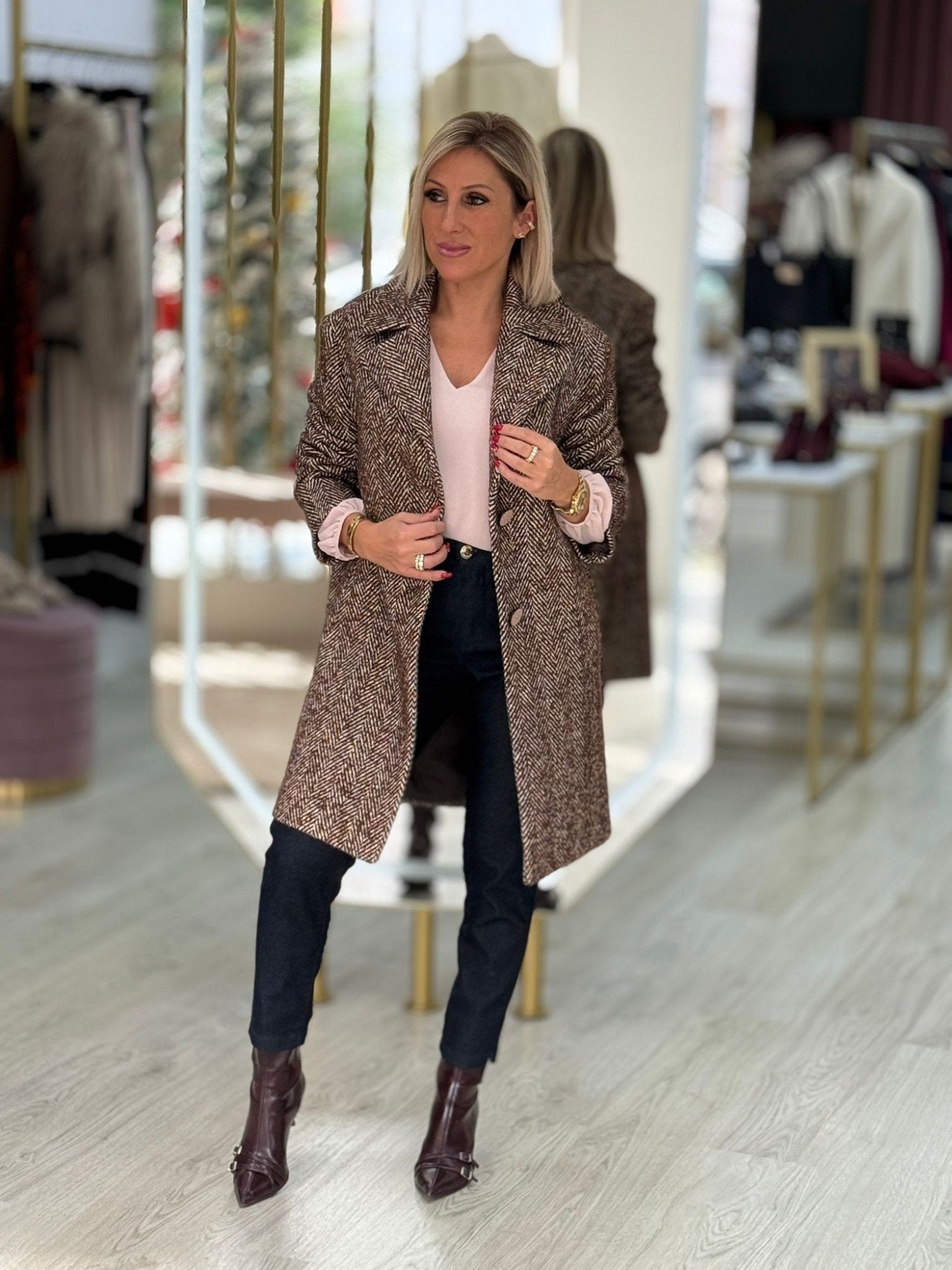Casaco de fazenda em tweed com padrão espinha, de corte clássico e intemporal. Apresenta gola estruturada, manga comprida e fecho frontal com botões, que reforçam o caráter elegante da peça. Totalmente forrado, garante conforto térmico e um excelente caimento. Um casaco versátil e sofisticado, ideal para coordenados de outono-inverno, perfeito tanto para o dia a dia como para ocasiões mais formais.
