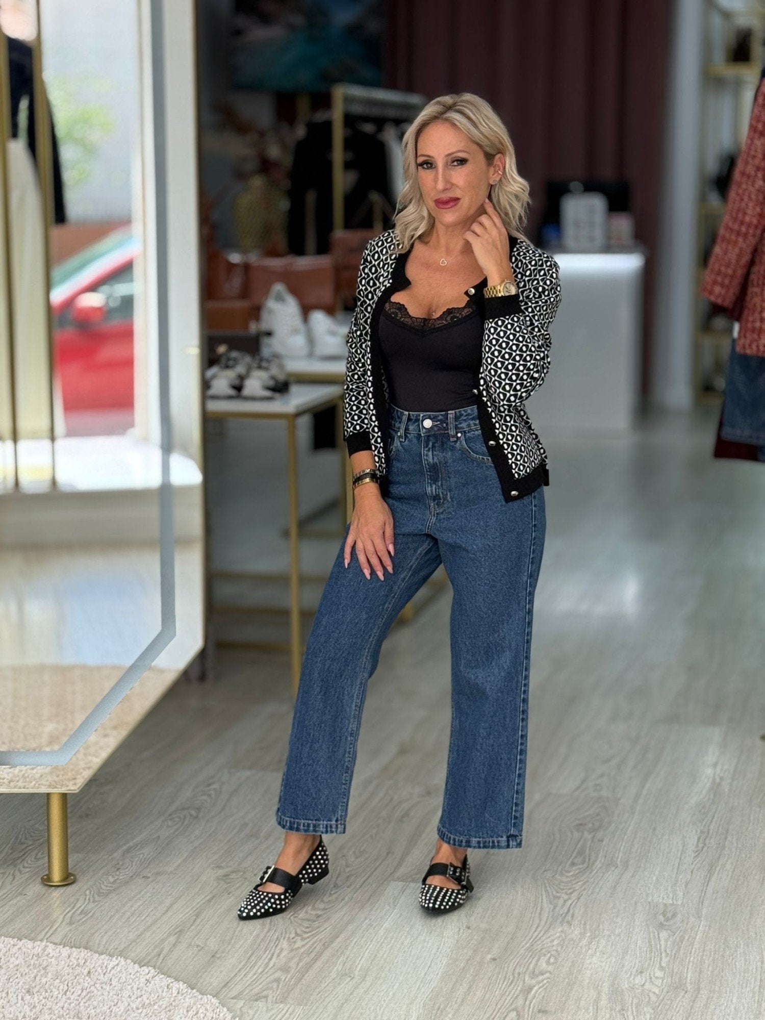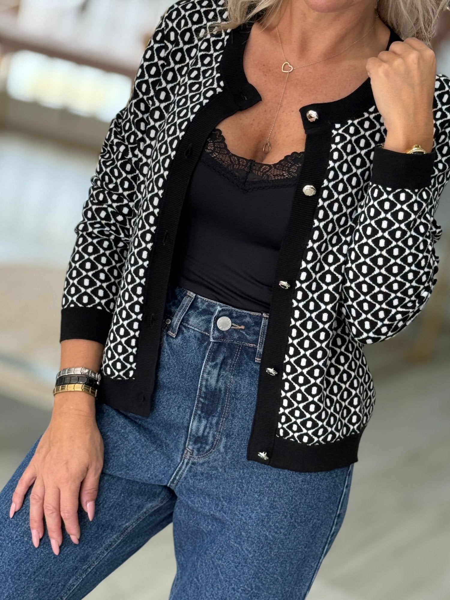 Casaco de malha, numa malha muito macia e fina. Decote redondo. Mangas compridas com punho. Fecha na frente com botões metálicos.