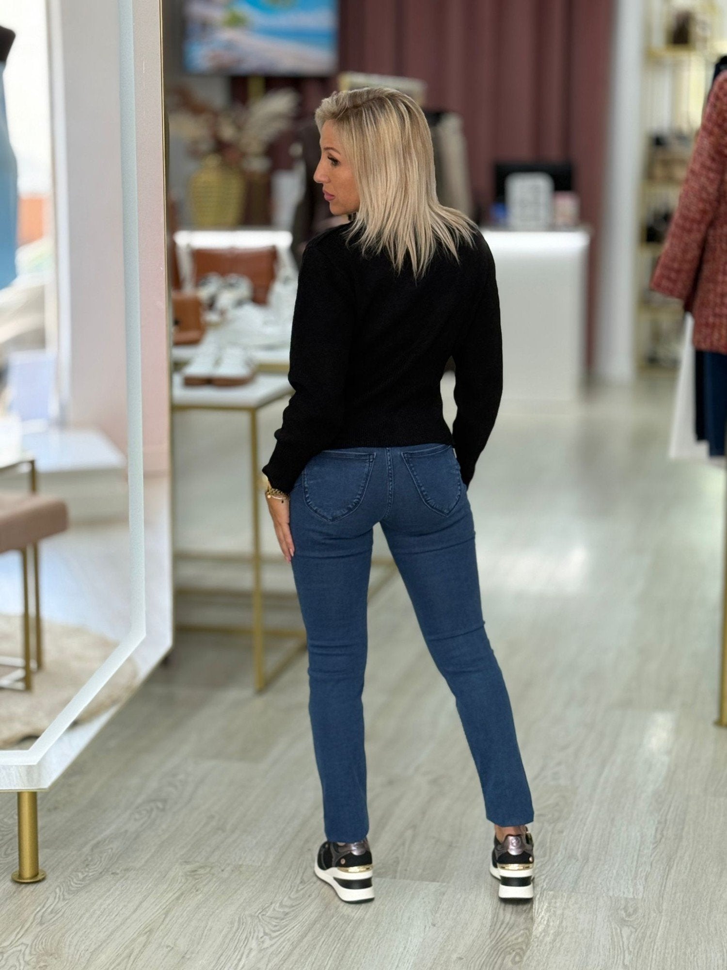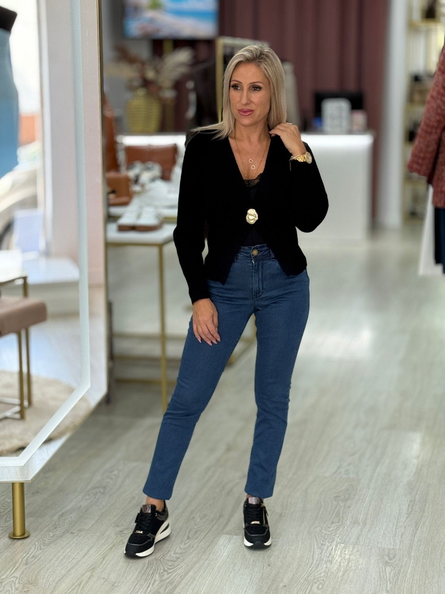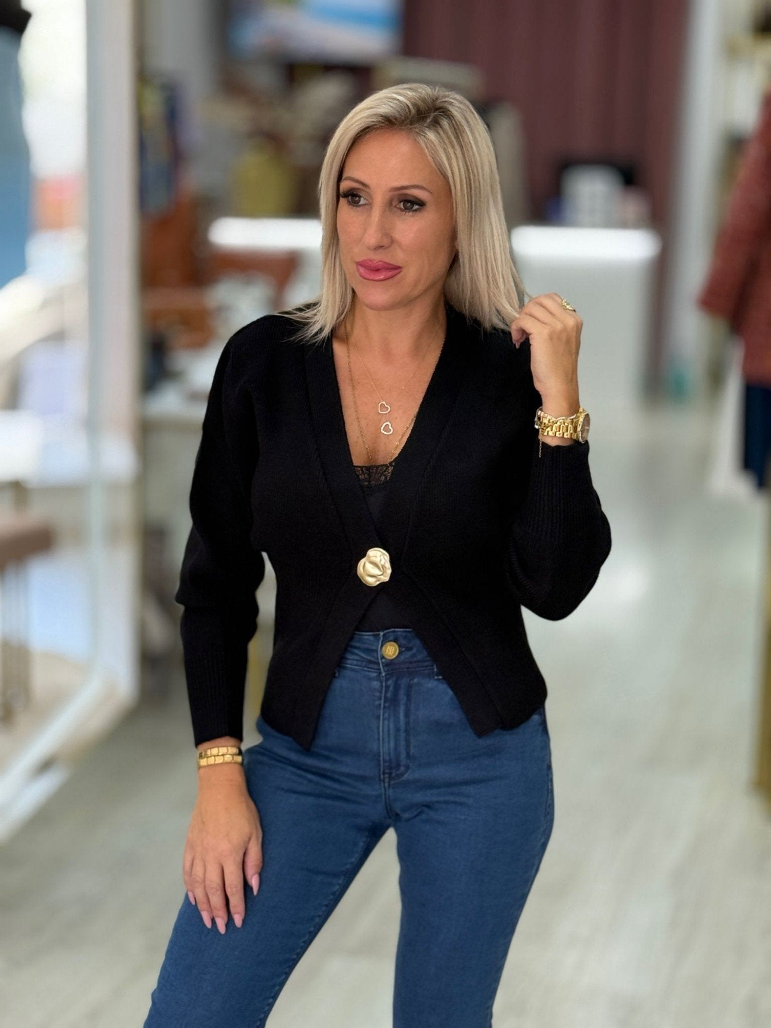 Casaco de malha, com corte curto e elegante. Apresenta decote em V profundo e um único botão dourado oversized que funciona como fecho central e ponto de destaque do design. A estrutura em malha canelada na zona inferior cria um efeito de silhueta moldada, enquanto as mangas compridas com punho dão um acabamento refinado.