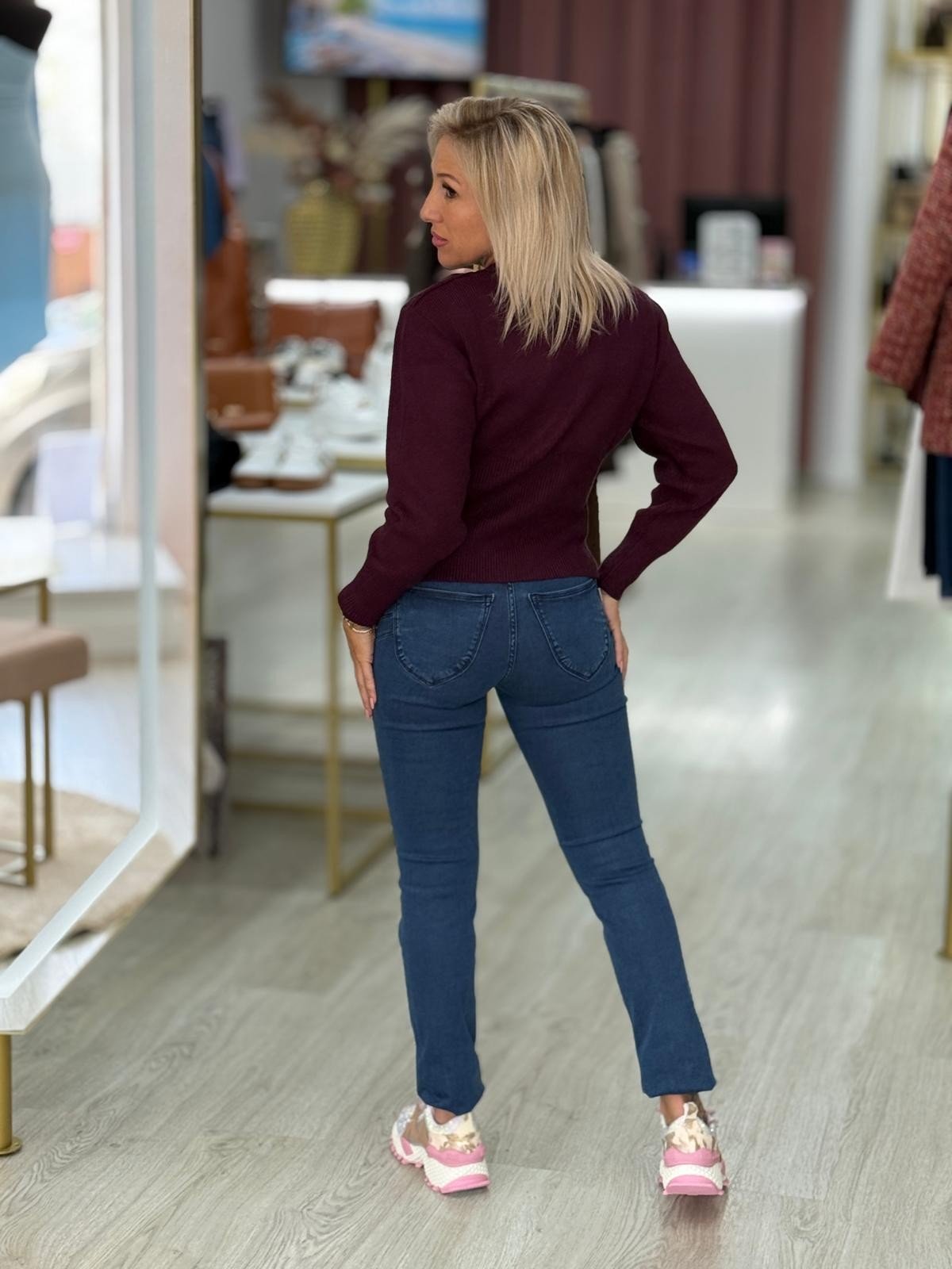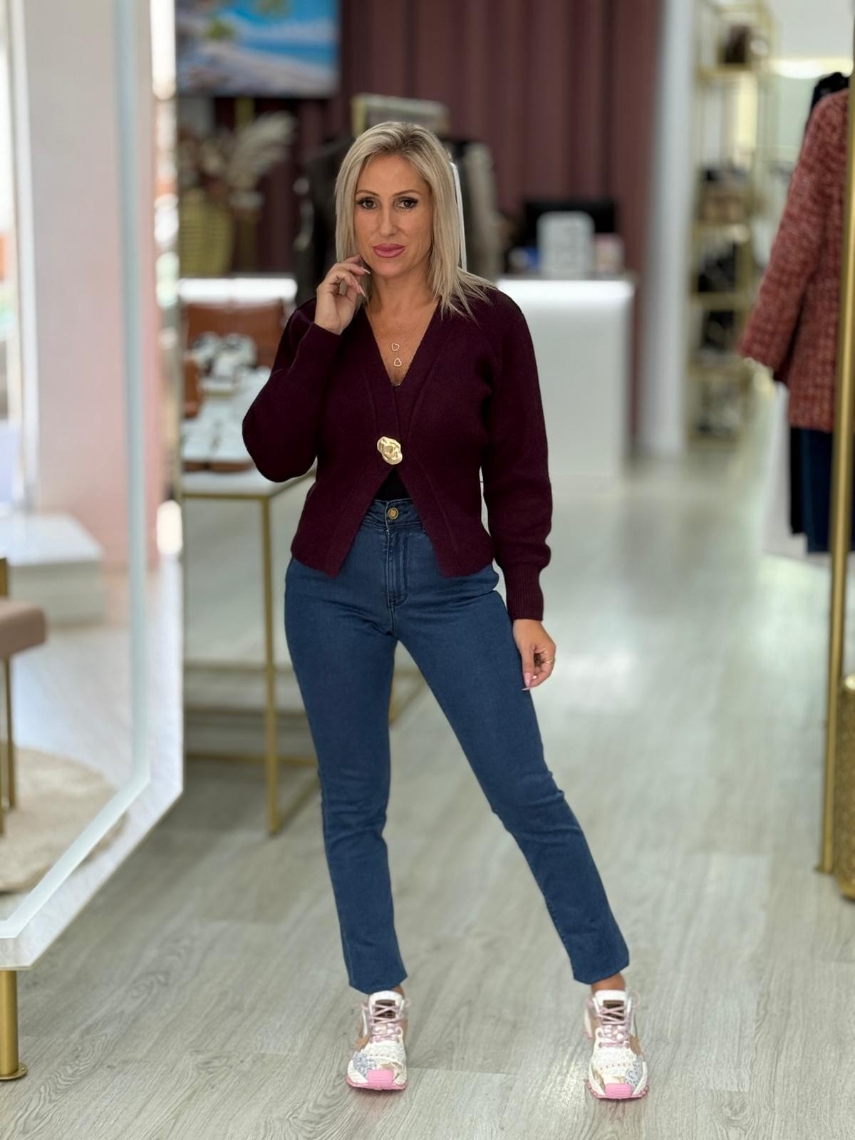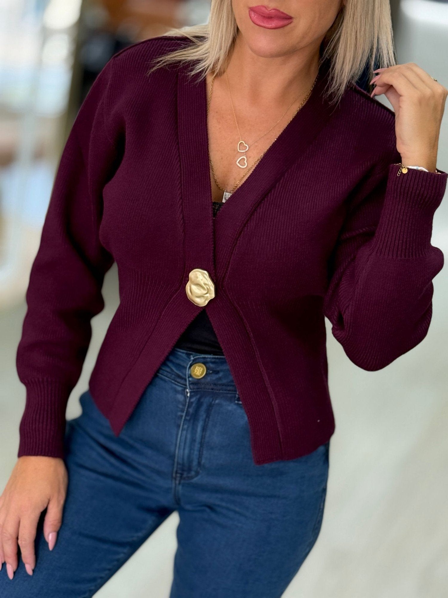 Casaco de malha, com corte curto e elegante. Apresenta decote em V profundo e um único botão dourado oversized que funciona como fecho central e ponto de destaque do design. A estrutura em malha canelada na zona inferior cria um efeito de silhueta moldada, enquanto as mangas compridas com punho dão um acabamento refinado.