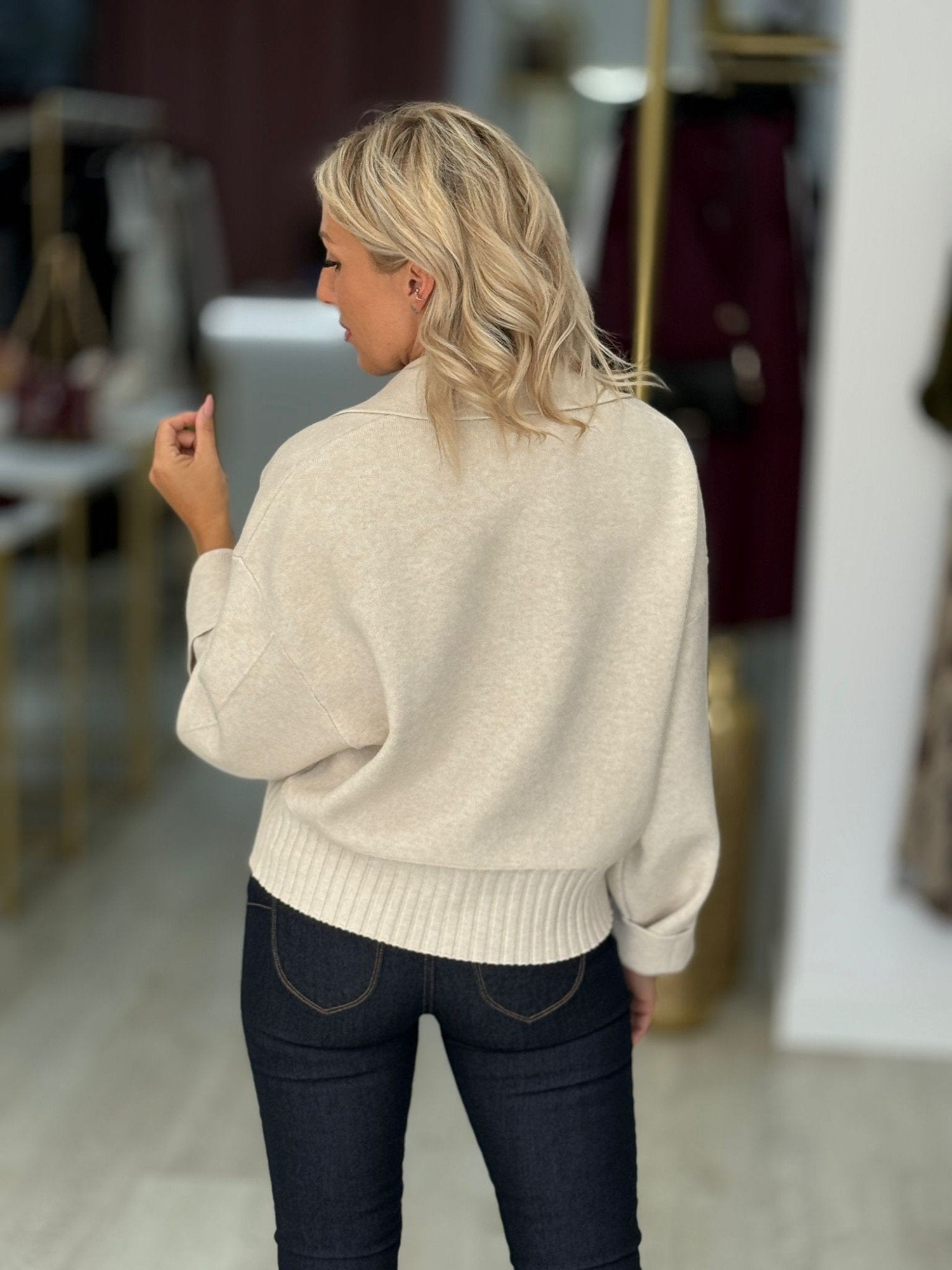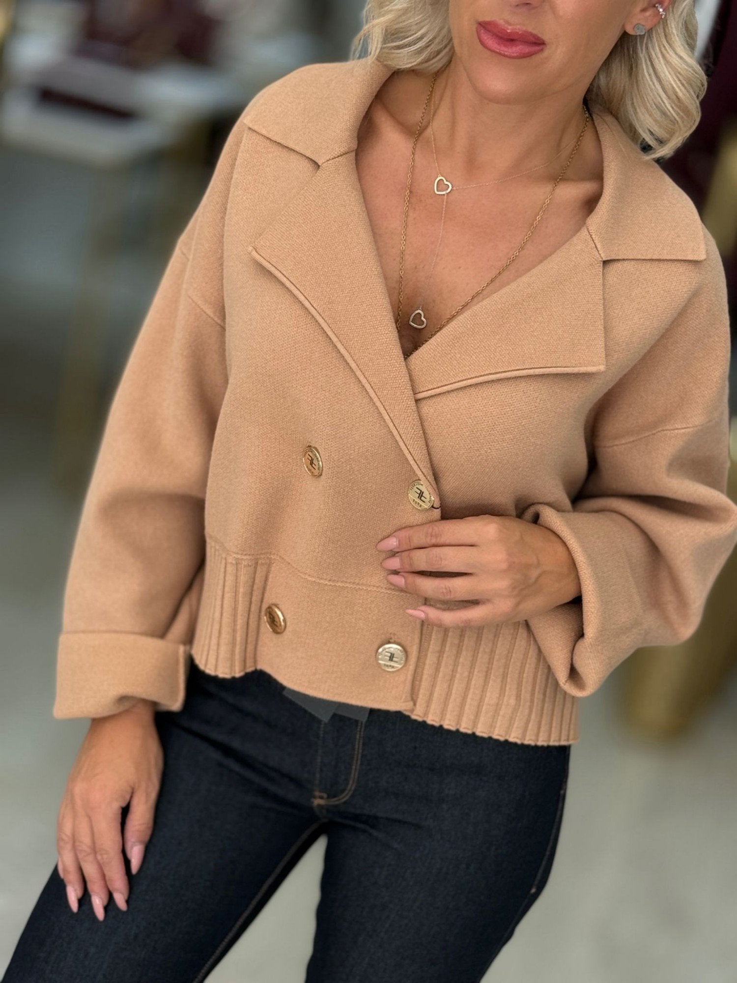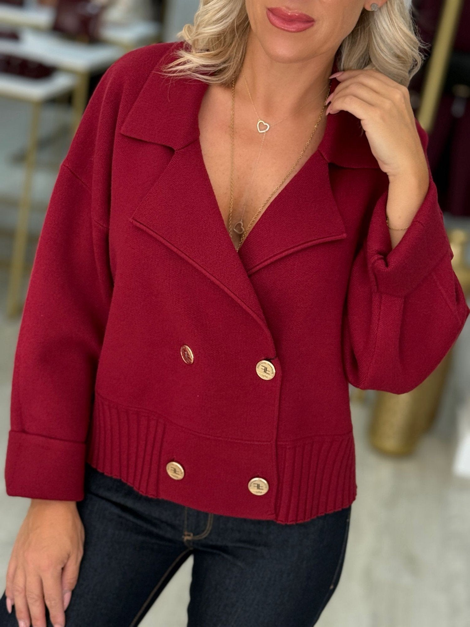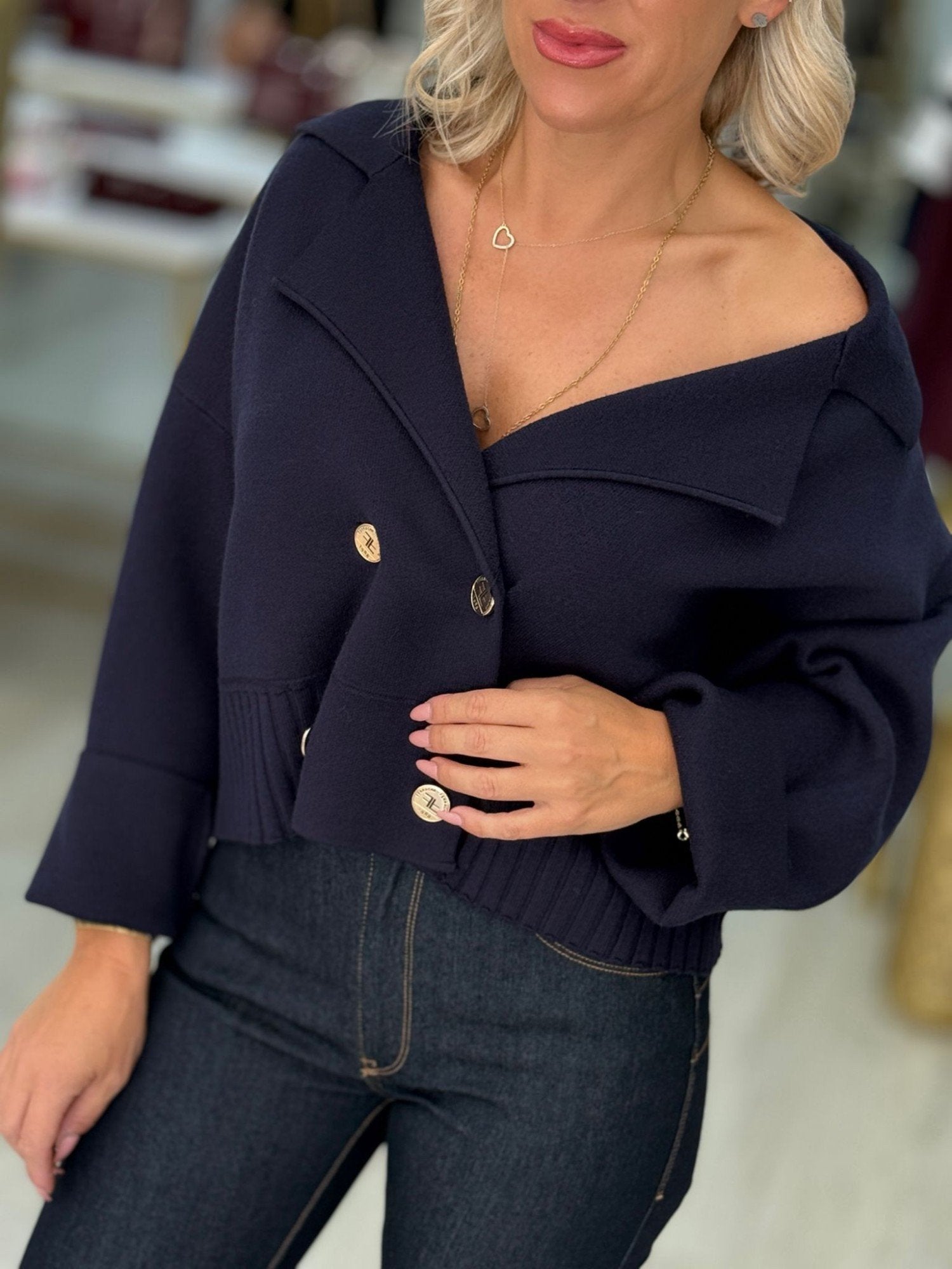 Casaco de malha com design elegante. Fecho em trespasse com botões metálicos personalizados com logotipo, que conferem distinção à peça. A manga comprida garante conforto, enquanto o detalhe canelado na parte frontal inferior acrescenta textura e modernidade. Um essencial sofisticado para coordenados femininos em qualquer ocasião.