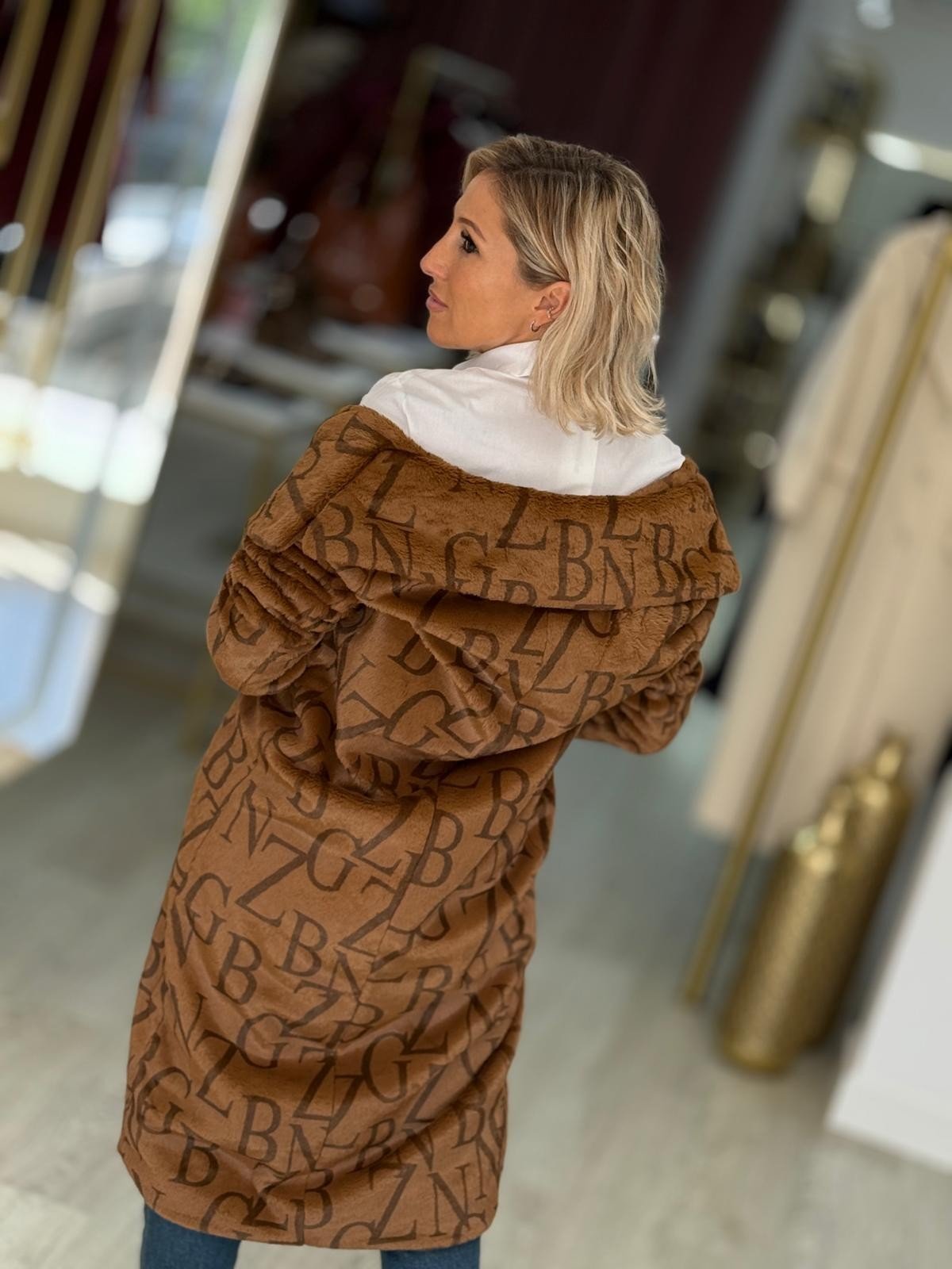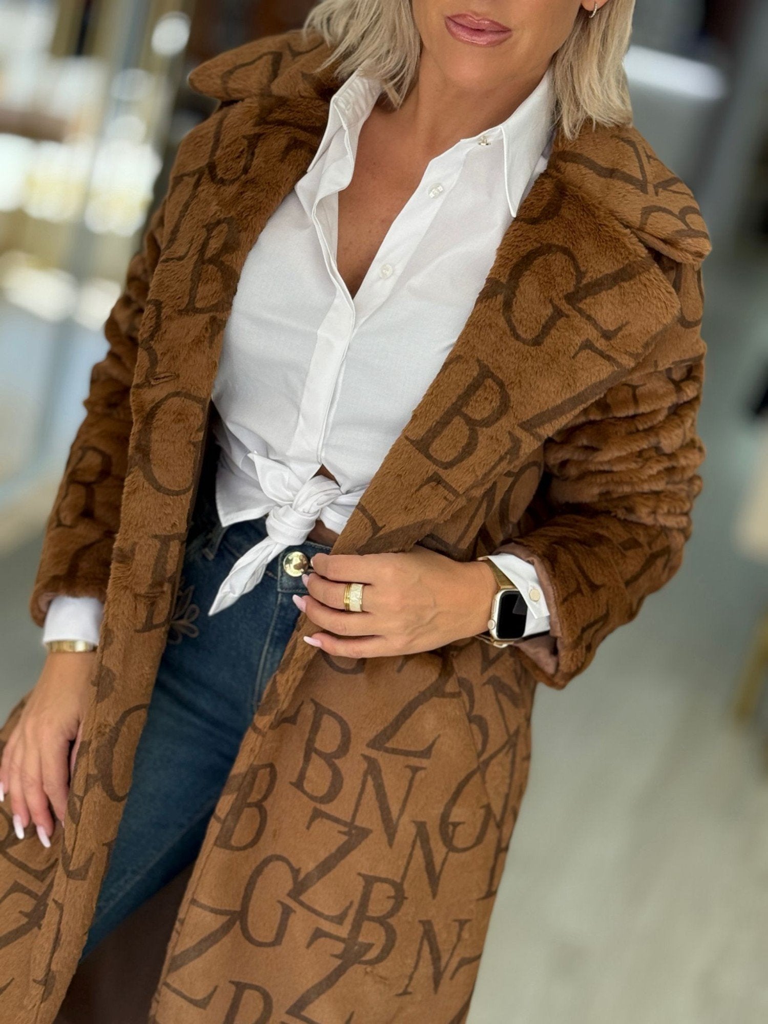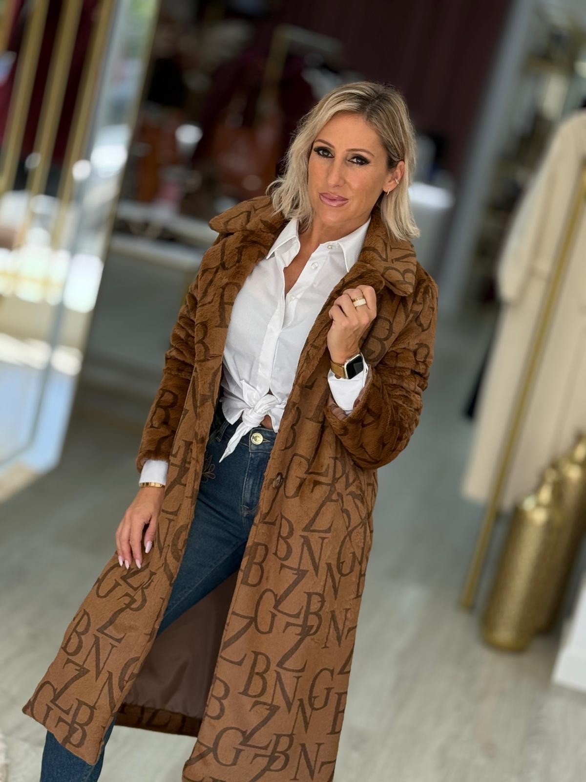 Casaco de pelo com logo da marca, comprido, com gola de lapela. Bolsos laterais discretos. Fecha na frente com botões. Forrado com tecido acetinado.