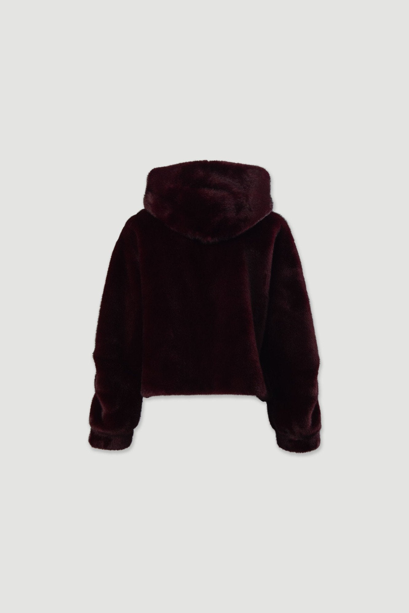 Casaco de pelo curto, de toque extremamente suave, com capuz integrado para um look moderno e aconchegante. Apresenta fecho frontal de correr e efeito de dois bolsos aplicados, que acrescentam um detalhe visual marcante. O corte ligeiramente cropped e a linha ampla garantem conforto e estilo, tornando-o ideal para coordenados urbanos e descontraídos nos dias frios. Uma peça contemporânea, prática e irresistivelmente confortável.