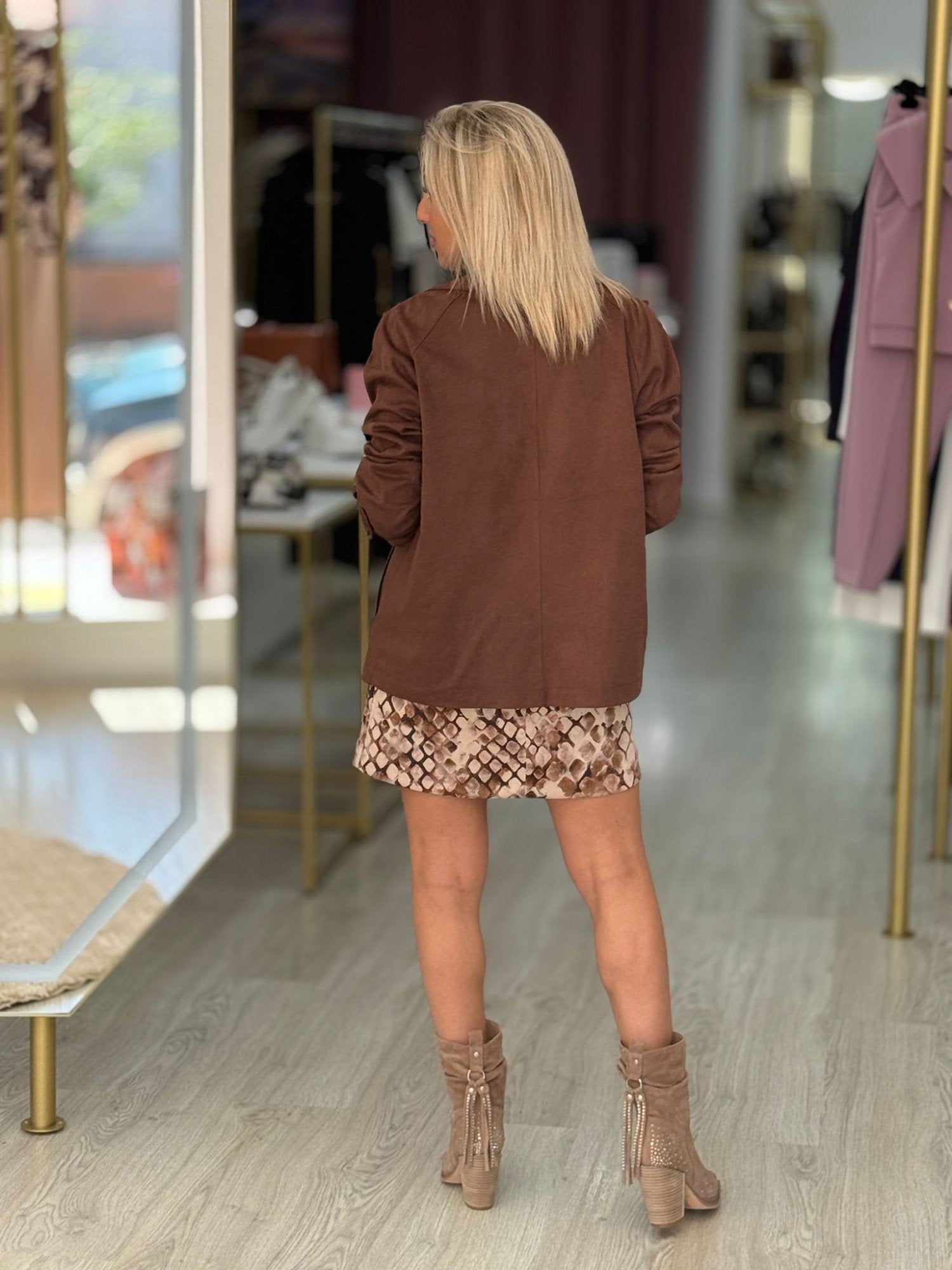 Casaco em pele de pêssego com acabamento macio e elegante. Destaca-se pela gola de lapela clássica e fecho frontal cruzado com dupla fileira de botões, que realça o design moderno e sofisticado. Os bolsos laterais discretos acrescentam praticidade, enquanto os punhos com tira ajustável conferem um toque de detalhe. De corte curto e versátil, é uma peça intemporal que alia conforto e estilo, ideal para compor visuais femininos de meia-estação com requinte.