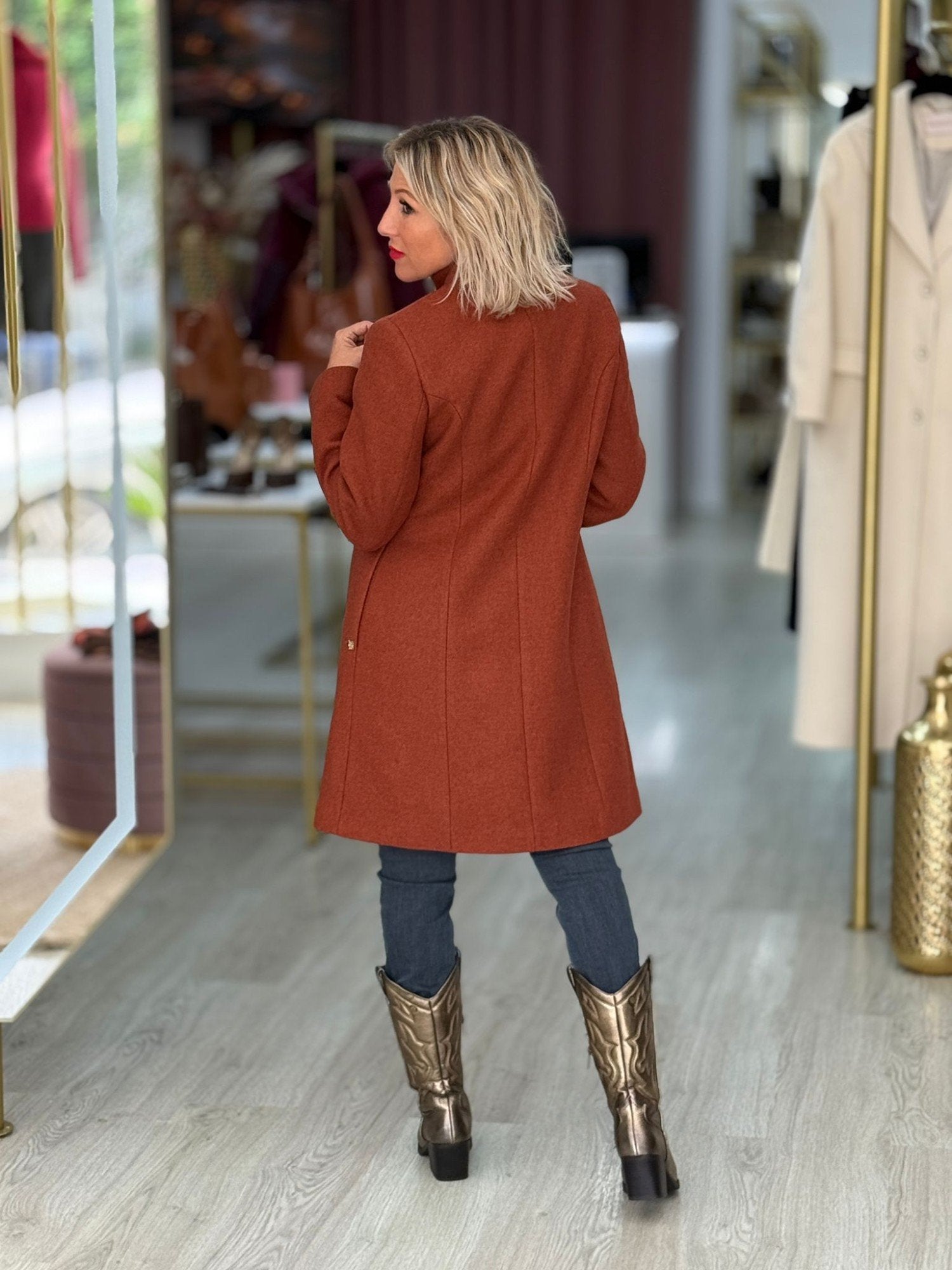 Casaco fazenda, fechamento com botões dourados.
