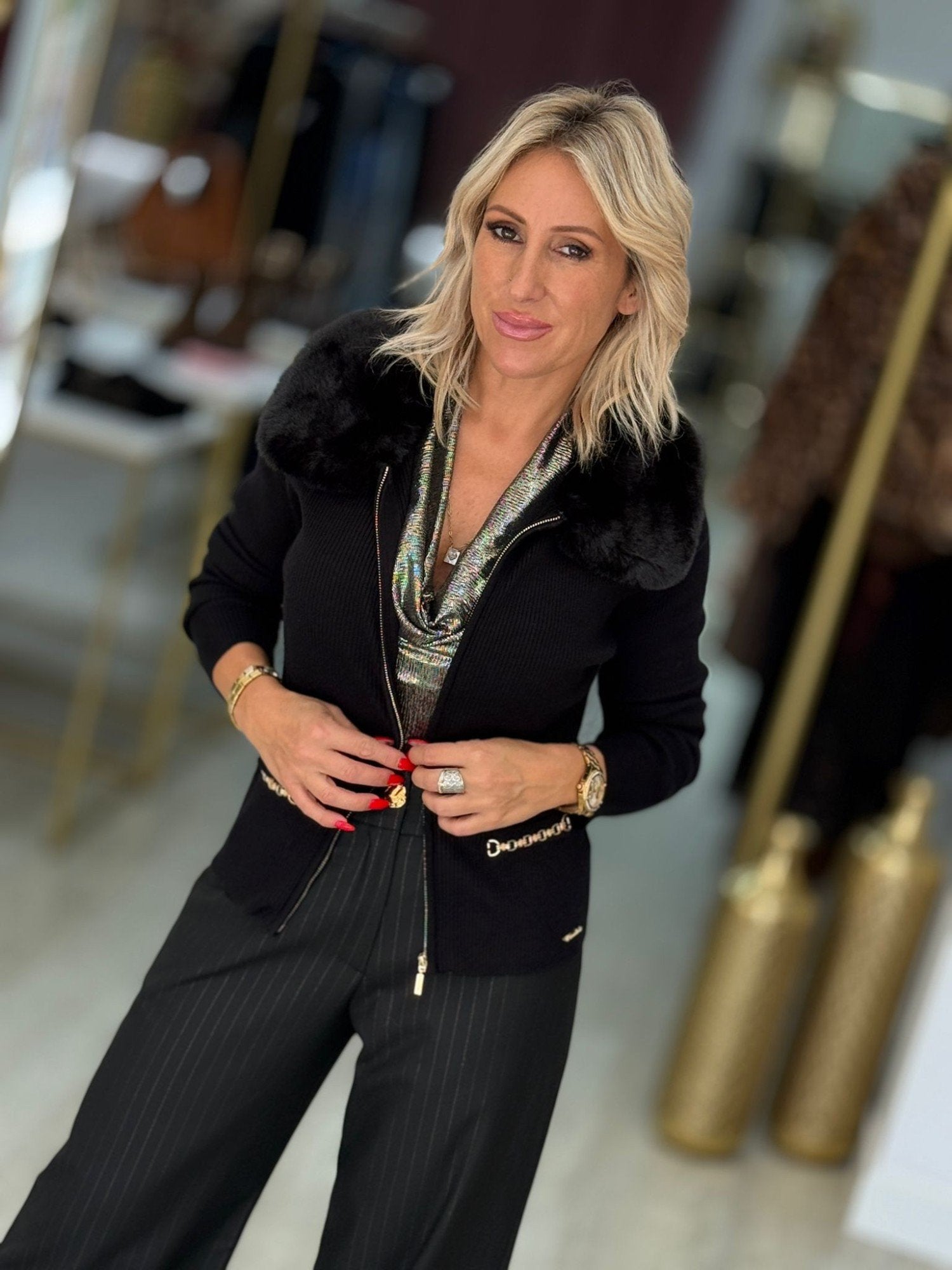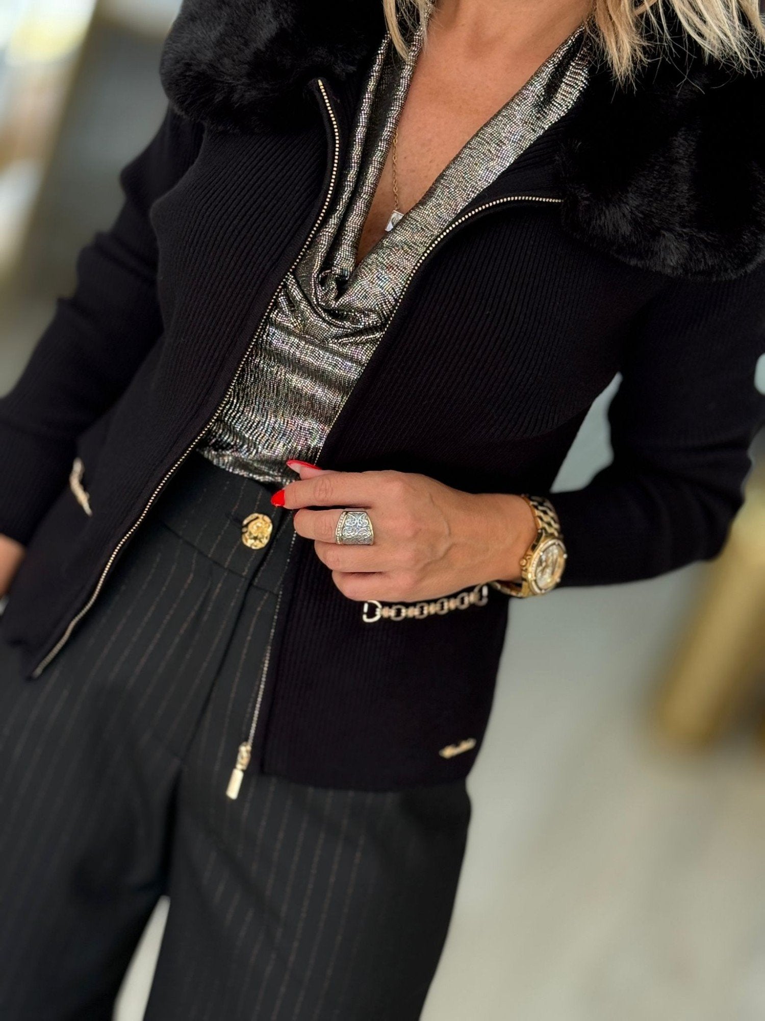 Casaco em malha canelada. Gola de pelo amovível. Aplicação de corrente na frente. Fecha na frente com fecho de correr dourado.