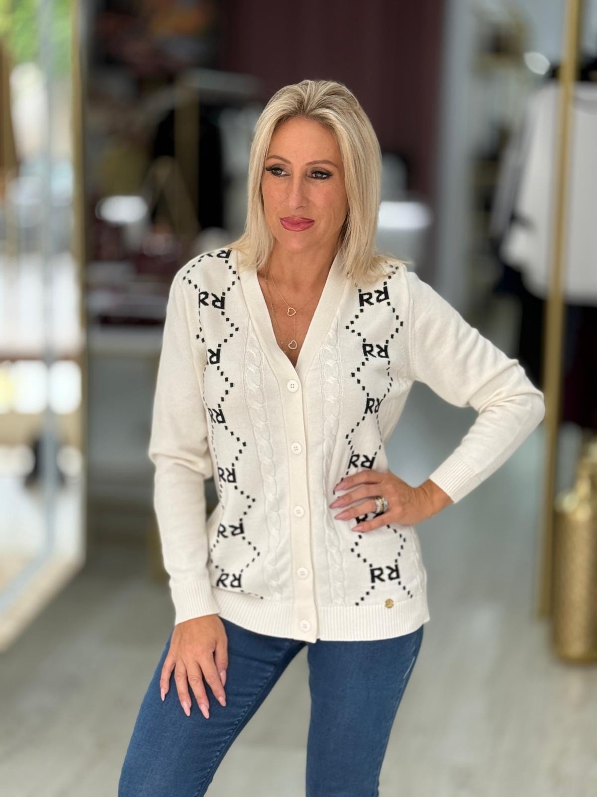 Casaco de malha de decote em V, com entrançada e lettering. Mangas compridas com punhos.