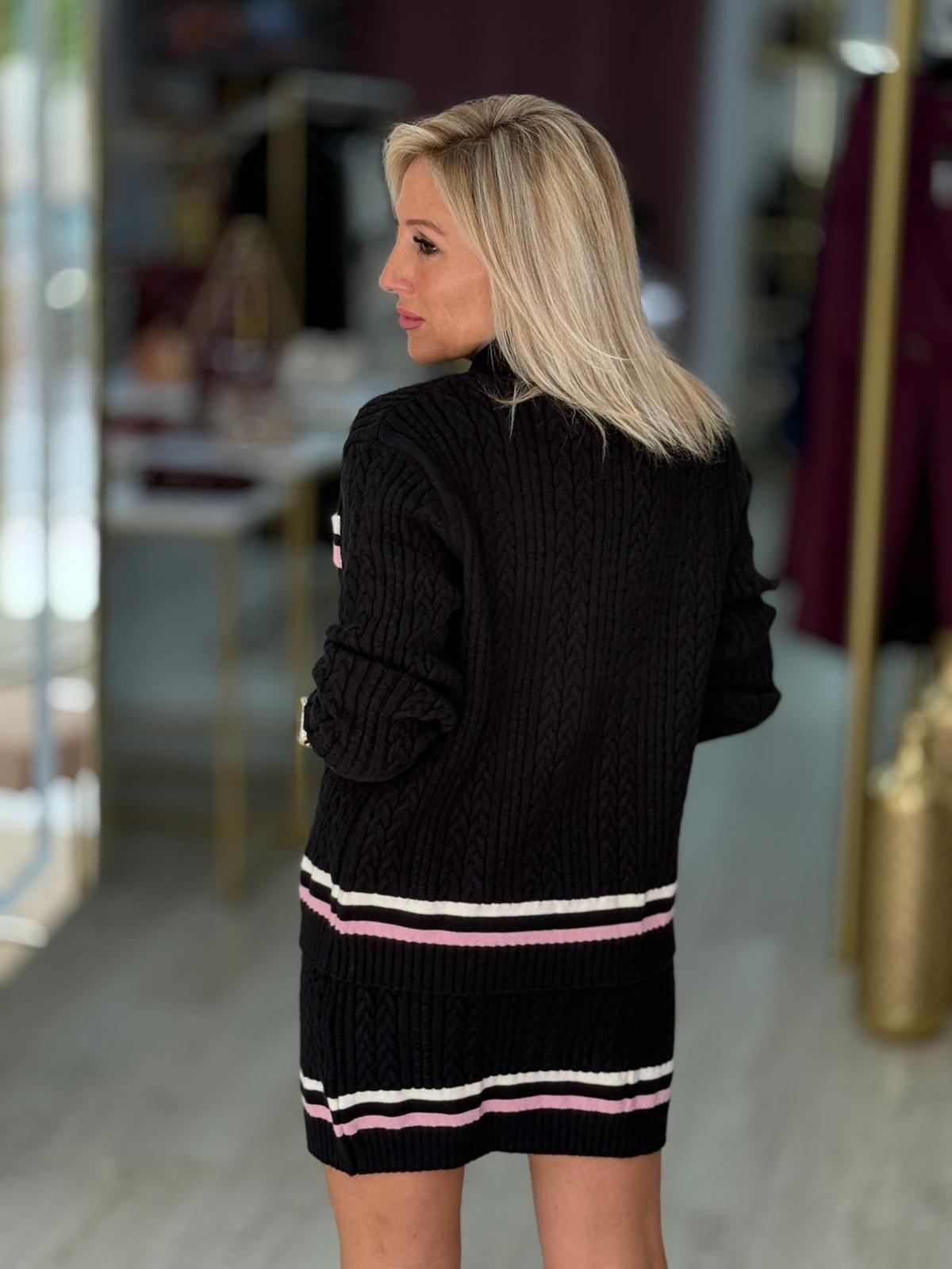 Casaco trabalhado tranças. Com riscas nos bolsos, fundo e punhos. Aperta na frente com botões personalizados.