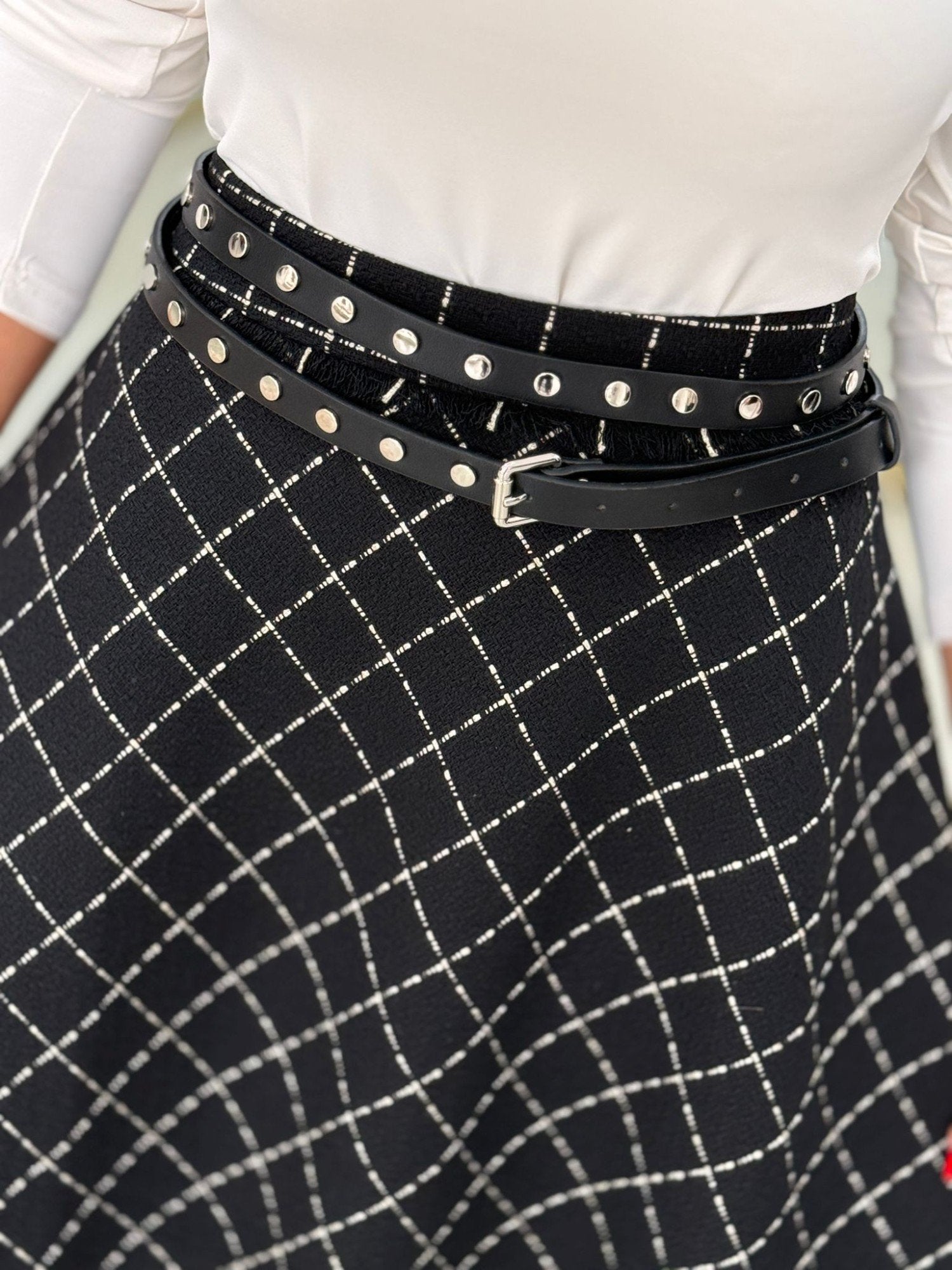 Cinto com tachas em prata. O cinto dá duas voltas.