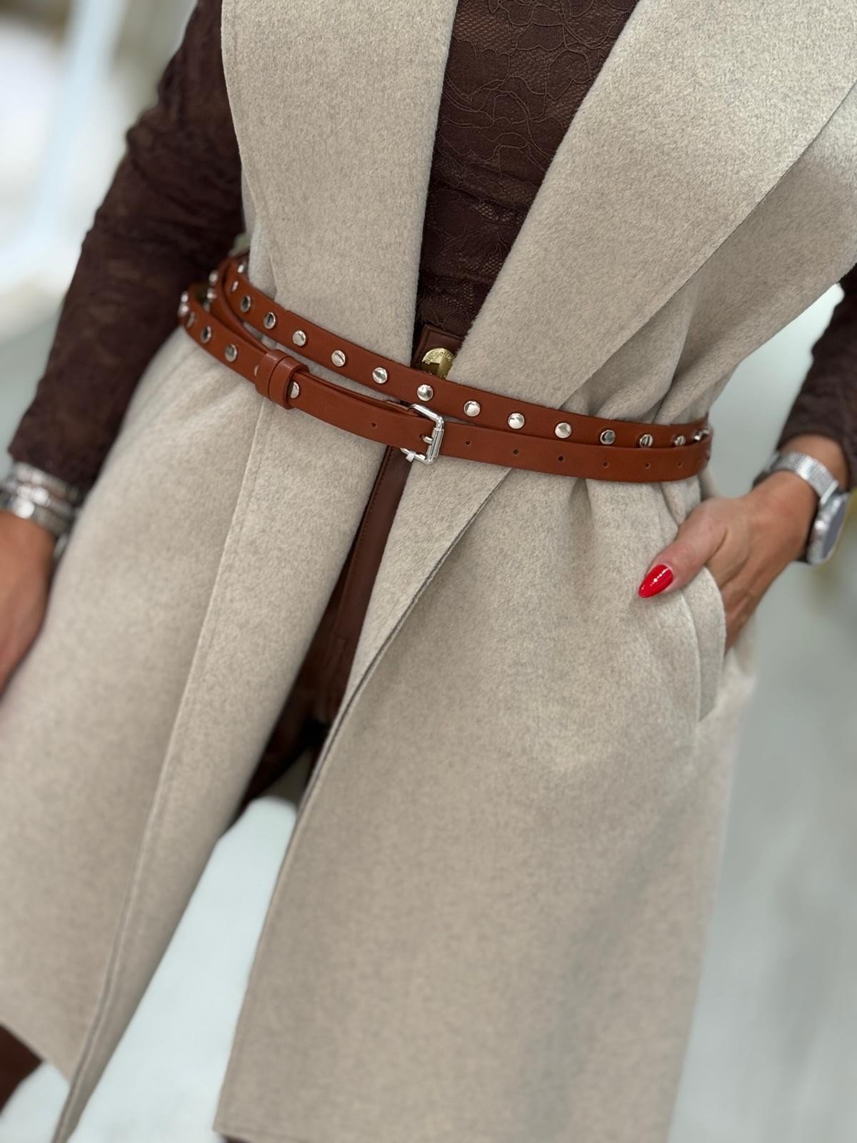 Cinto com tachas em prata. O cinto dá duas voltas.