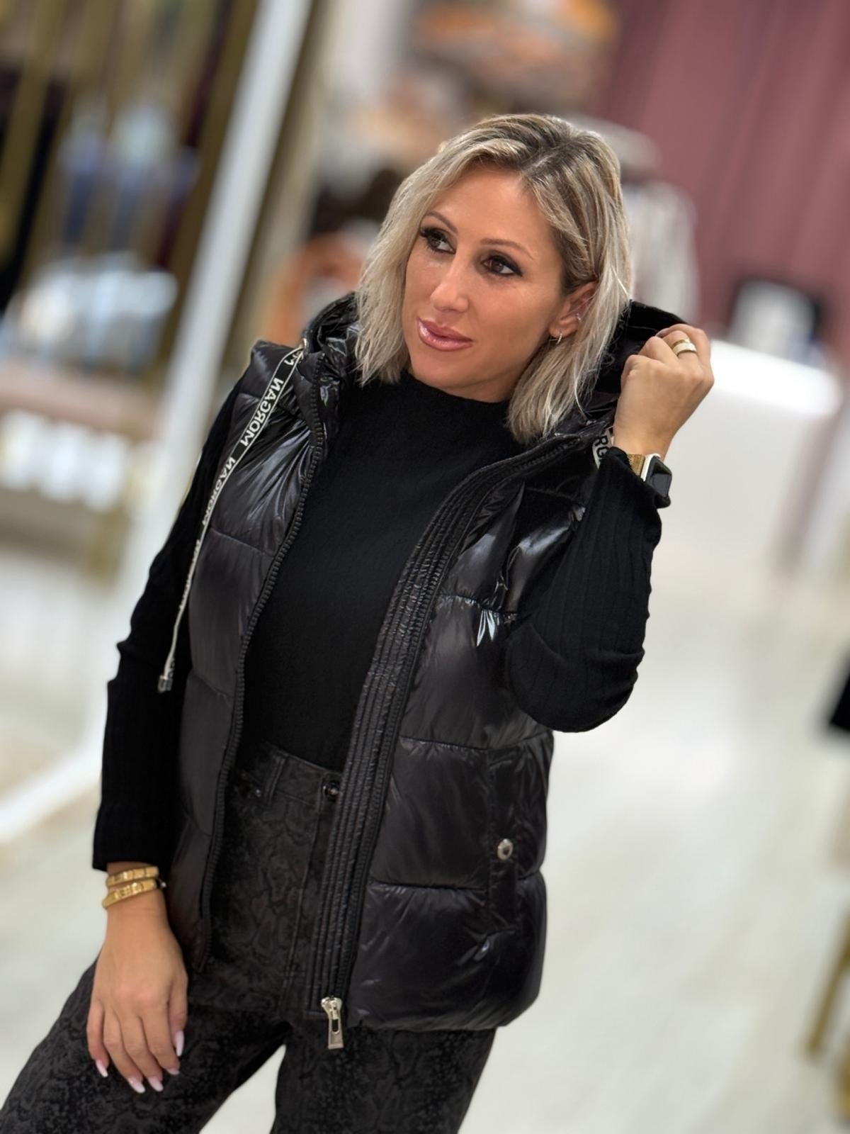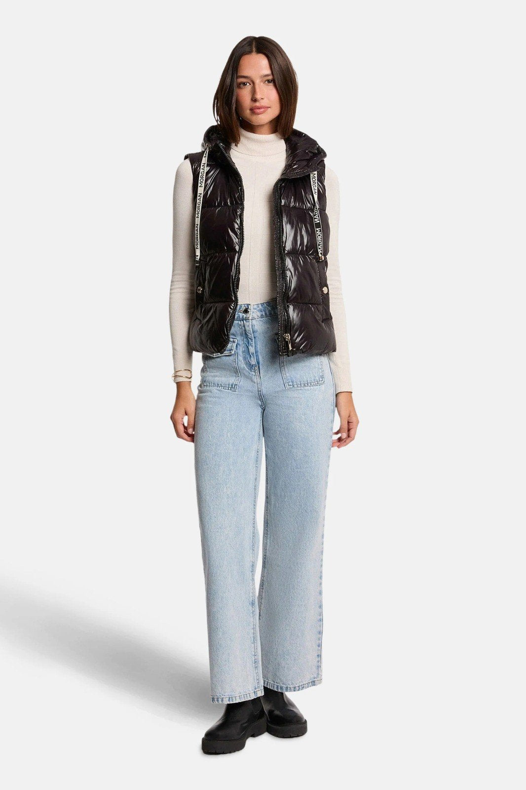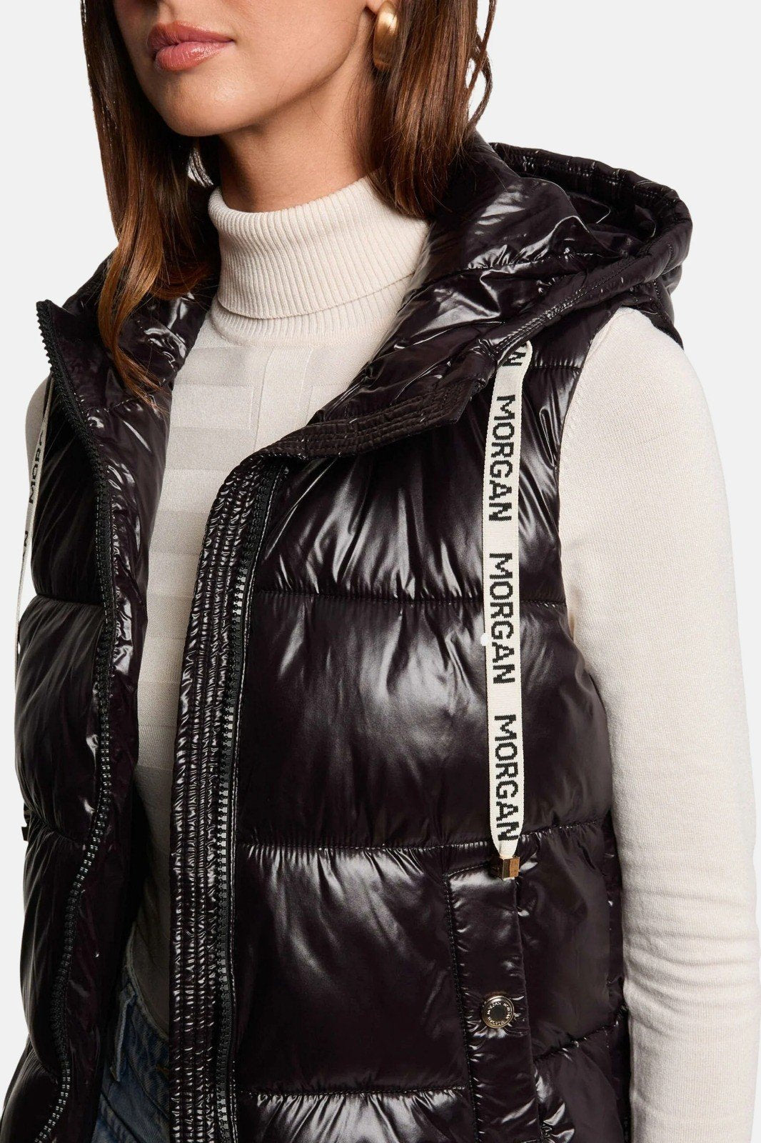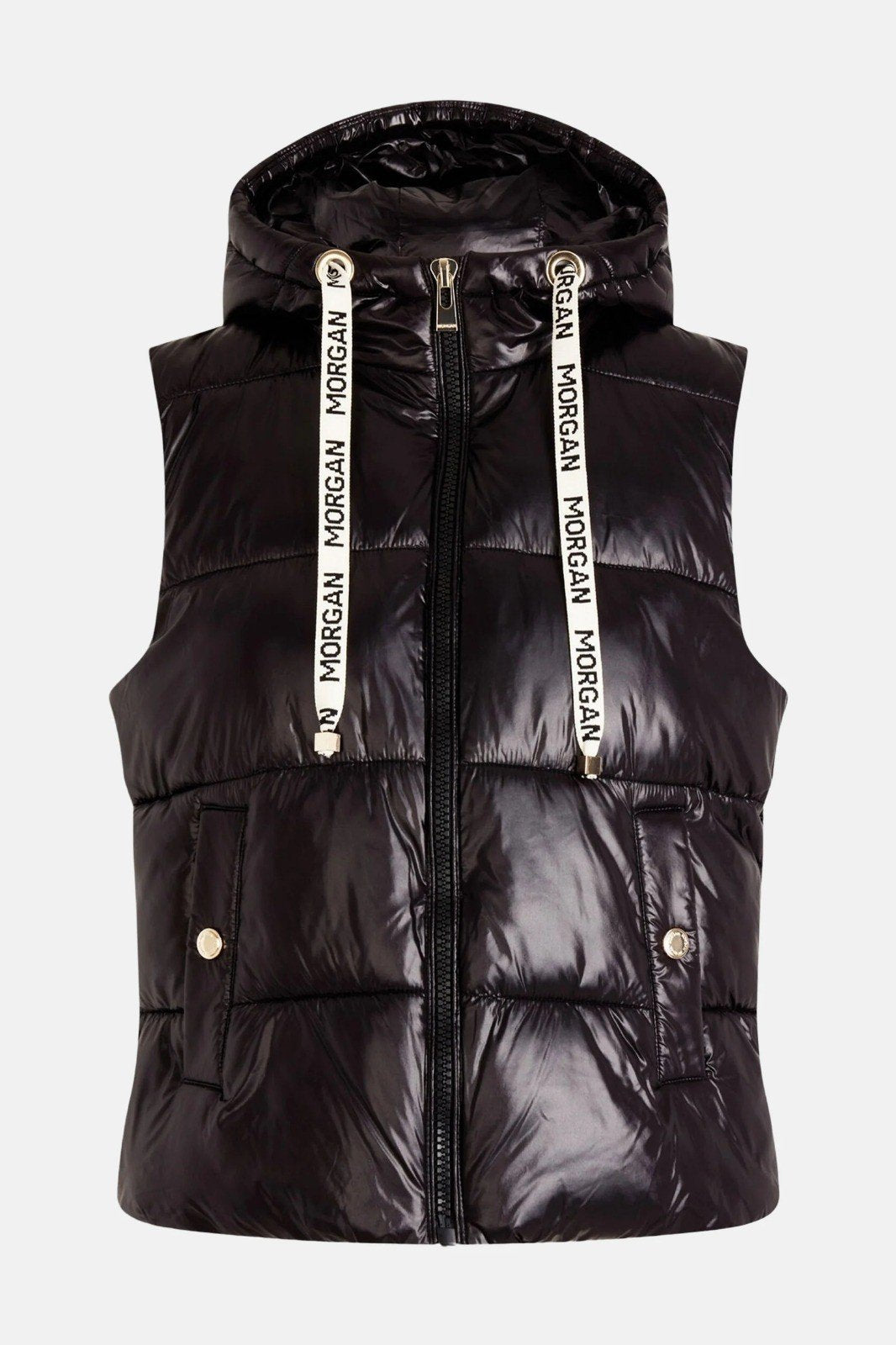 Colete acolchoado com efeito vinil. Gola alta. Fechamento com fecho de correr frontal. Dois bolsos com botão na frente. Capuz.