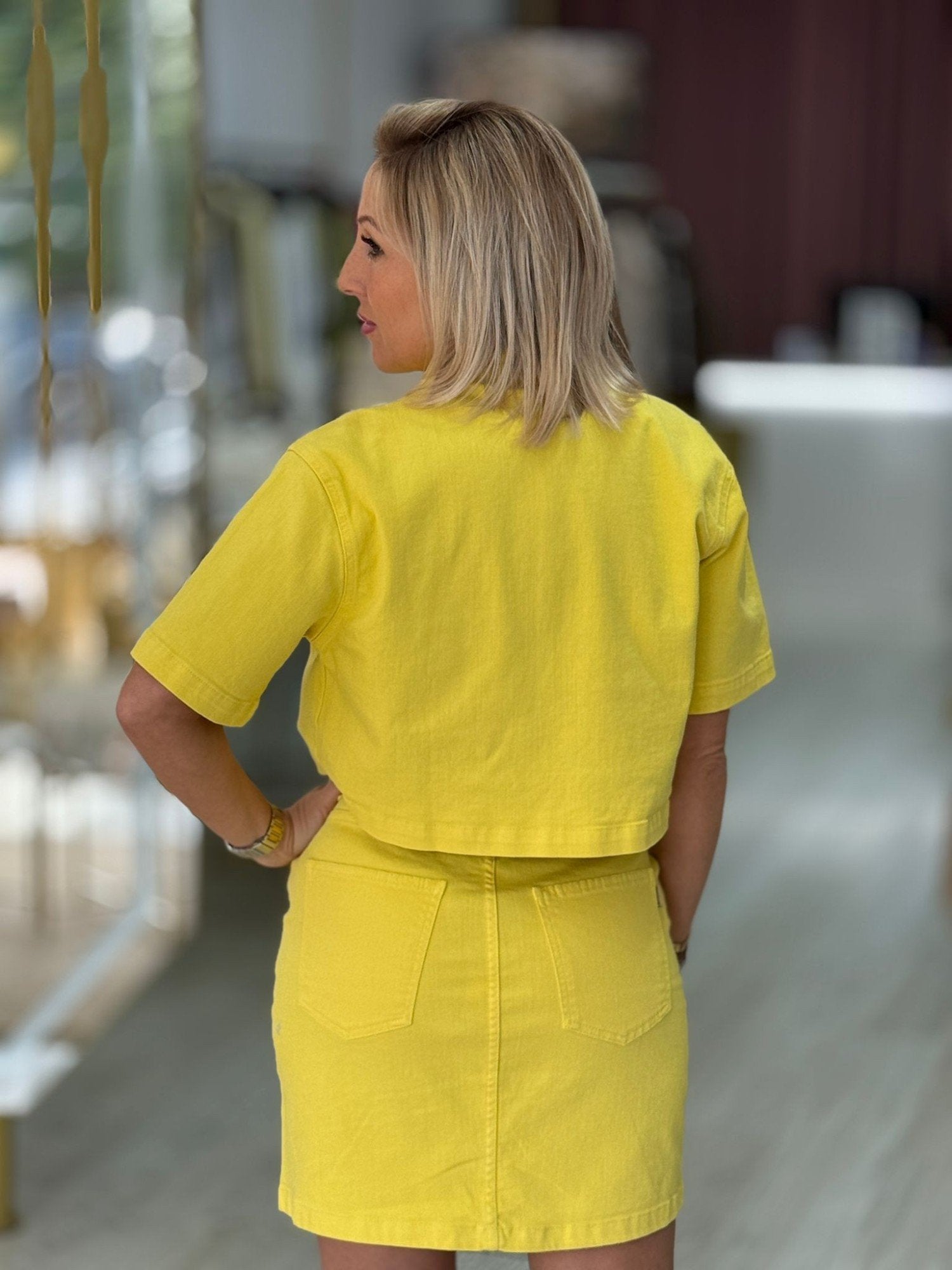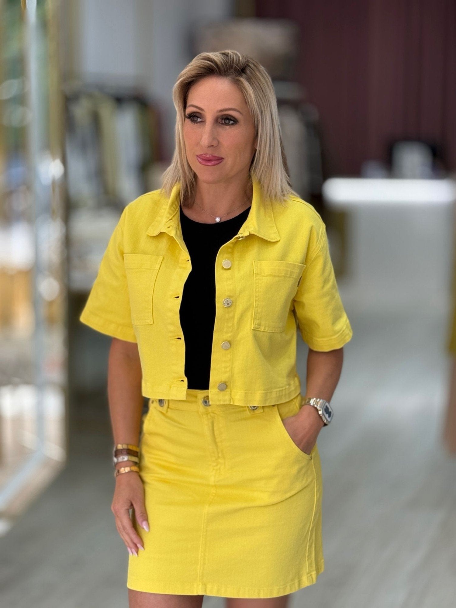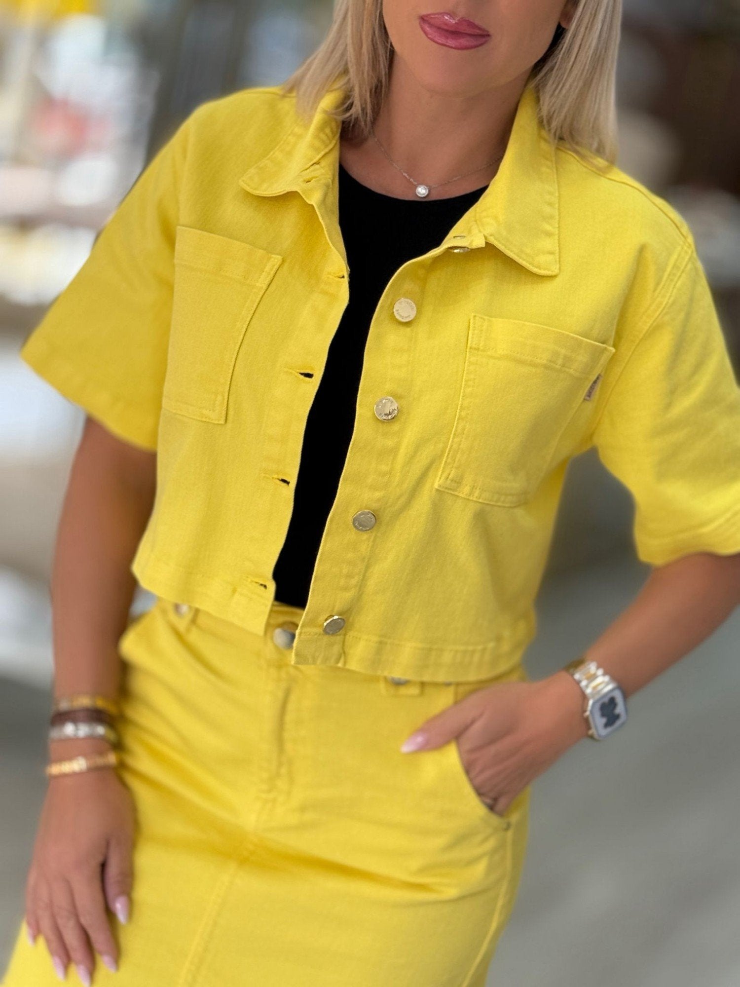 Jaqueta cropped com colarinho. Manga curta. Bolsos de chapa na frente. Fecha na frente com botões.