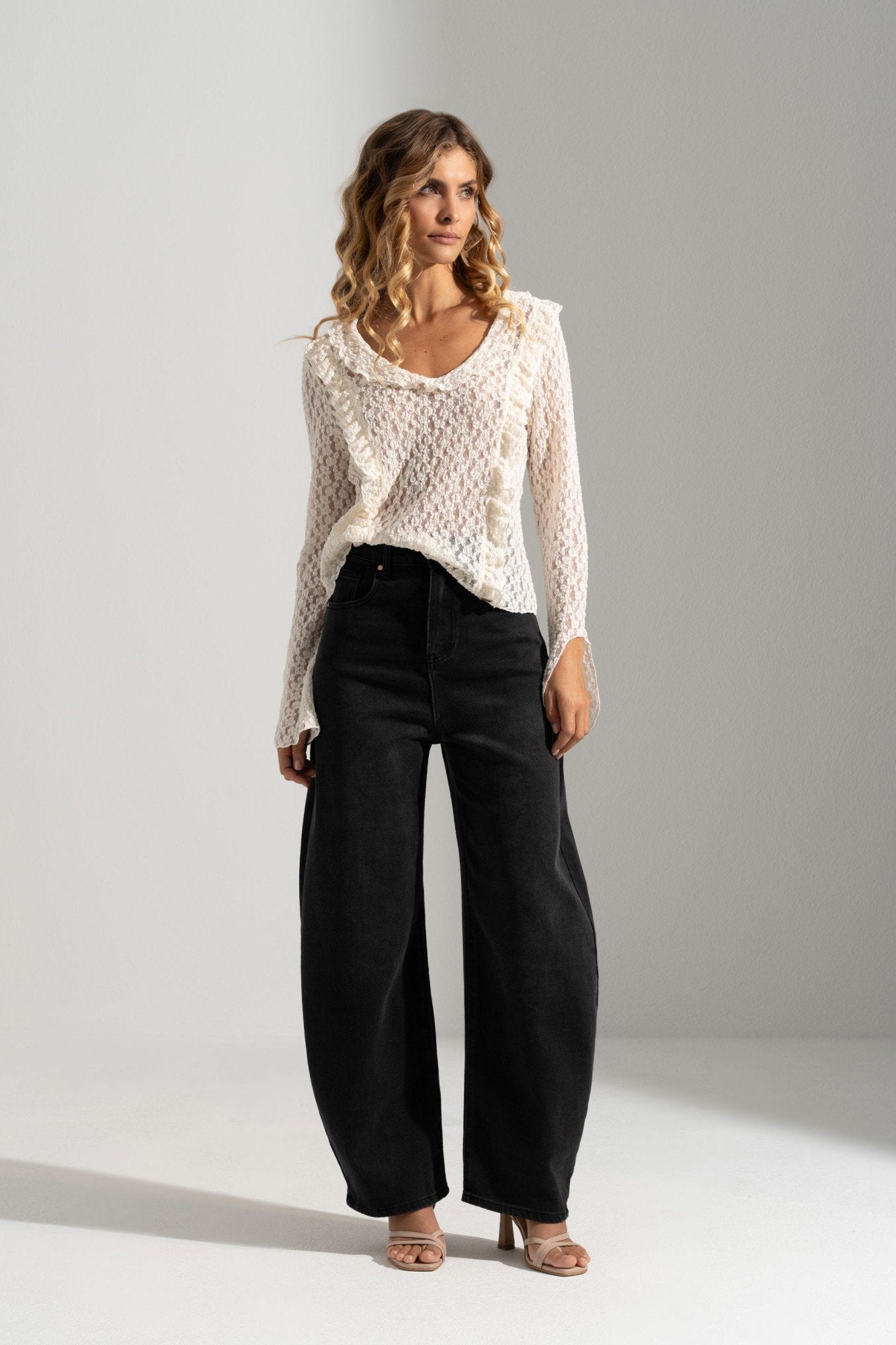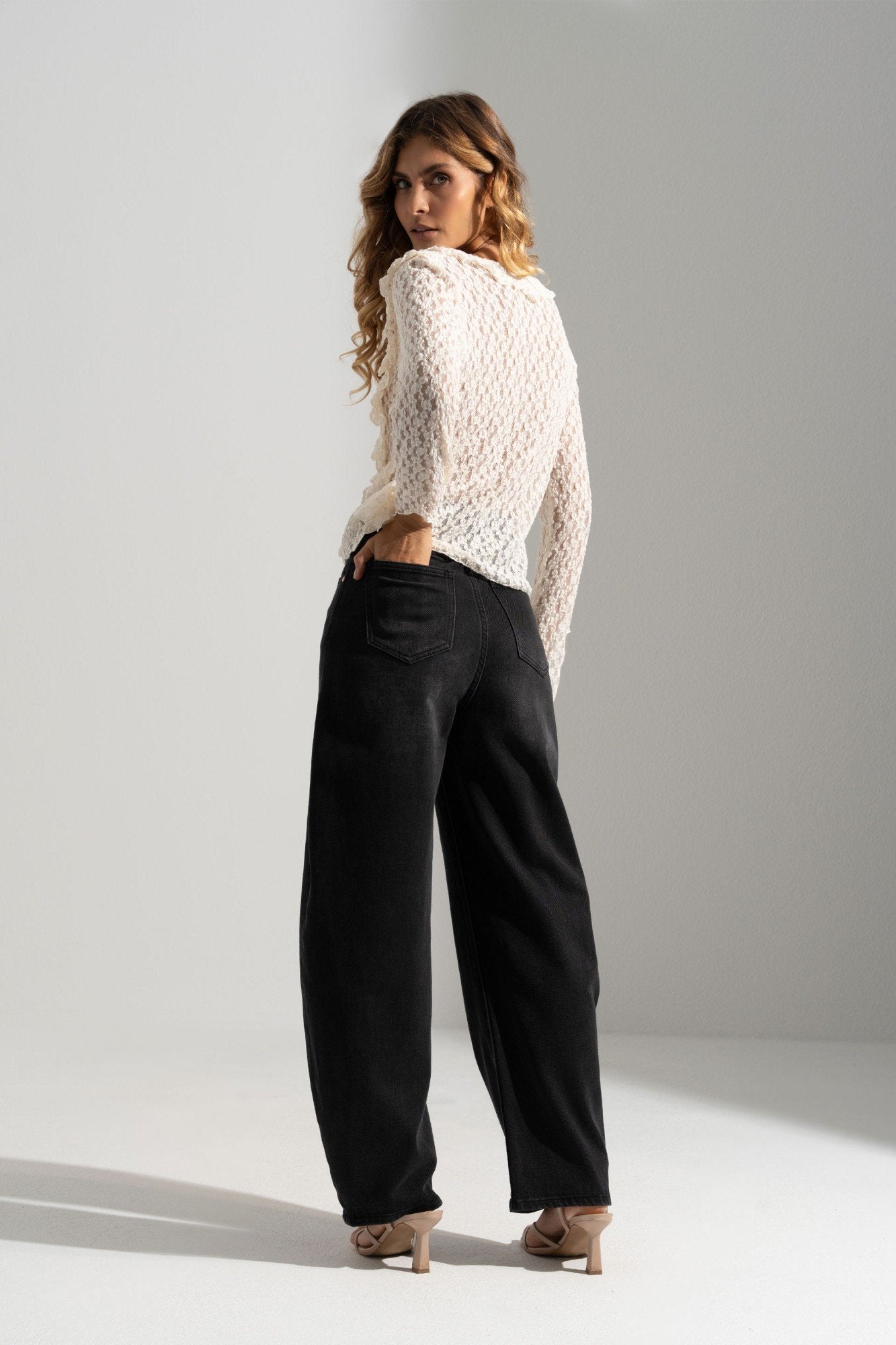 Jeans estilo balloon em algodão, com cintura subida e um corte moderno que cria volume subtil na perna, garantindo um look atual e cheio de personalidade. Modelo de cinco bolsos, com presilhas para cinto e fecho frontal com fecho de correr e botão. Perfeitos para conjugar com tops justos, malhas ou camisas para um contraste elegante.