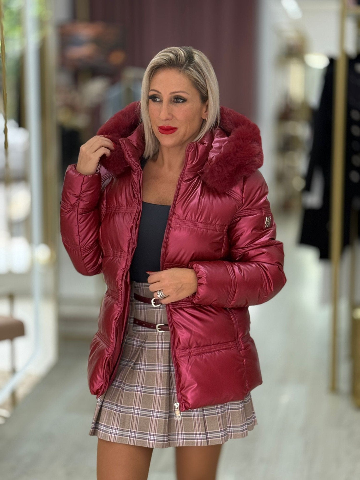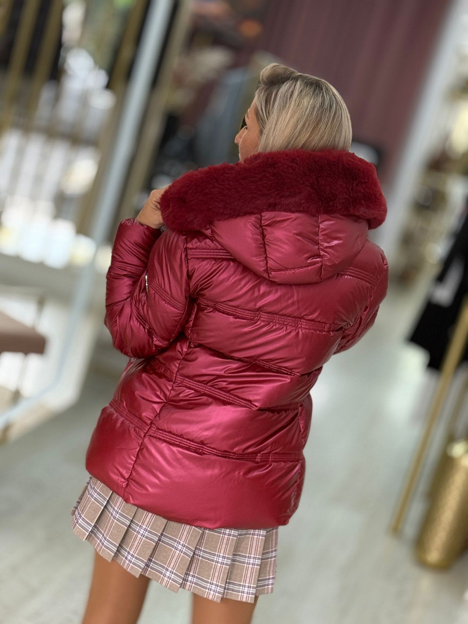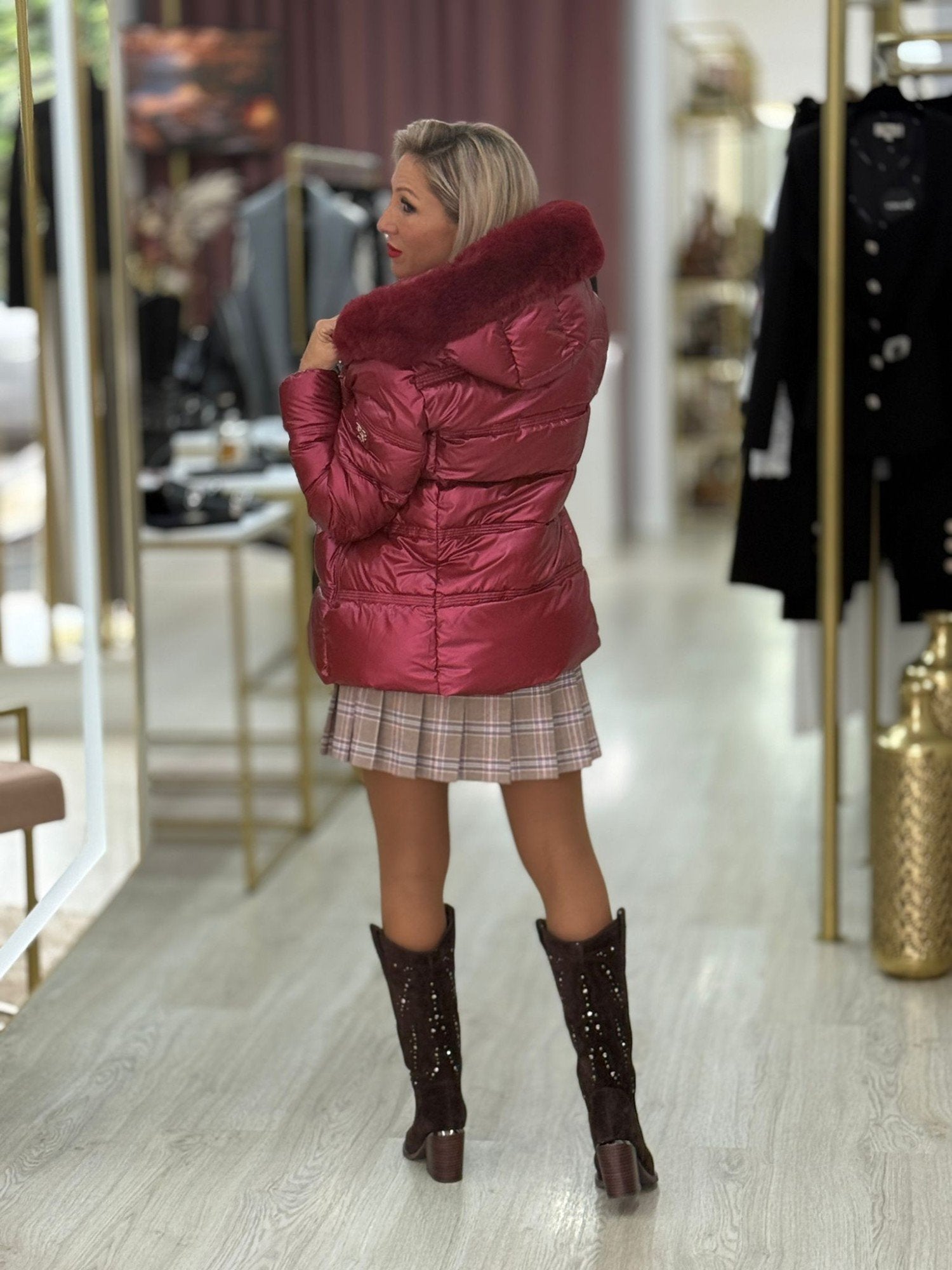 Kispo acolchoado com capuz com pelo. Capuz amovível. Bolsos laterais que fecham com fecho de correr. Fecha na frente com fecho de correr.