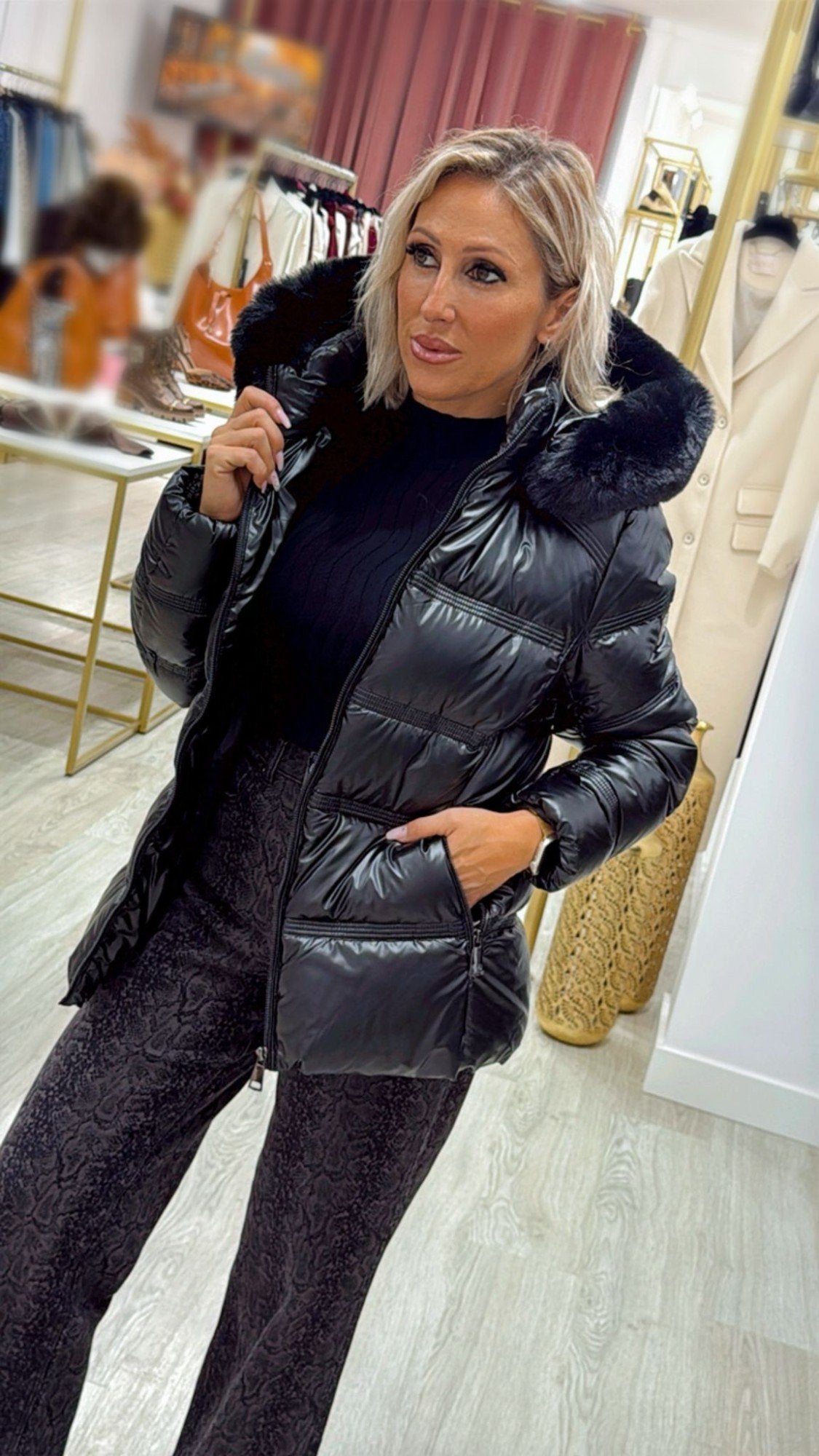 Kispo acolchoado com capuz com pelo. Capuz amovível. Bolsos laterais que fecham com fecho de correr. Fecha na frente com fecho de correr.