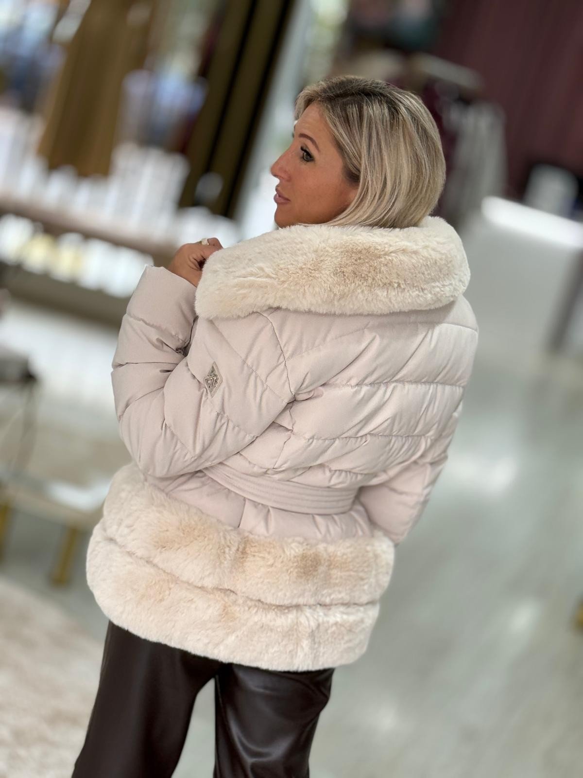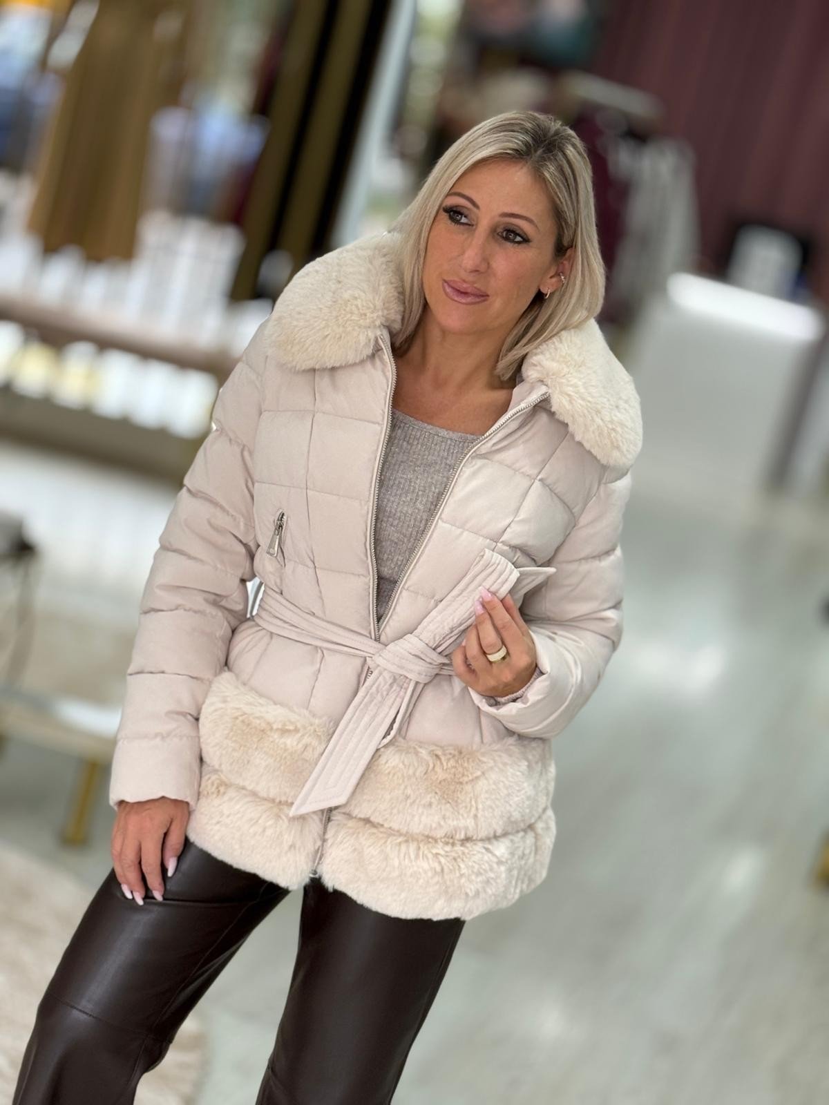 Kispo acolchoado com gola de pelo. Com presilhas e cinto. Bolsos laterais com fecho de correr metálico. Bainha com pelo. Forrado. Fecha na frente com fecho de correr metálico.