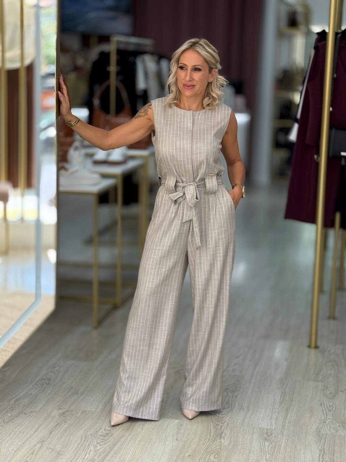 Macacão com risca diplomática. Decote redondo. Sem mangas. Com presilhas e cinto no mesmo tecido. Bolsos laterais e 2 bolsos falsos atrás. Fecha na frente com fecho de correr oculto pelo tecido.