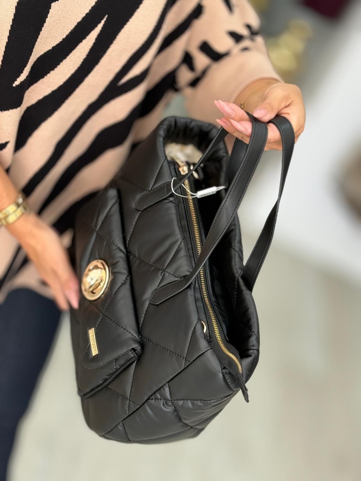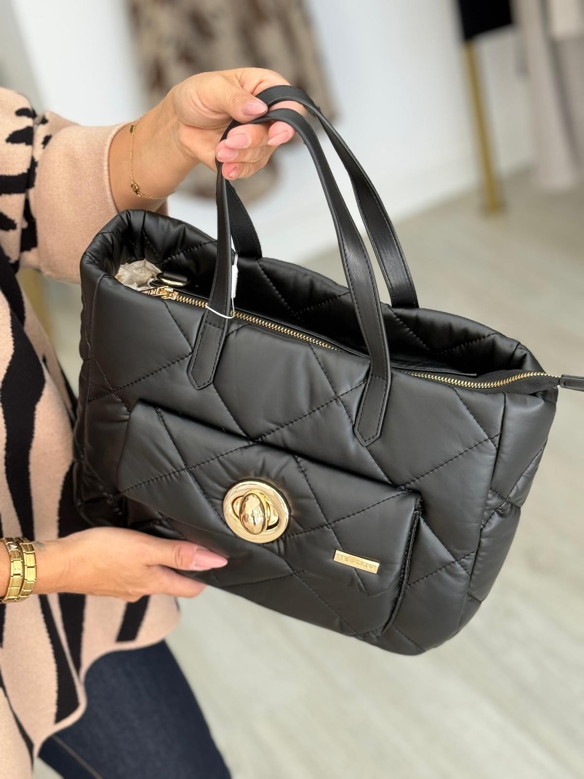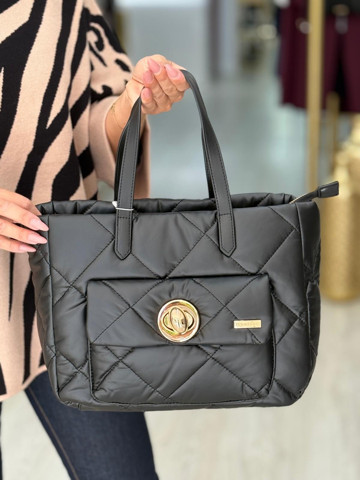 A Shopper PRIMADONA é a união perfeita de estilo e funcionalidade. Confeccionada em material sintético acolchoado, com costuras elegantes e um bolso frontal, esta mala destaca-se pelo seu fecho dourado proeminente, adicionando um toque de sofisticação.
