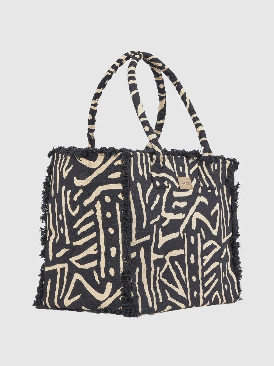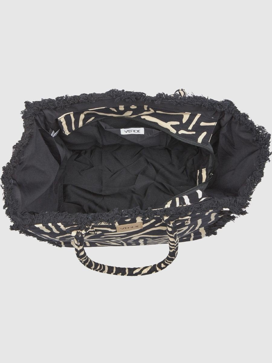 Mala de praia preta, com alça de mão. Interior em tecido liso preto.