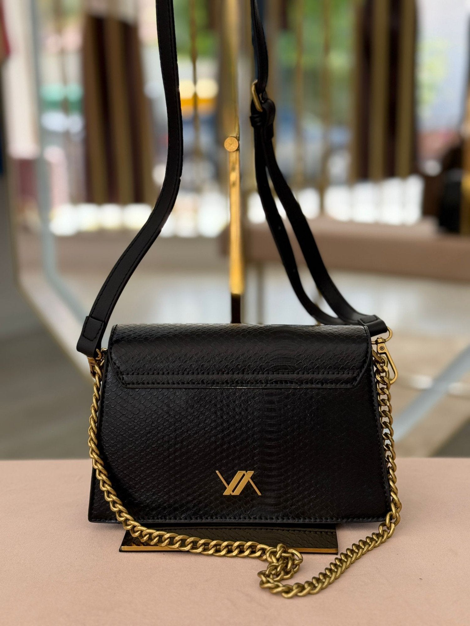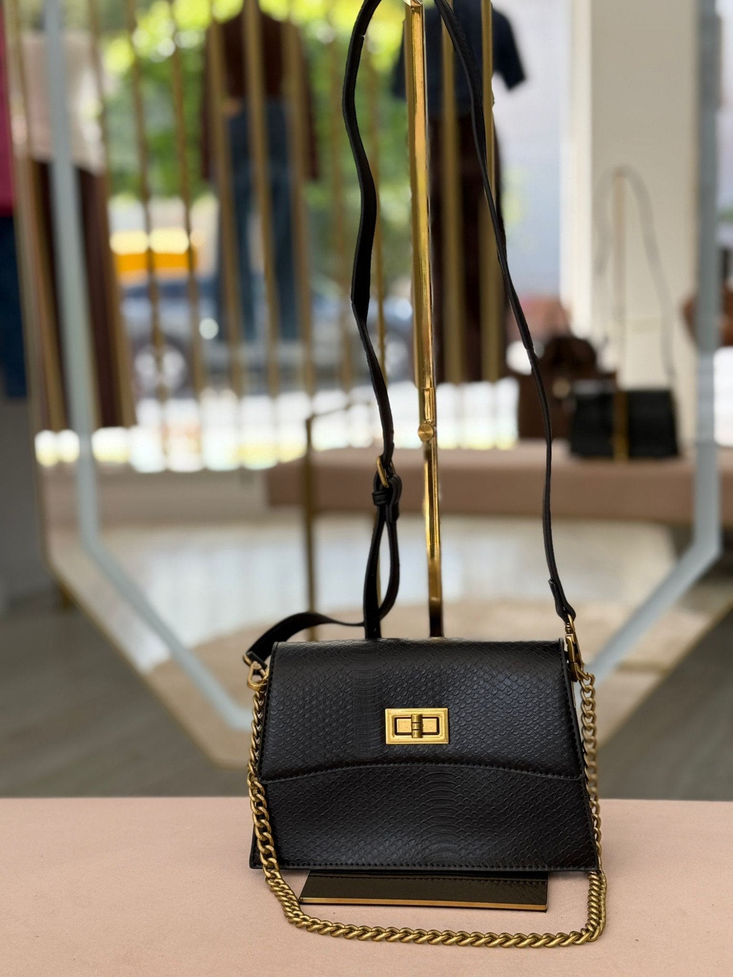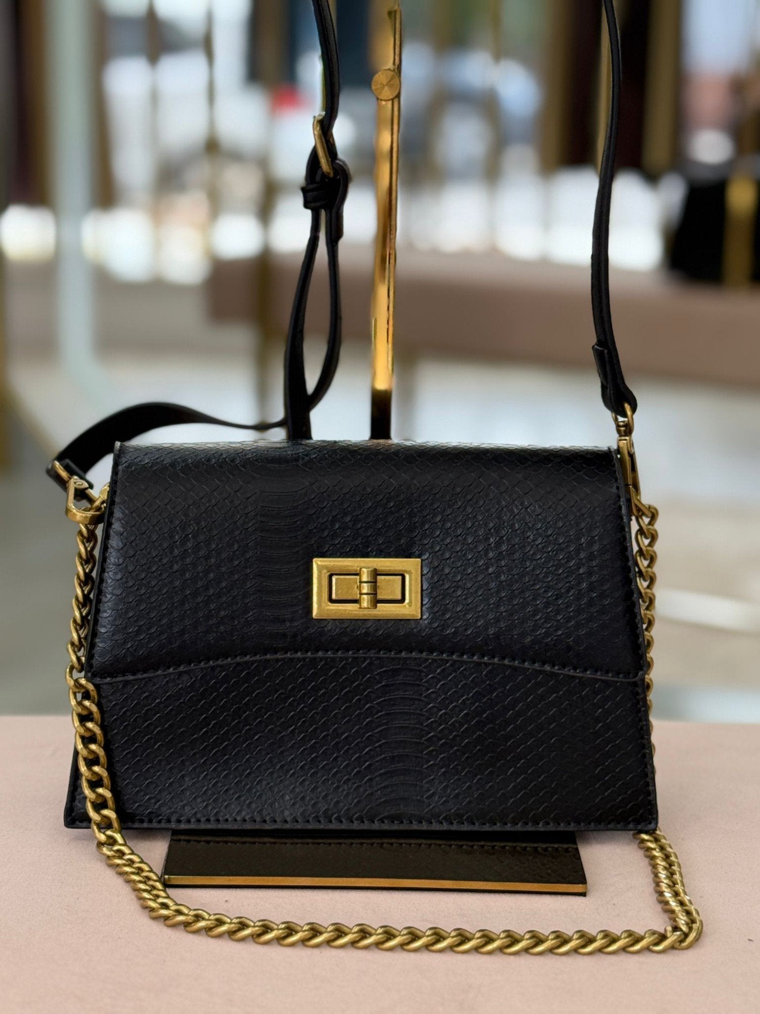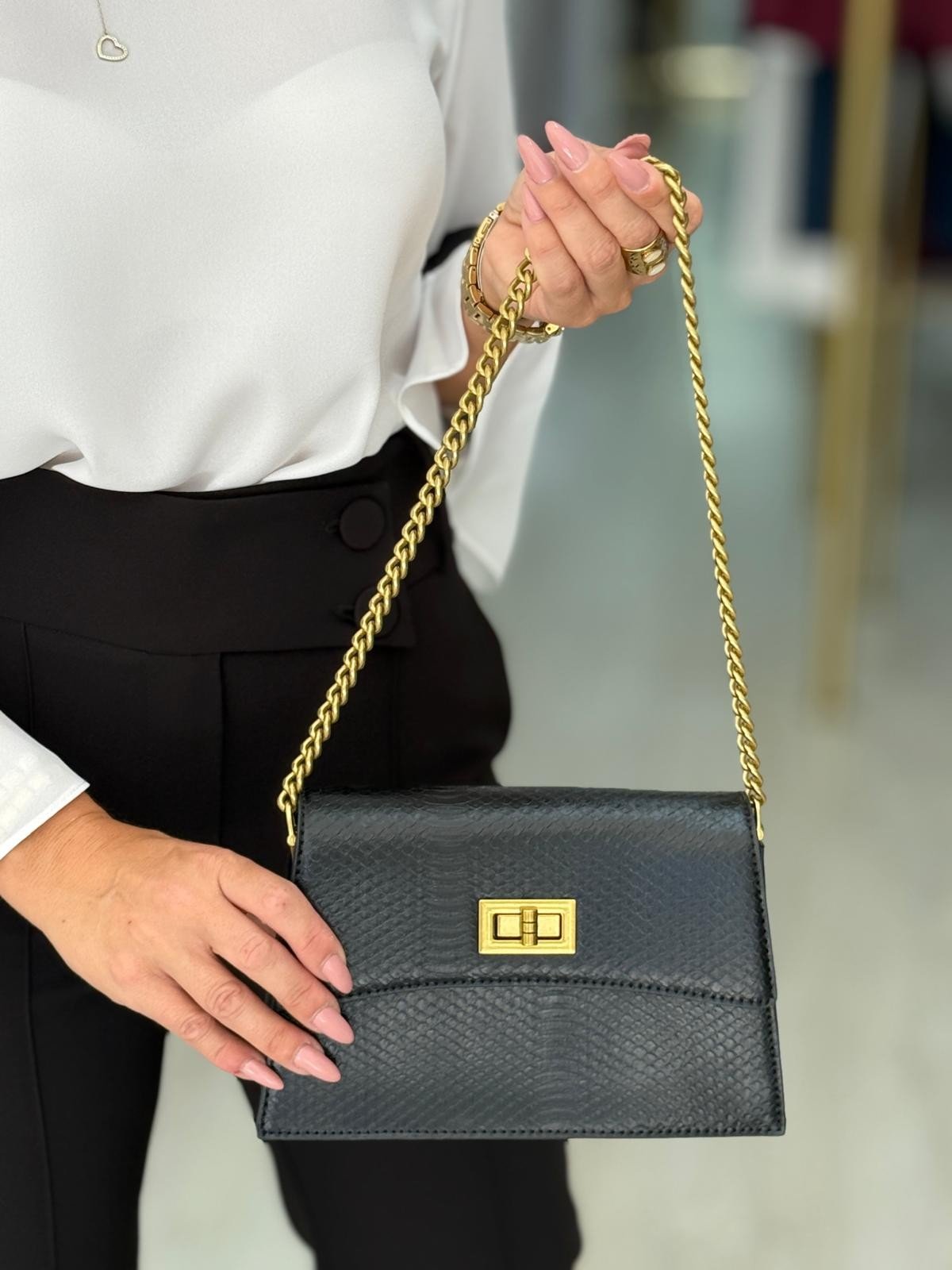 Mala pequena efeito pele, com corrente e alça. Interior com três divisões. Fechamento com aba e trinco.
