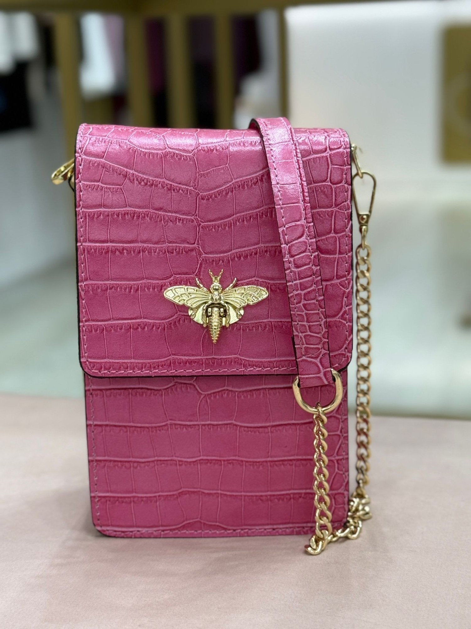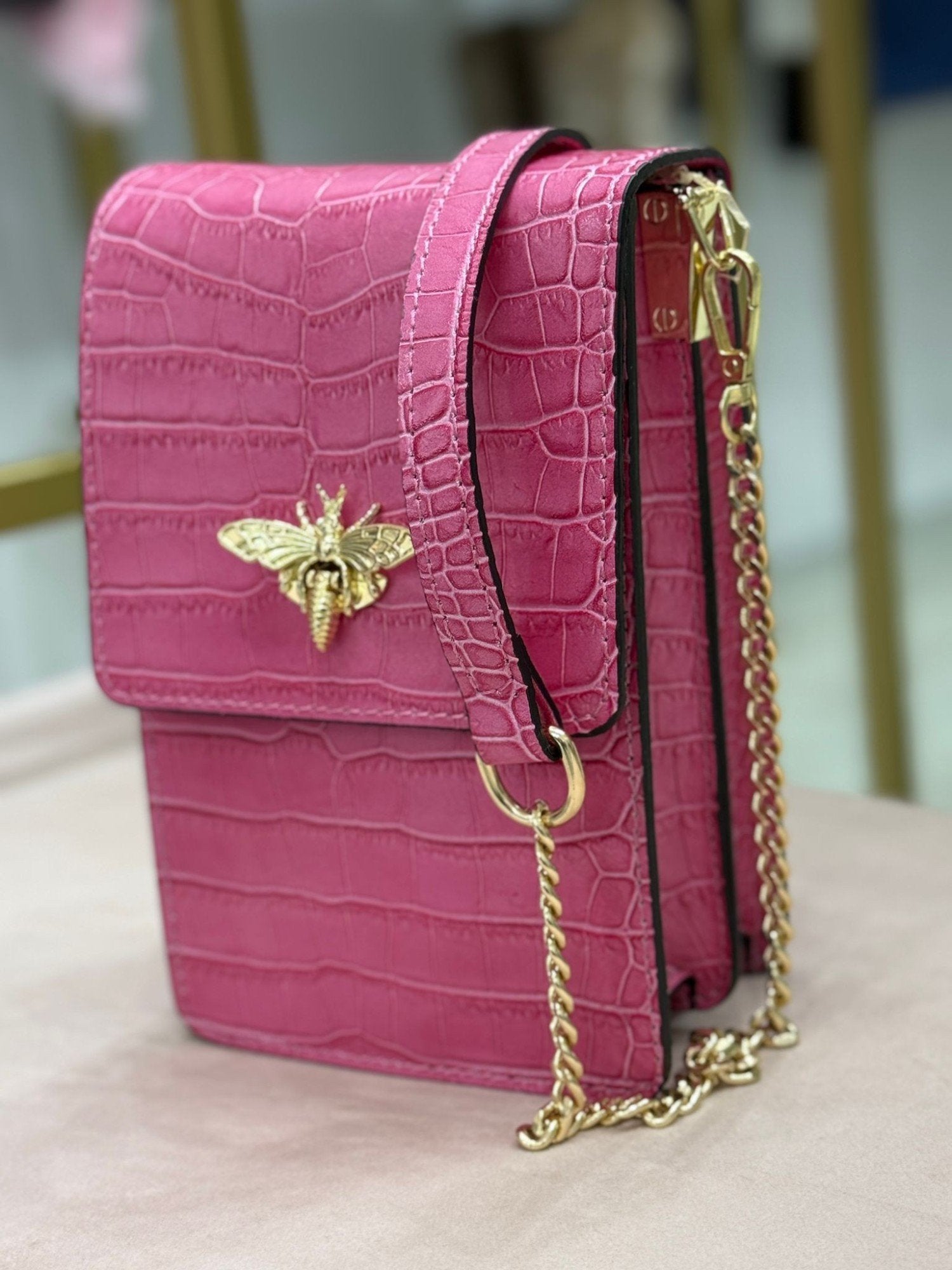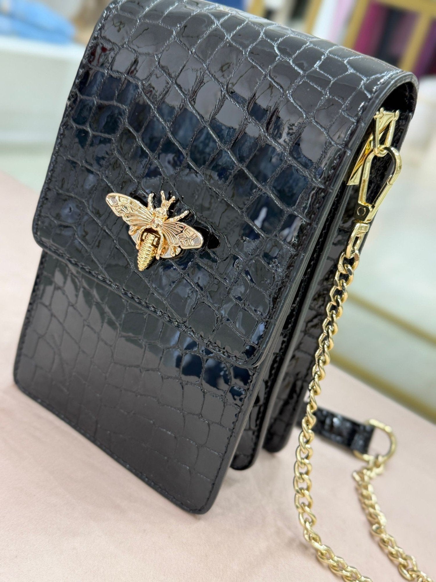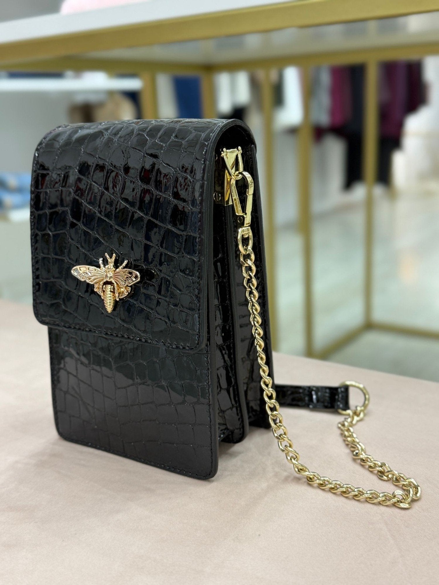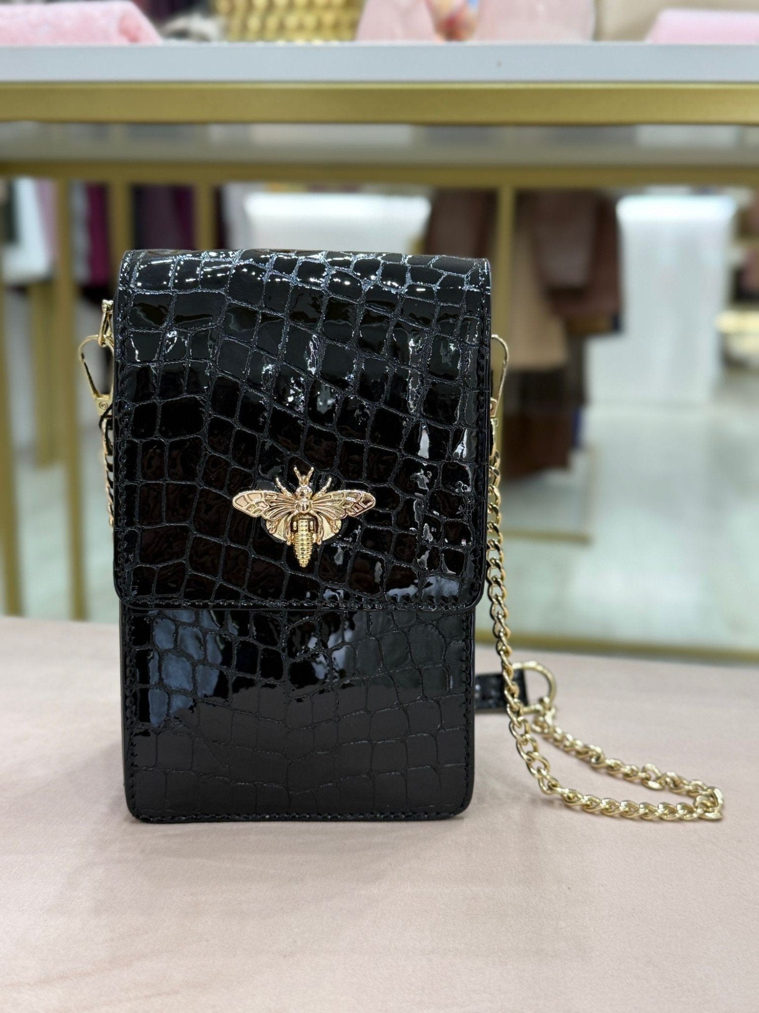 Mala efeito pele de crocodilo. Alça com corrente para colocar a tiracolo. Dois compartimentos no interior. Fecho em formato de mosca.