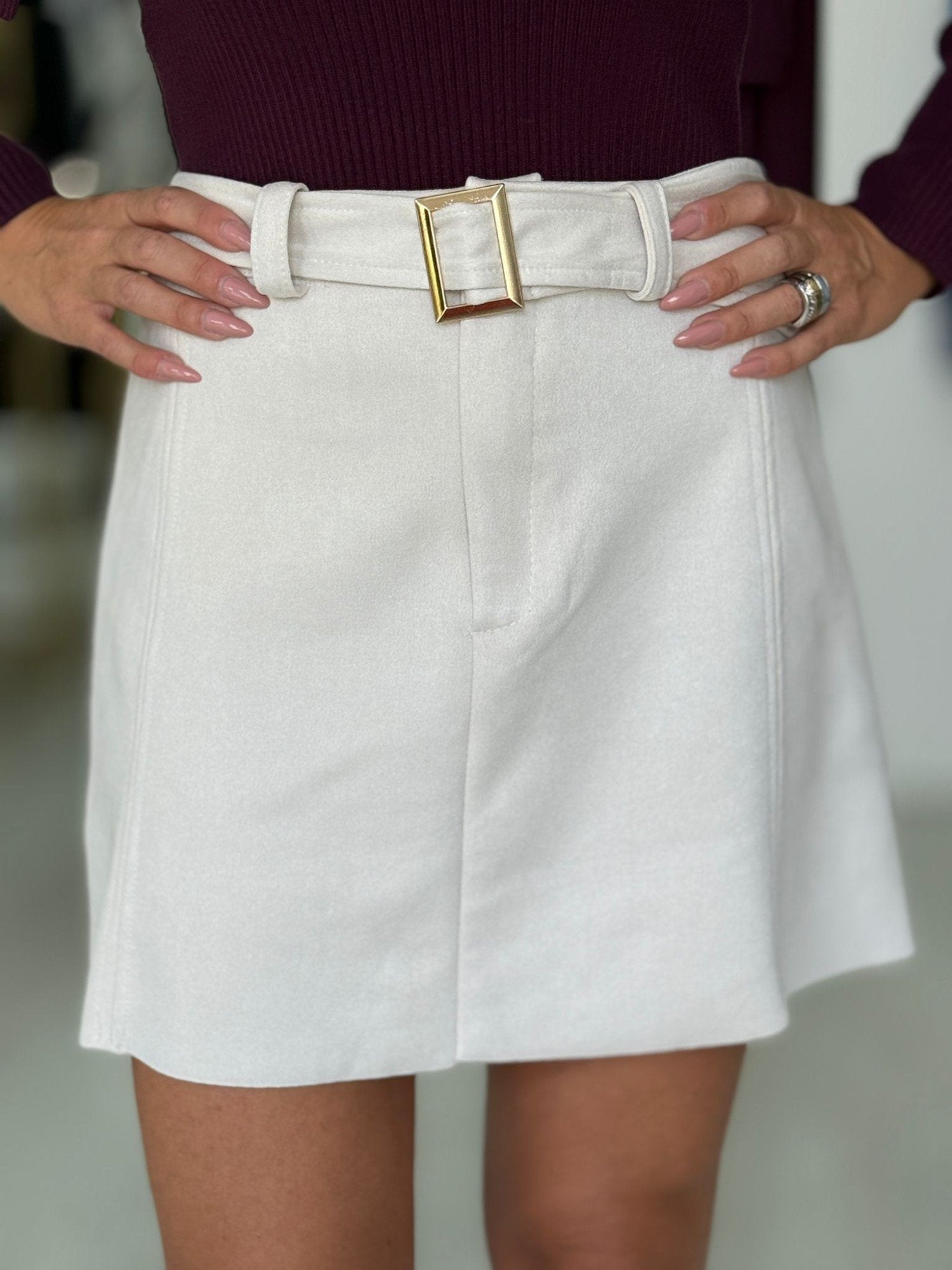 Mini saia em tecido tipo "pêssego" com presilhas e cinto. Fecha na frente com botão forrado, fecho oculto pelo tecido e cinto.