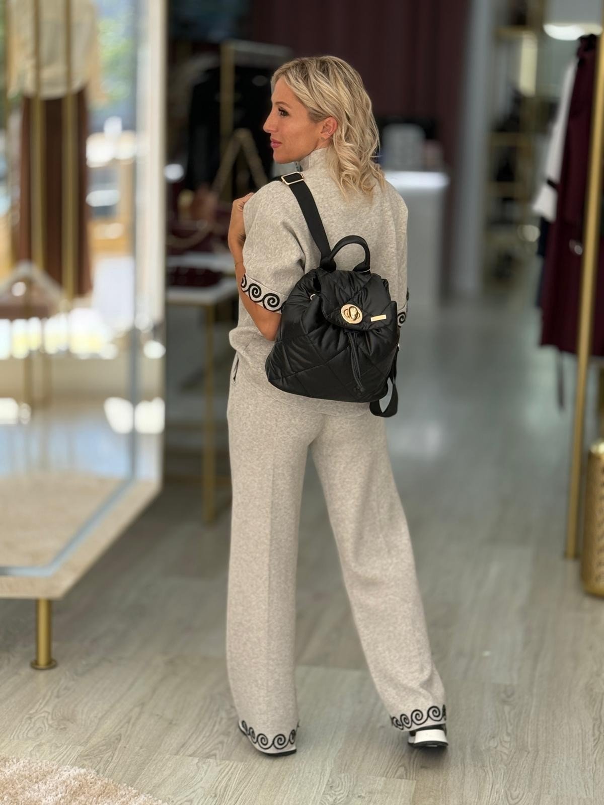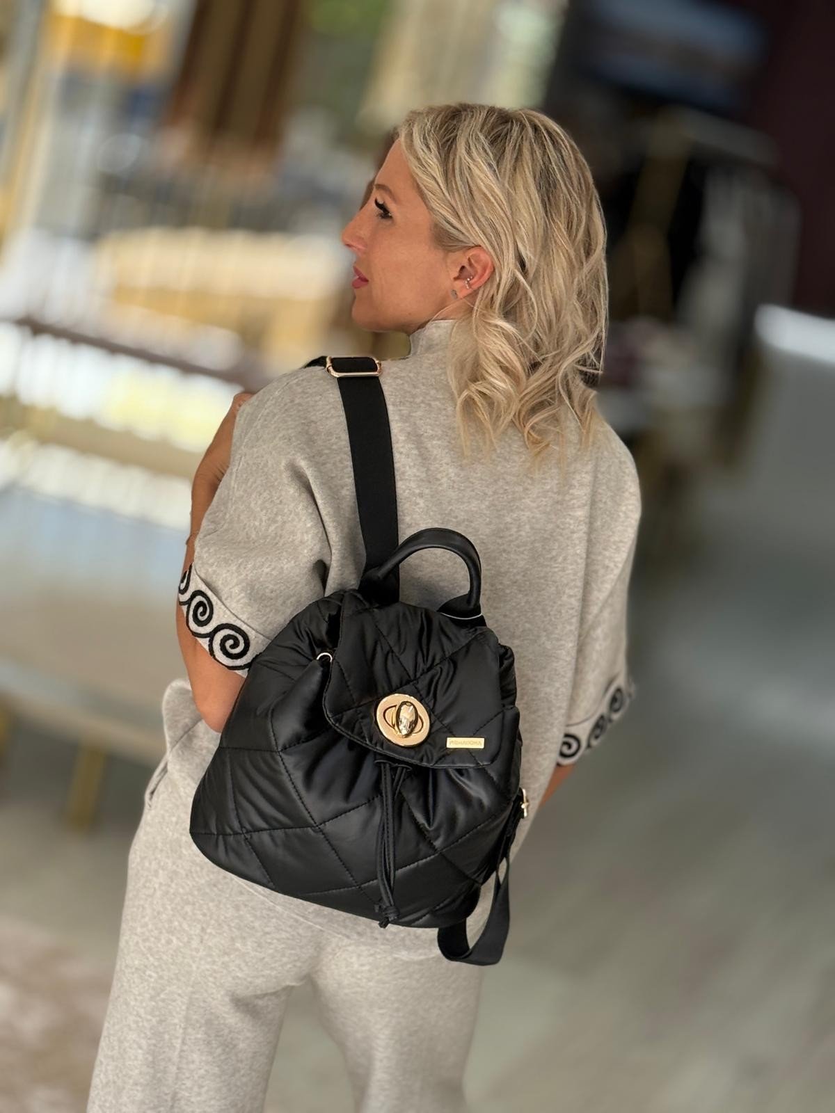 Cada detalhe foi pensado para realçar o seu estilo único: desde o seu material sintético acolchoado que confere uma textura agradável e um visual sofisticado, até as costuras cuidadosamente elaboradas que demonstram a qualidade superior do design. O grande destaque fica por conta da pala frontal que, além de garantir segurança, é adornada por um fecho grande dourado que adiciona um toque de opulência e modernidade. Fabricada com 100% PU na parte externa, é resistente e fácil de manter, enquanto o forro interno de 100% Poliéster assegura a proteção e organização dos seus pertences. Seja para um dia de trabalho, um passeio pela cidade ou um evento especial, esta mochila é a escolha certa para quem não dispensa sofisticação e funcionalidade!